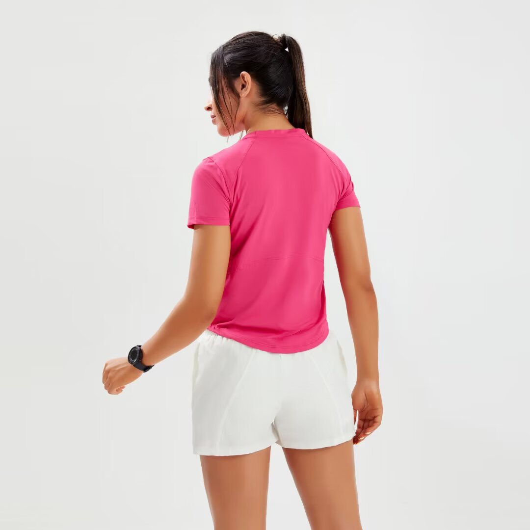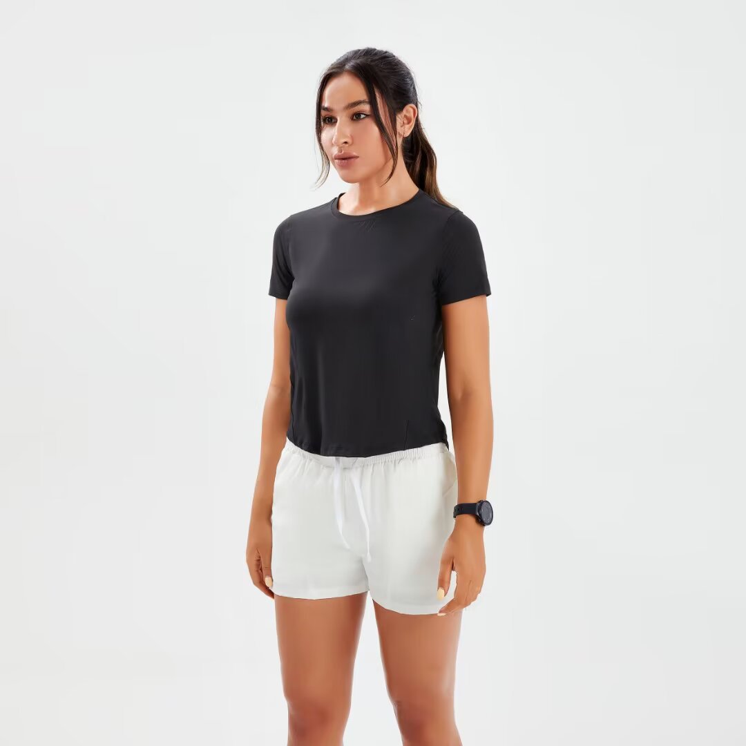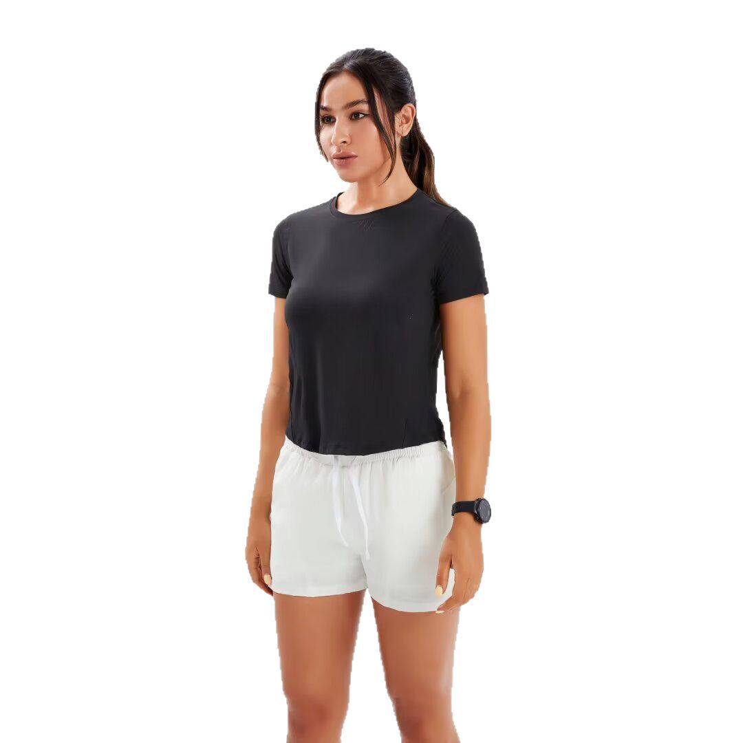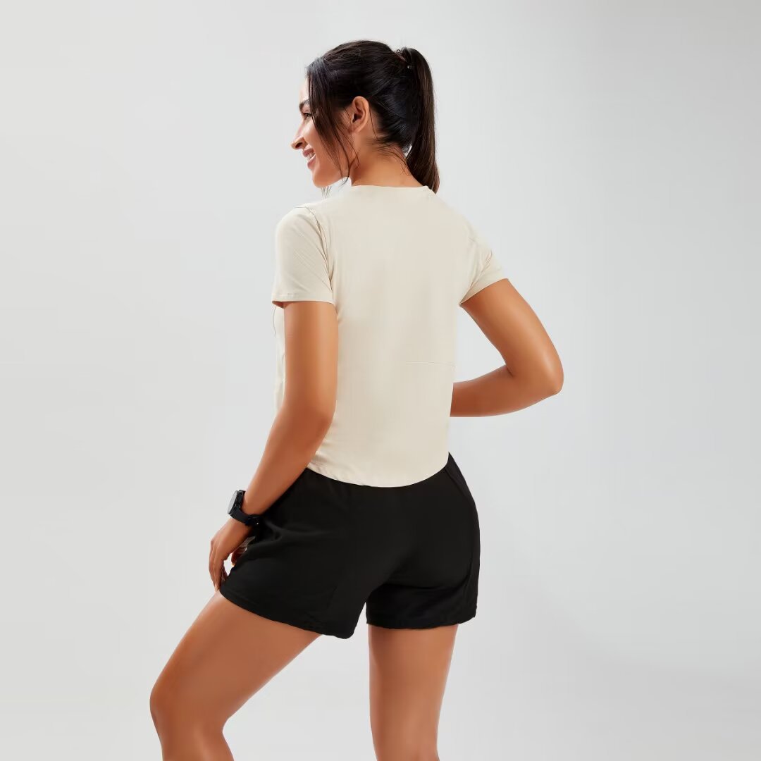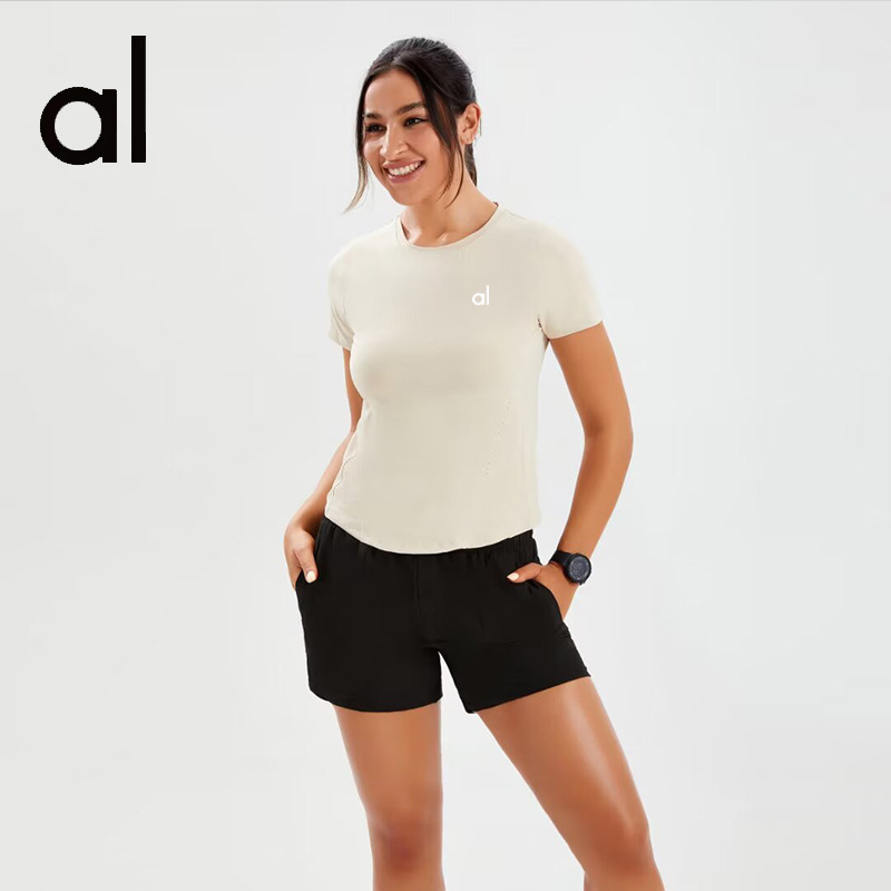 브랜드 단색 반팔 여성용 라운드넥 속건 런닝 피트니스 티셔츠 타이트핏 허리 슬리밍 스포츠 요가 여름 여성 상의스토어 가기