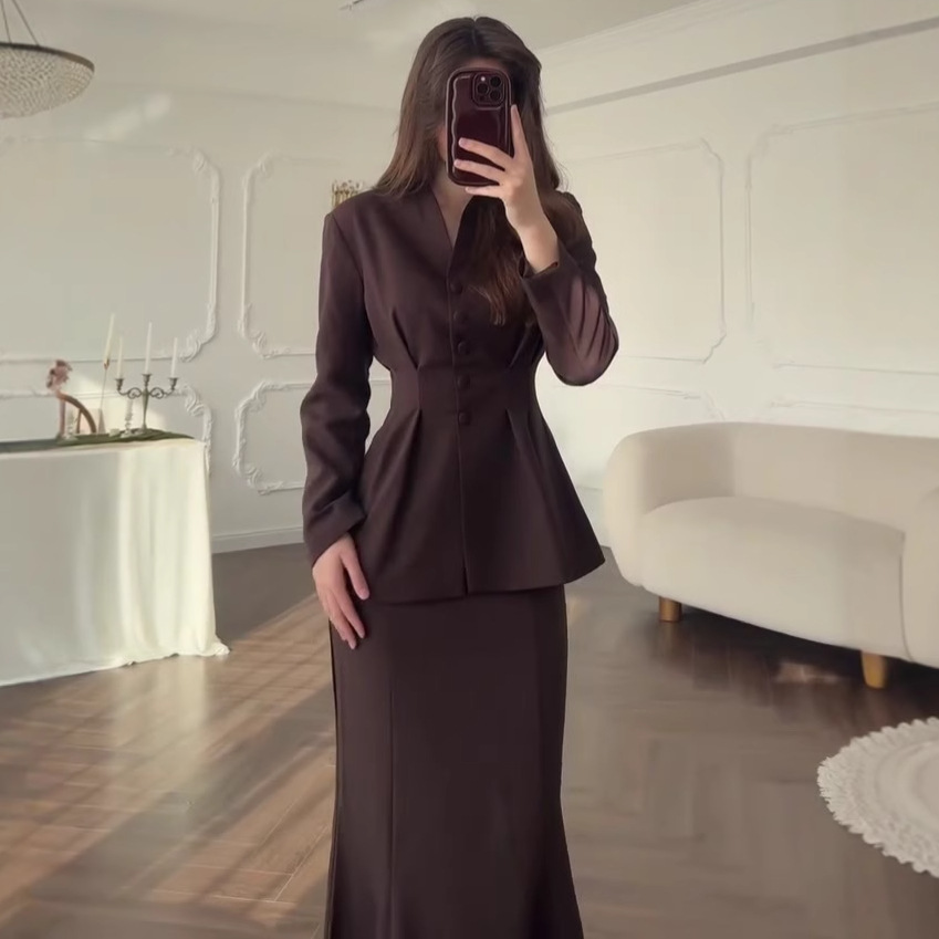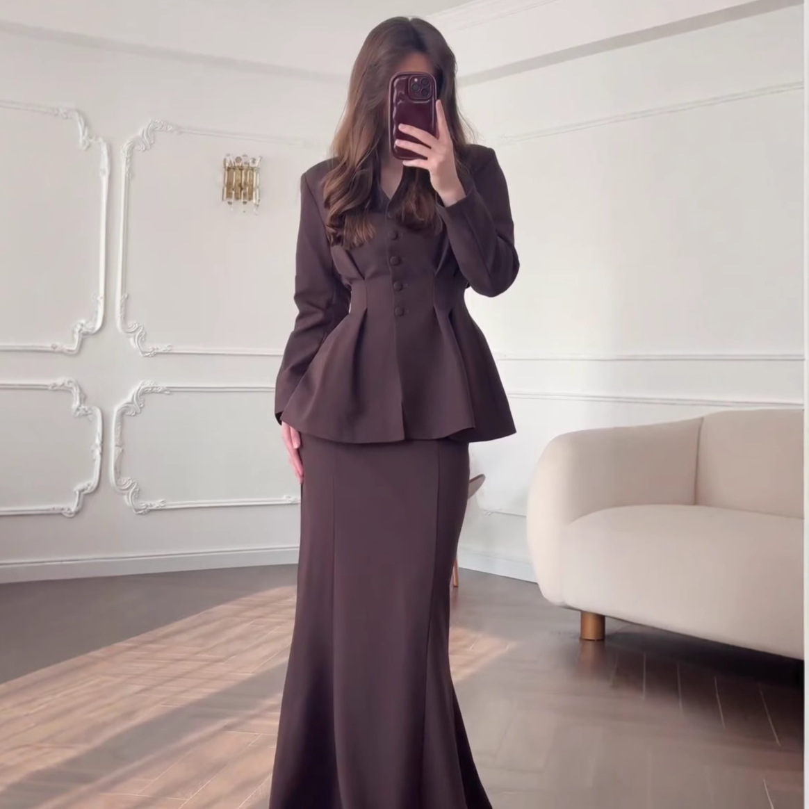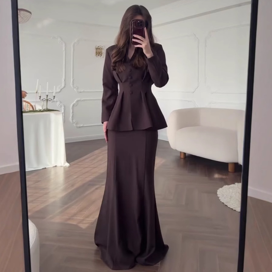유럽과 미국의 2025 가을 새로운 허리 슬리밍 버튼 긴 소매 코트 우아한 피쉬 테일 엉덩이 원피스 세트 여성 의류스토어 가기
