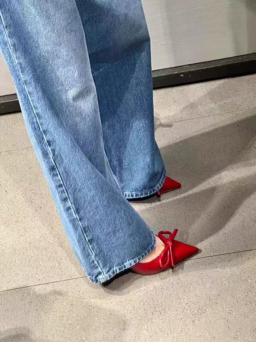 2025 새로운 여름 여성 신발 빨간색 Baotou Bow 얇은 하이힐 뾰족한 패션 대외 무역 하이힐 여성 신발