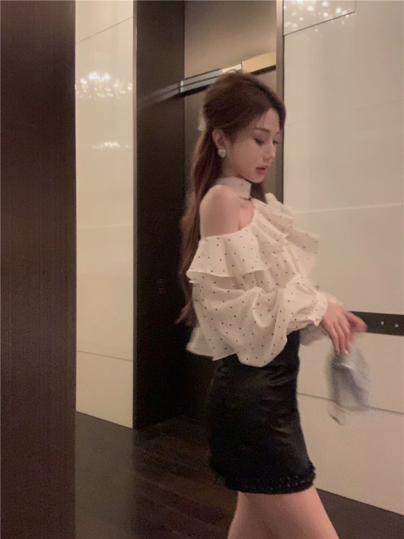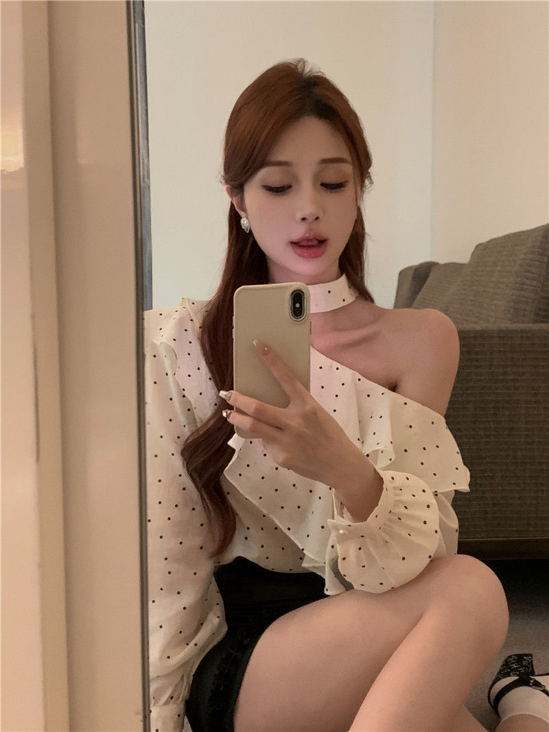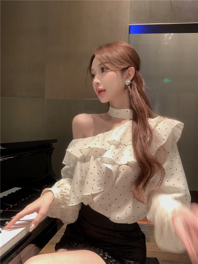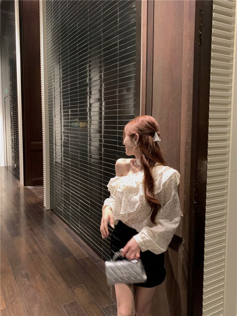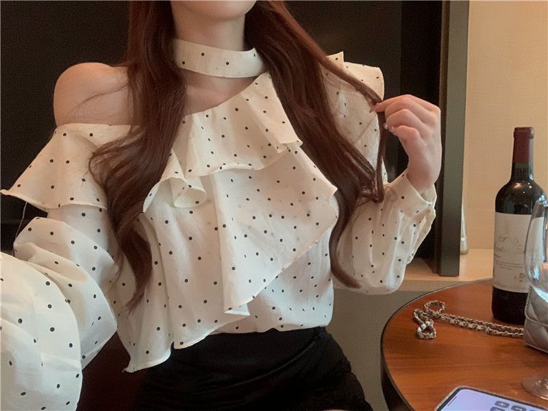 2025 봄 프랑스 부드러운 스타일 날씬한 어깨 웨이브 포인트 러플 셔츠 여자 여름 틈새 올 매치 웨스턴 스타일 탑스토어 가기
