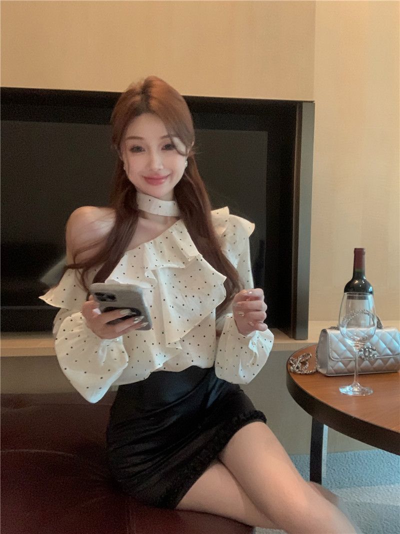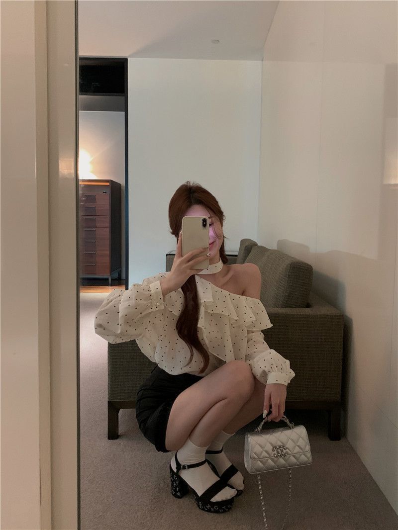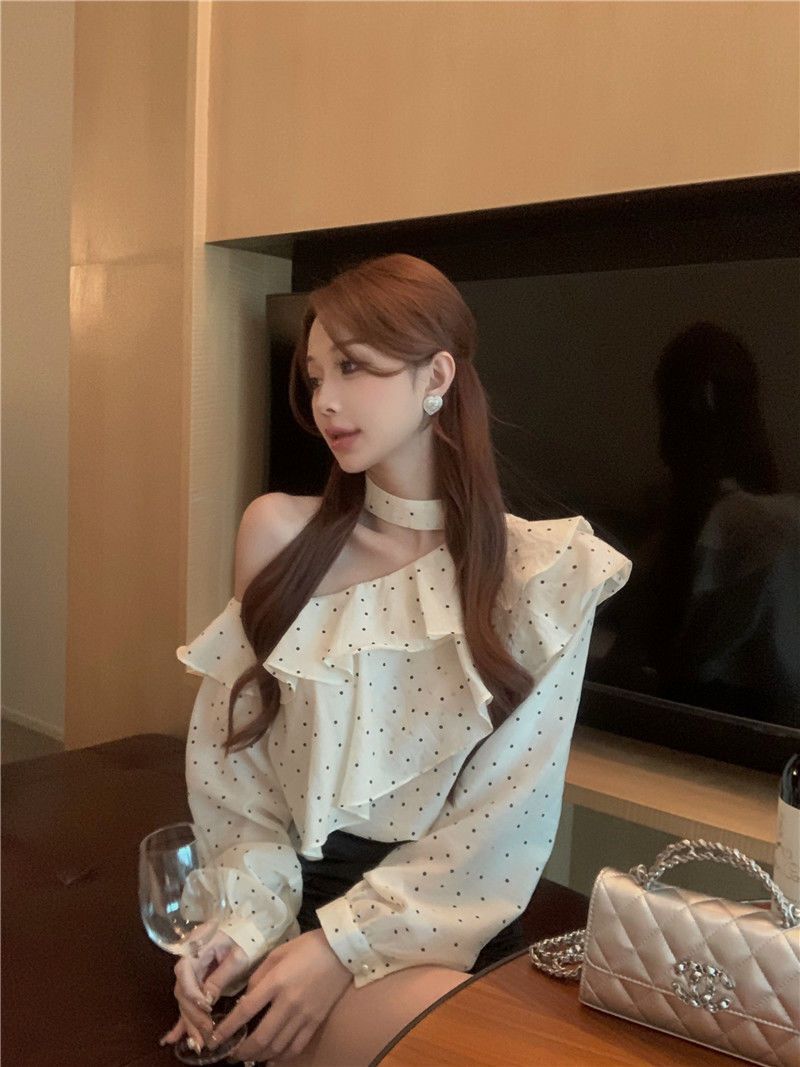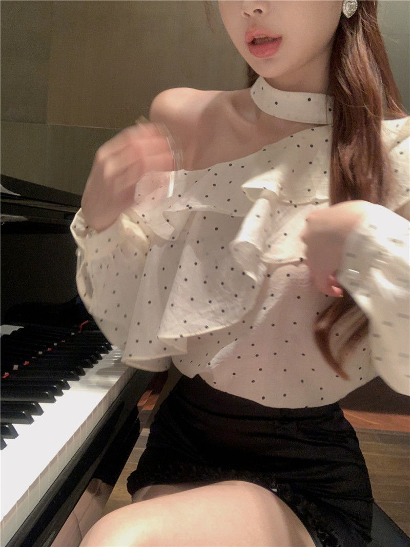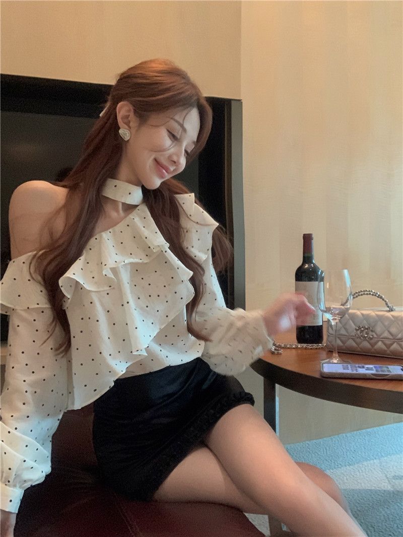 2025 봄 프랑스 부드러운 스타일 날씬한 어깨 웨이브 포인트 러플 셔츠 여자 여름 틈새 올 매치 웨스턴 스타일 탑스토어 가기