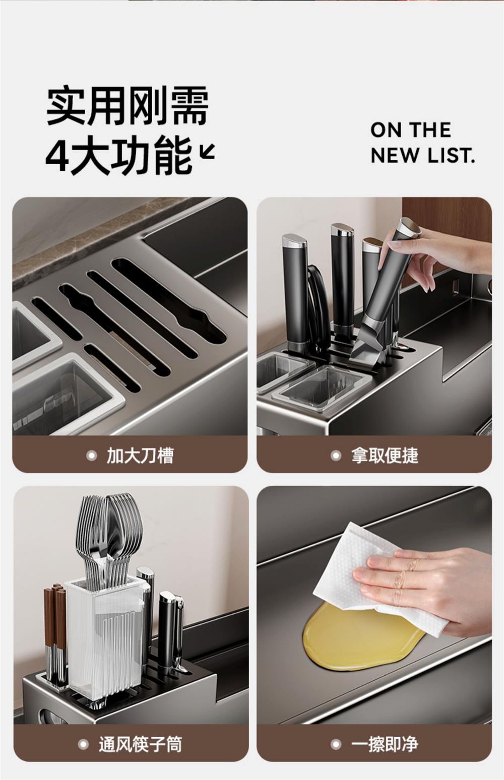 • 스테인레스 젓가락통 [건그레이] 수납공간 3개, 2단 + 물받이 + 칼꽂이 + 고리 4개
