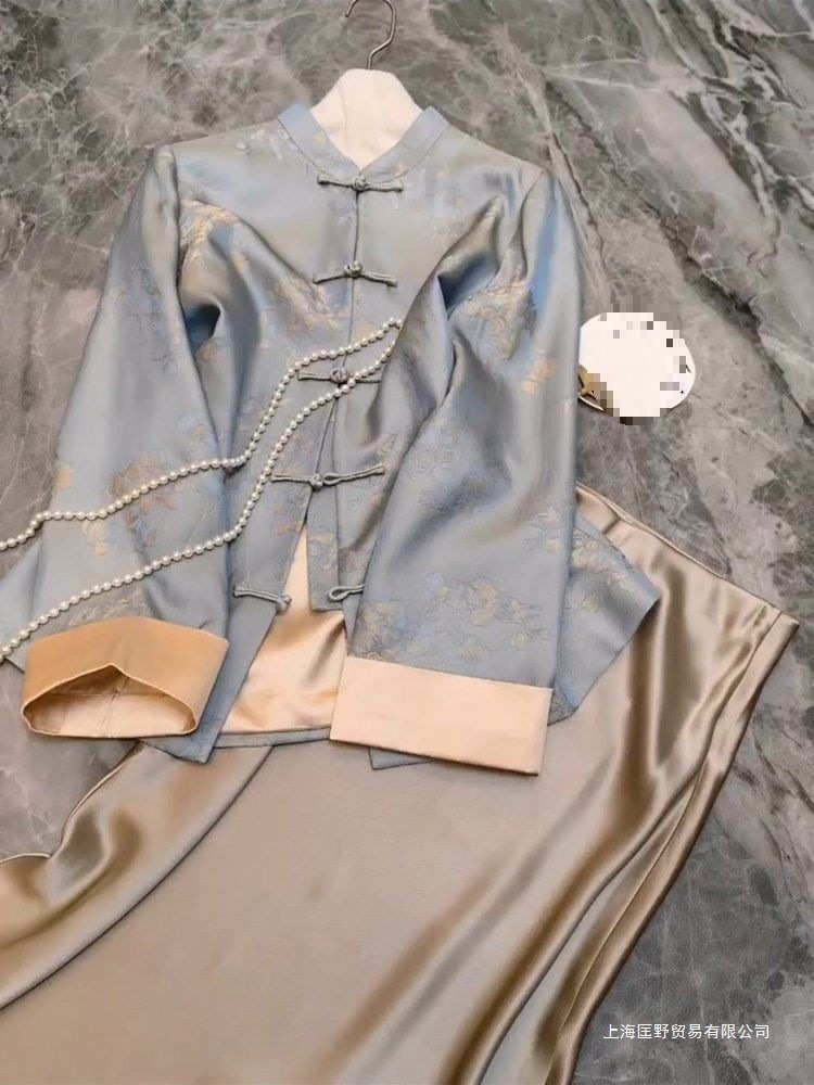 새로운 중국 스타일 버클 대비 셔츠 선 스타일 부드러운 스타일 우아한 슬림 스커트 라이트 성숙한 투피스 세트 여성의 봄