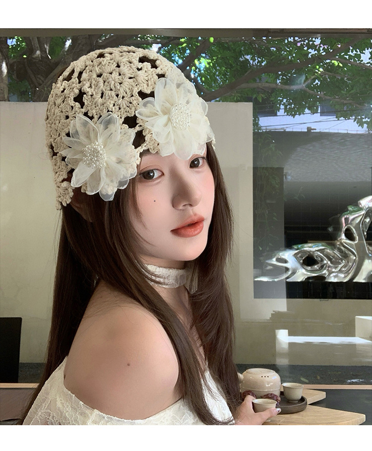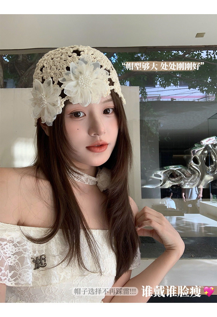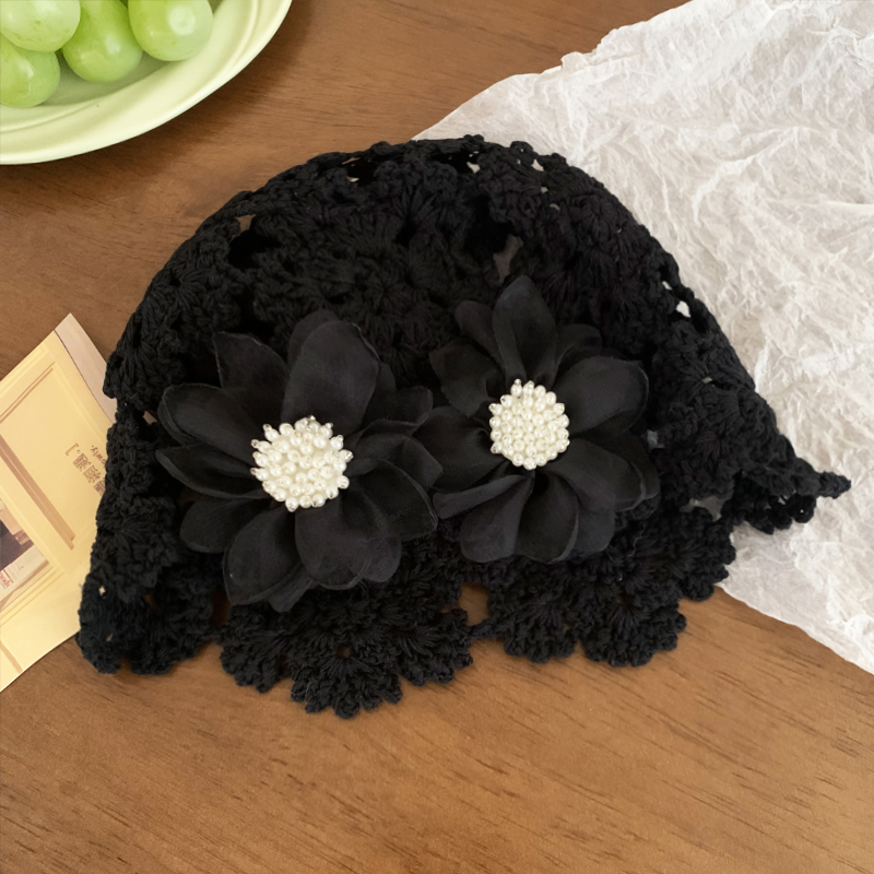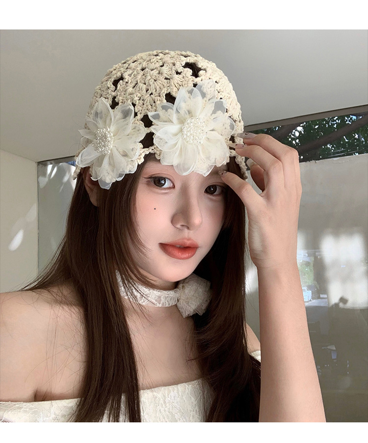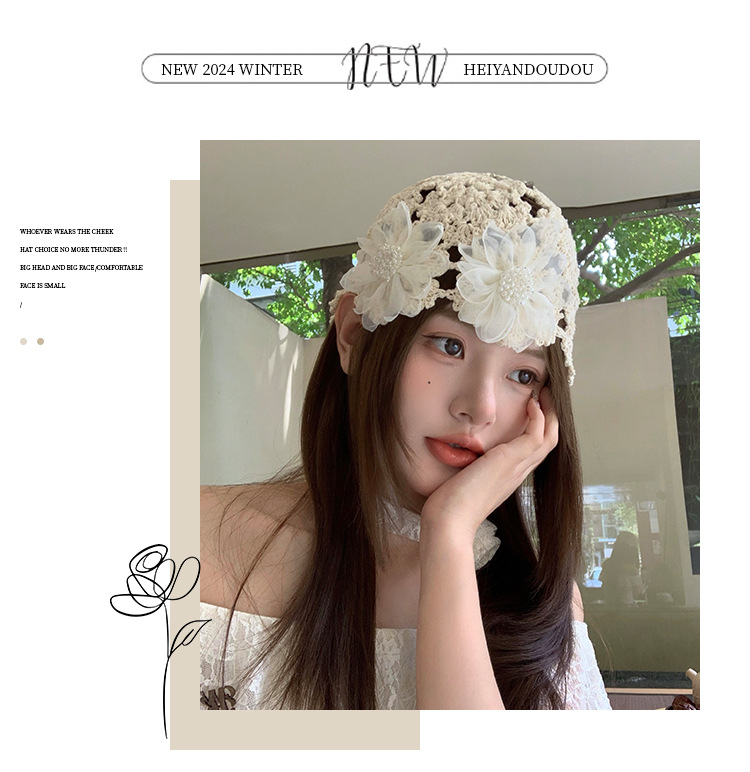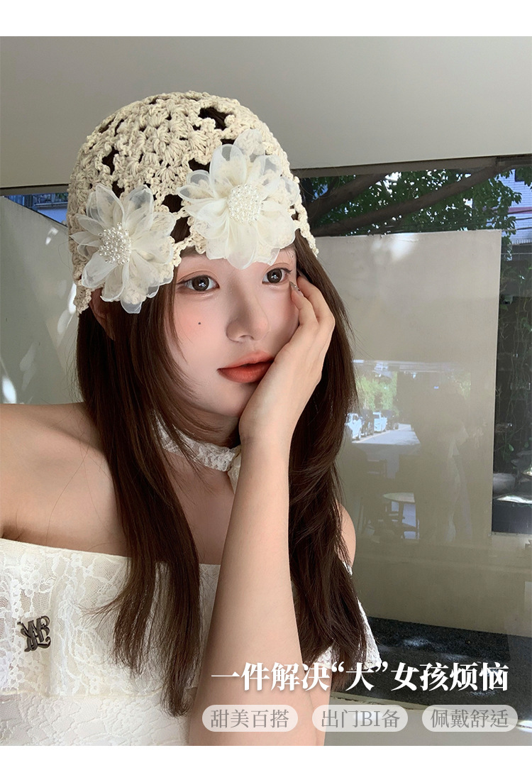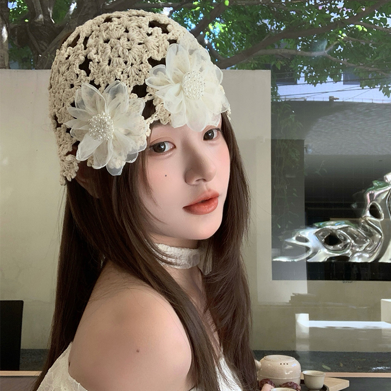 패션 수제 꽃 풀오버 모자 여성의 2025 년 새로운 올 매치 일본 크로 셰 뜨개질 빈 얼굴 작은 바오 터우 모자