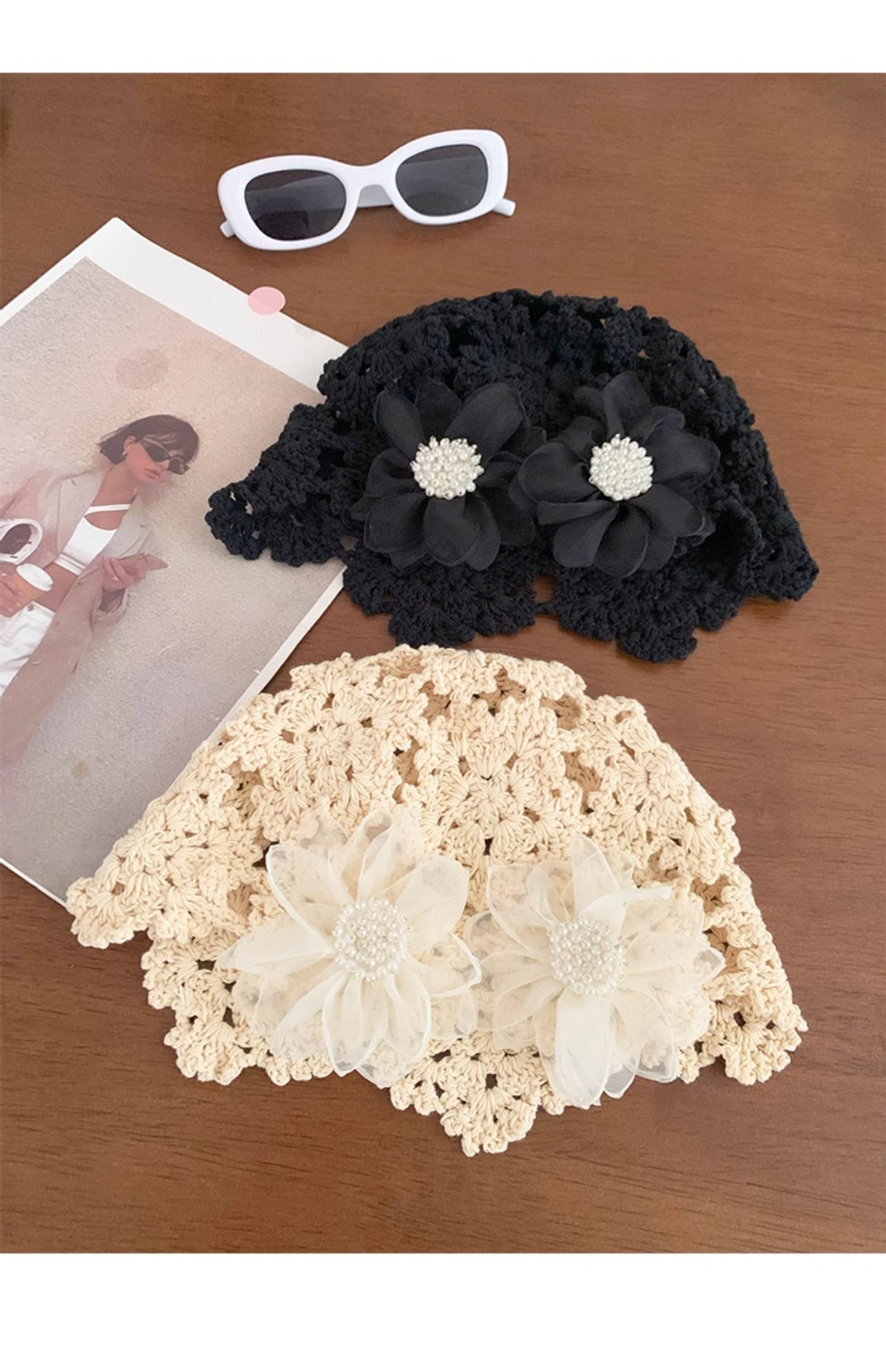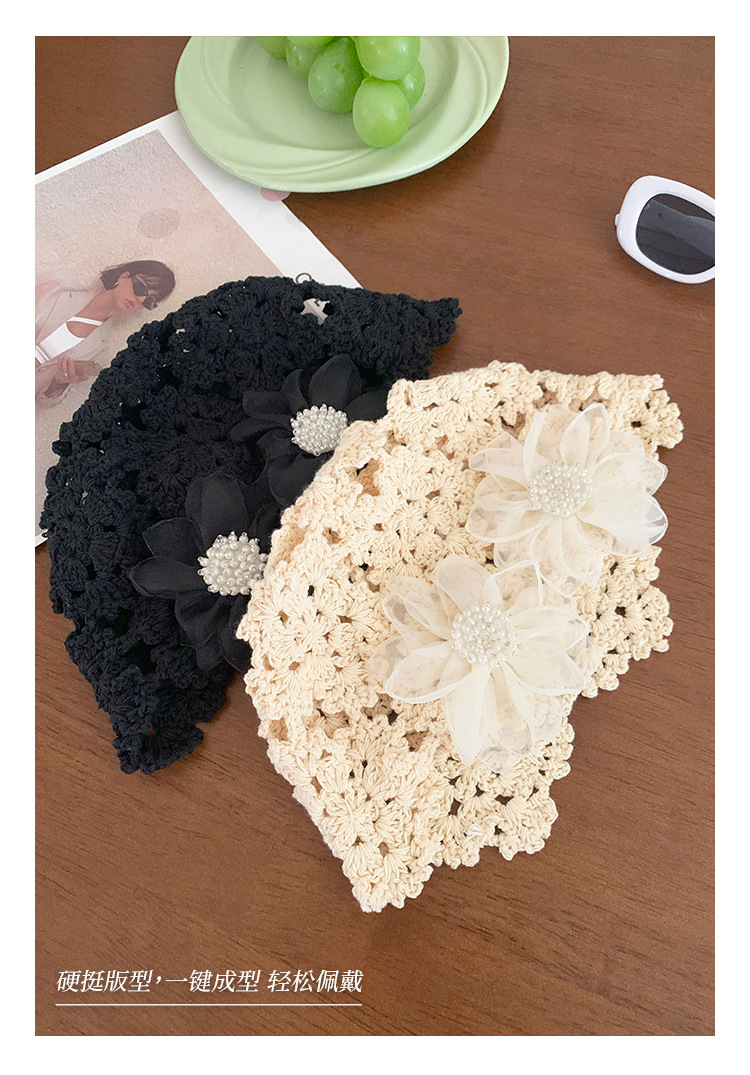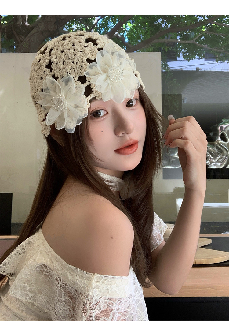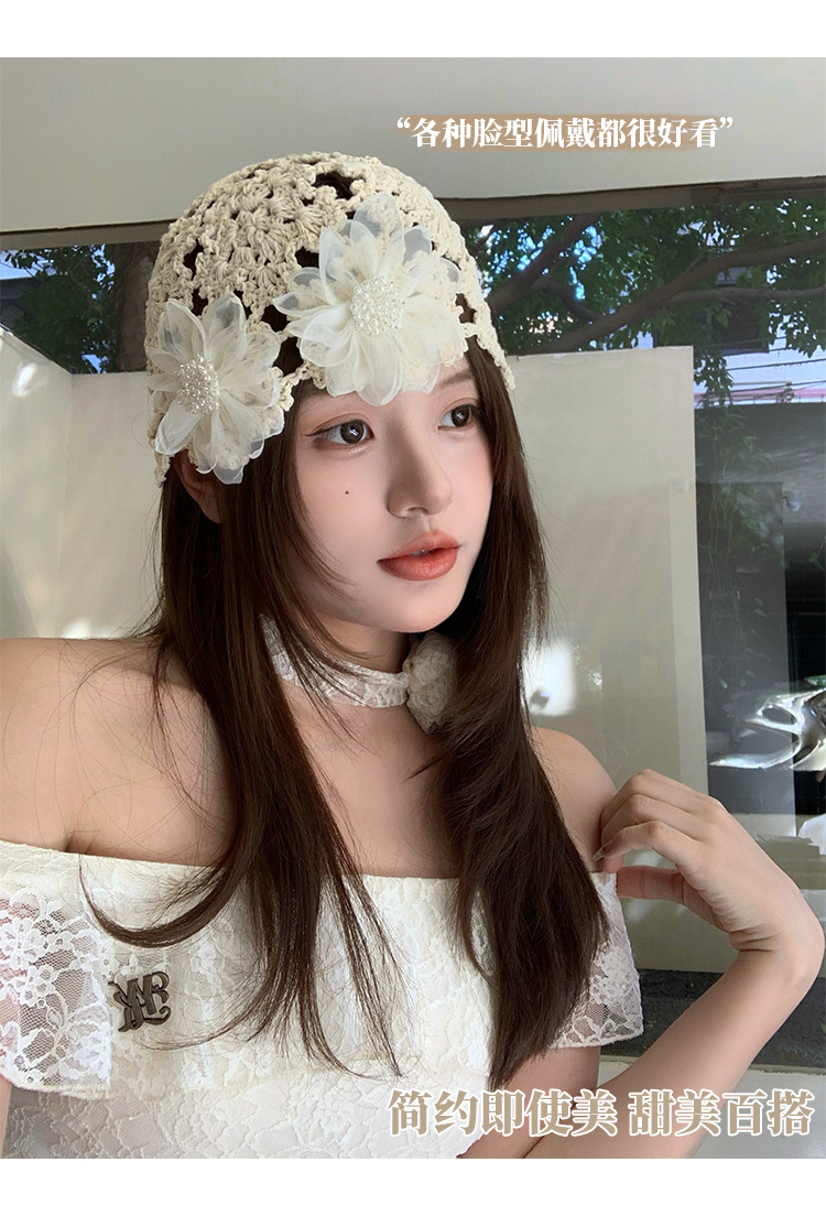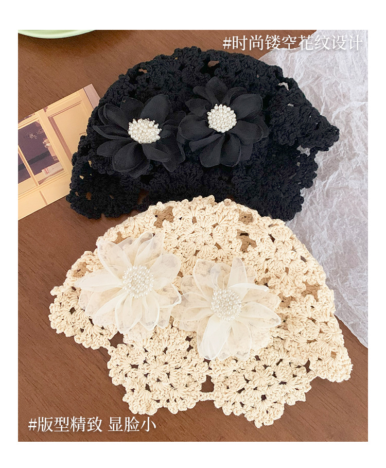 패션 수제 꽃 풀오버 모자 여성의 2025 년 새로운 올 매치 일본 크로 셰 뜨개질 빈 얼굴 작은 바오 터우 모자
