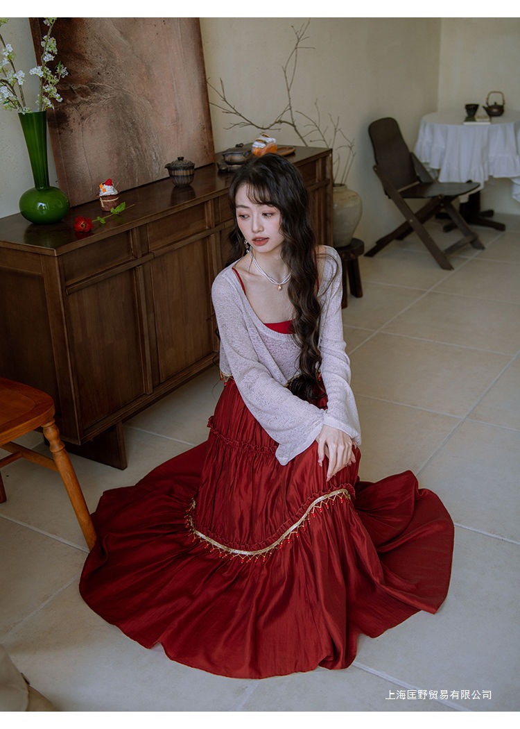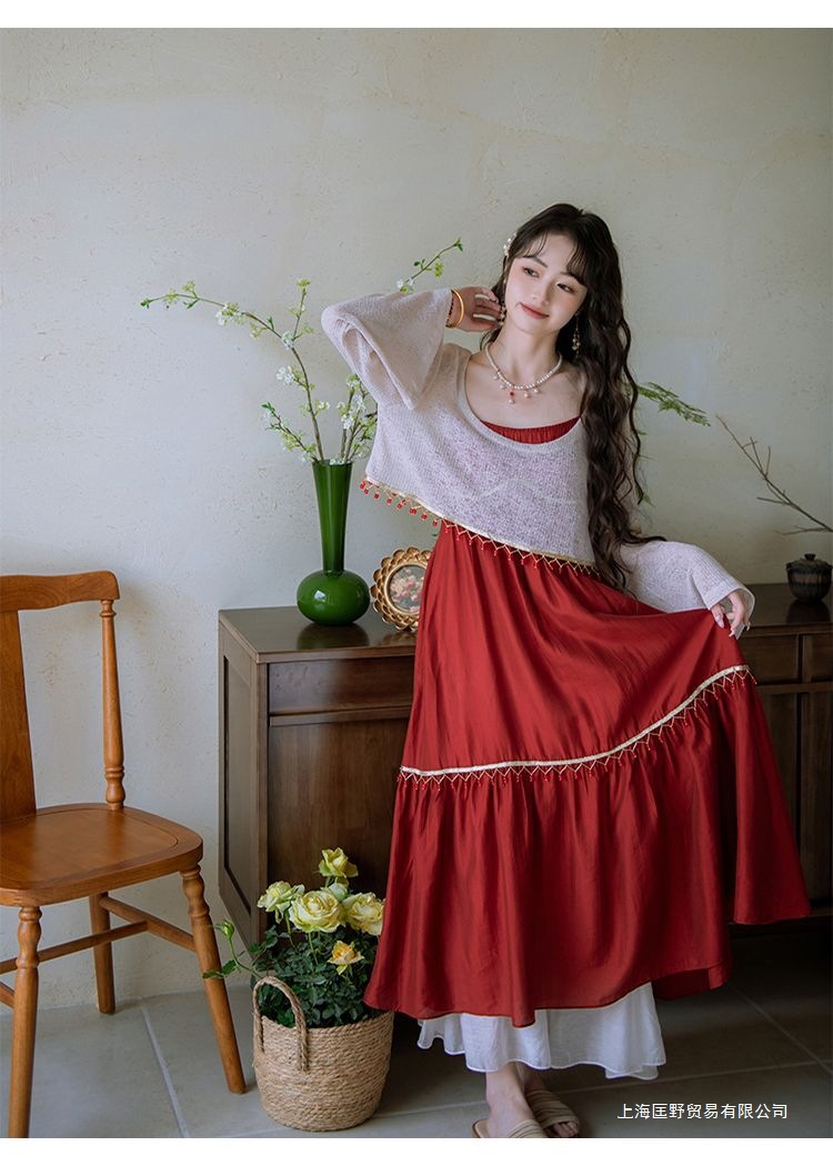 여름 새로운 스타일 외계인 소녀의 국가 스타일 니트 블라우스 대형 스윙 스커트 국가 스타일 세트 조끼 치마 긴 치마스토어 가기