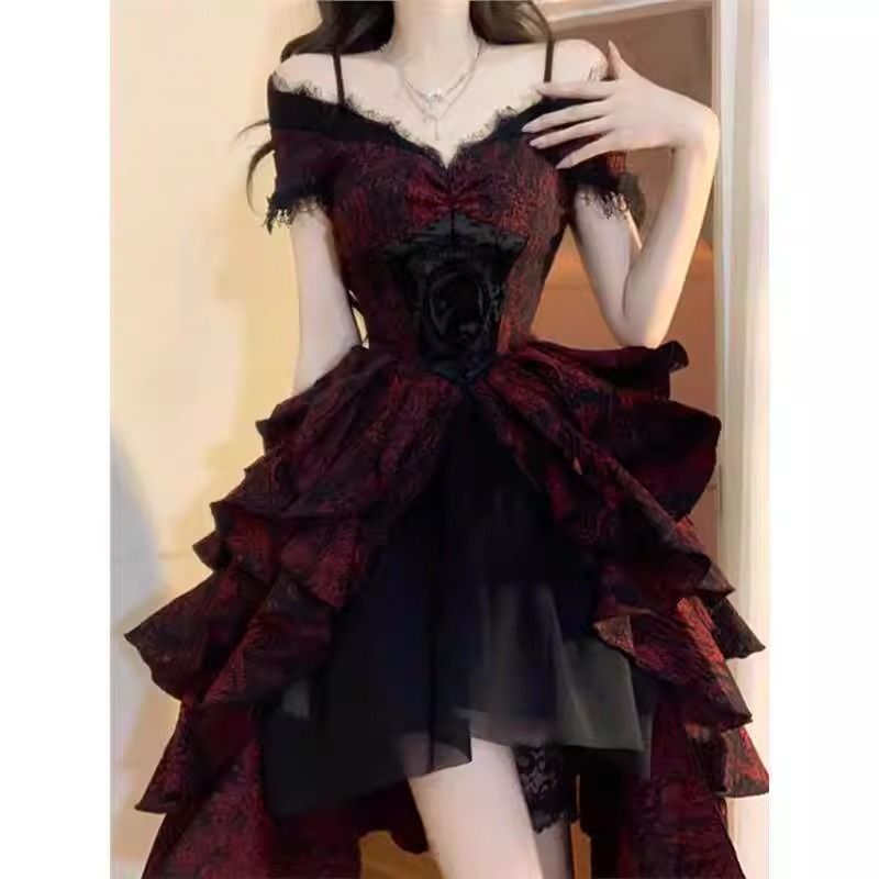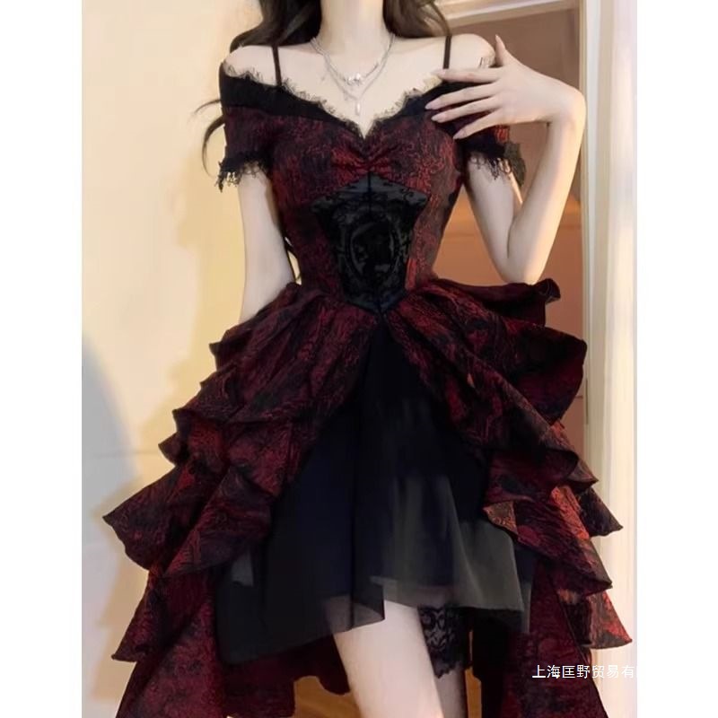 프랑스 스타일 블랙과 레드 자카드 물결 원피스 로리타 라이트 럭셔리 중공업 어깨 퍼피 공주 원피스스토어 가기