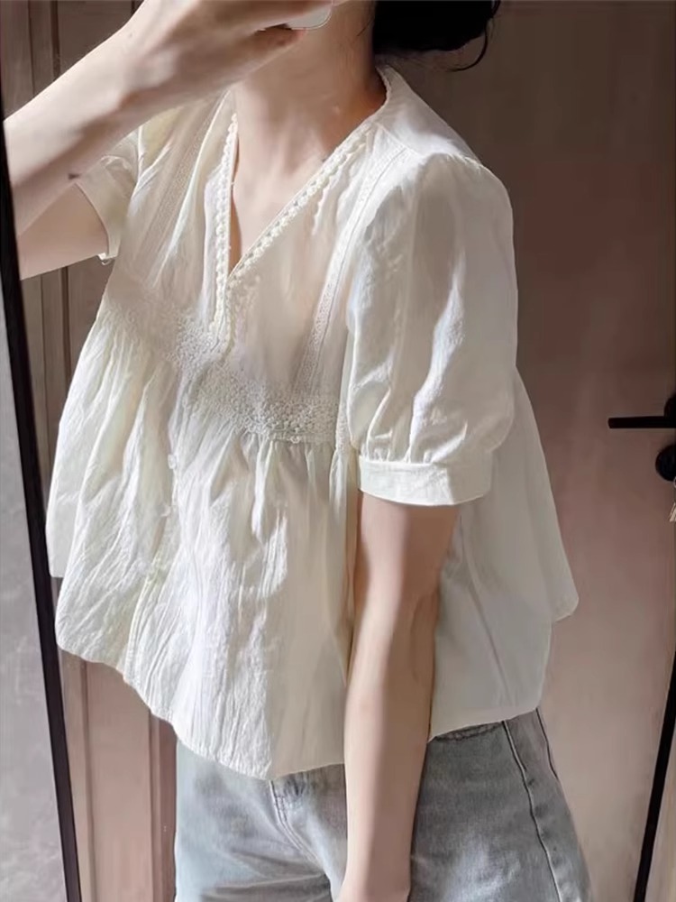 프랑스 화이트 V 넥 반팔 셔츠 여성 디자인 센스 작은 인형 셔츠 퍼프 소매 최고 신선한 여름 원피스스토어 가기