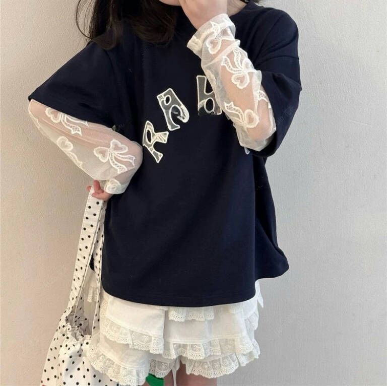 여성 한국식 레이스 스플라이스 슬리브 티셔츠 2025 여름 새로운 어린이 트렌디 탑