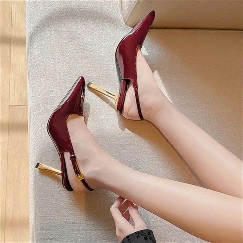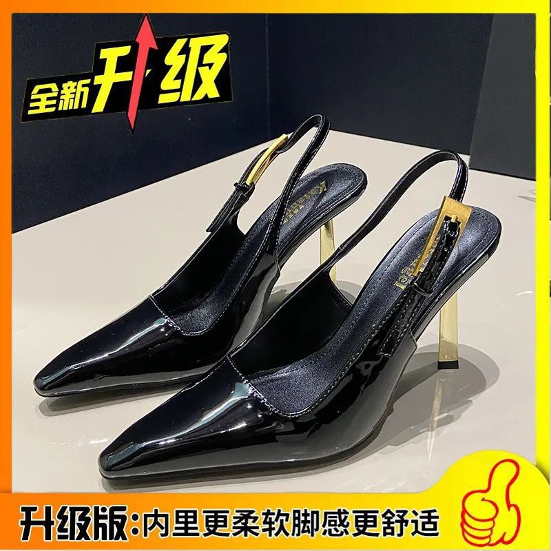 여성용 백 스트랩 하이힐 2024 메탈 스틸레토 힐 스몰 스퀘어 토 버클 스트랩 섹시 블랙 페이턴트 가죽 토 샌들