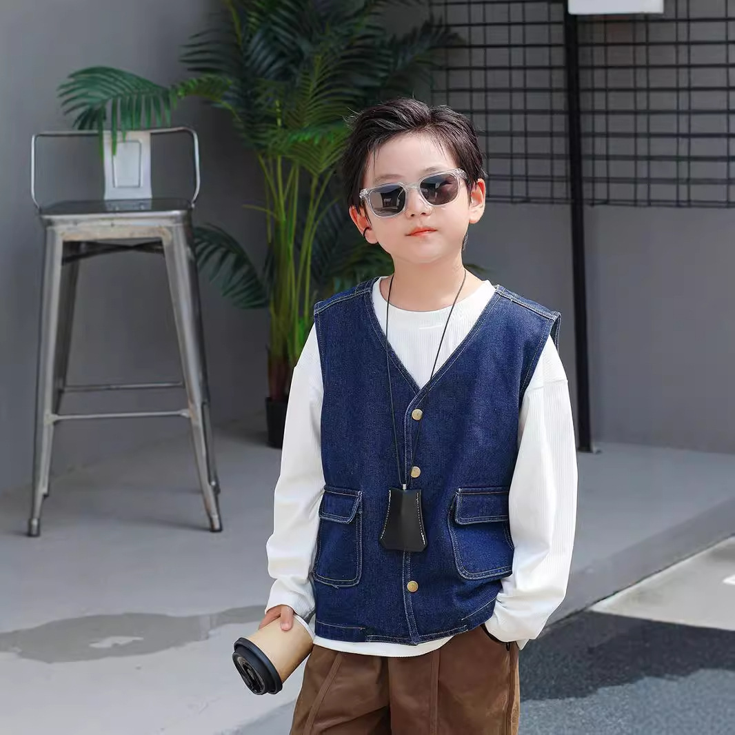 어린이 조끼 2024 가을 새 한국 잘 생긴 아기 탑 서양식 3 차원 포켓 보이 데님 조끼