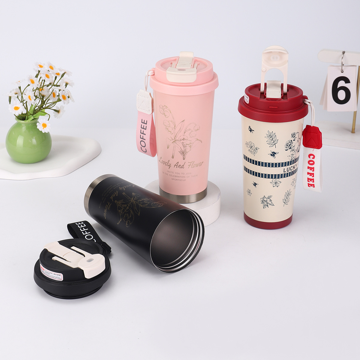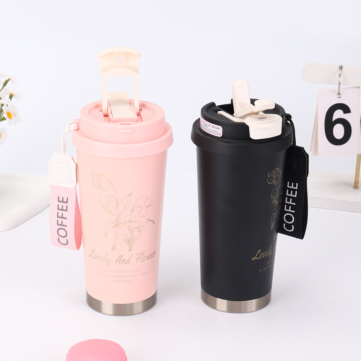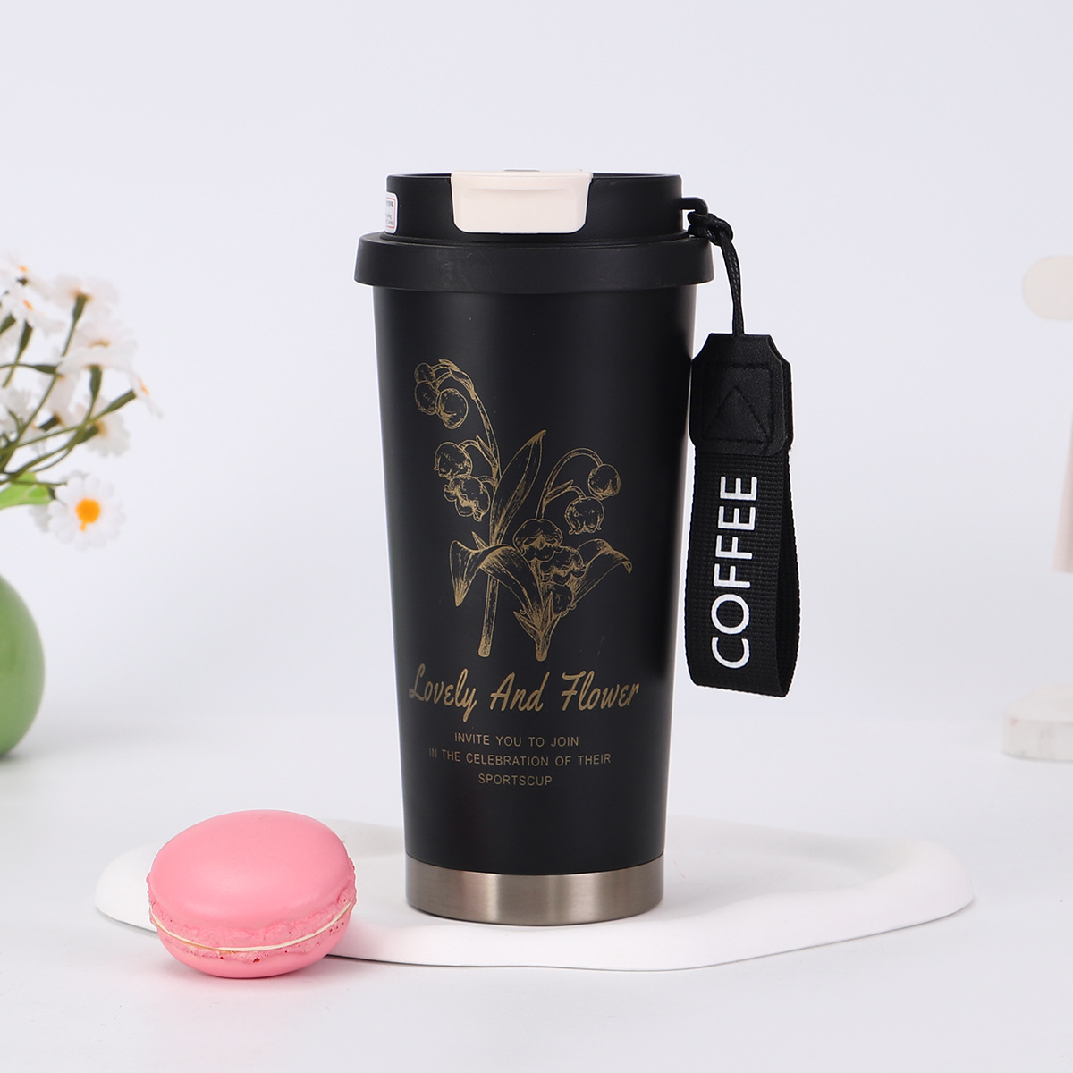 국경 간 백합 계곡 빛 고급 커피 컵 더블 레이어 316 스테인레스 스틸 보온병 컵 대용량 야외 스포츠 흡입 컵