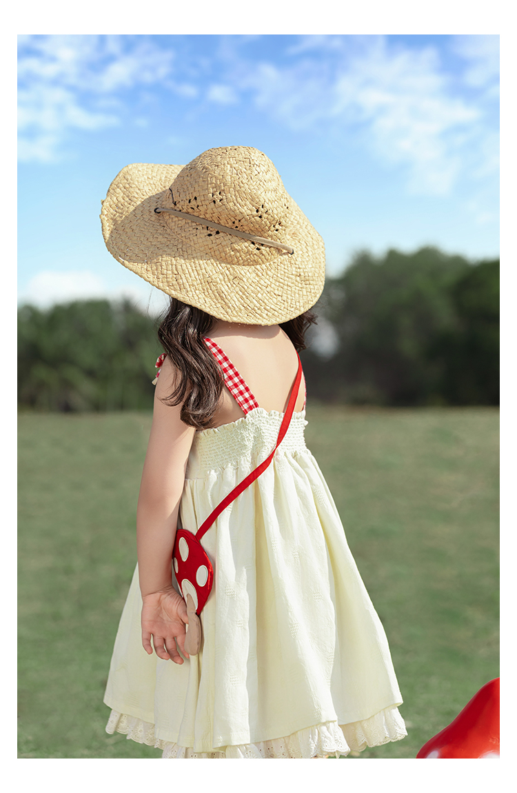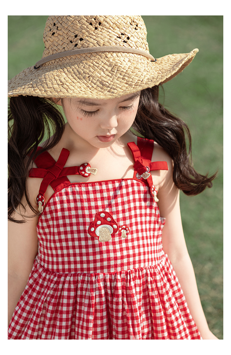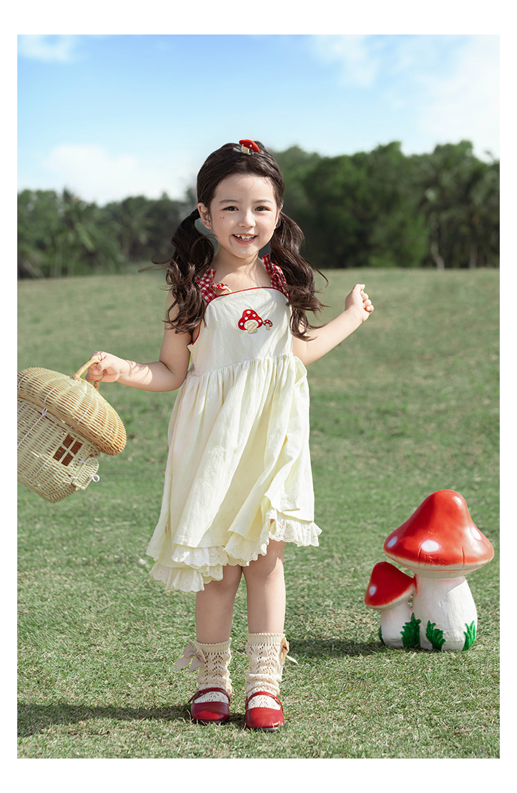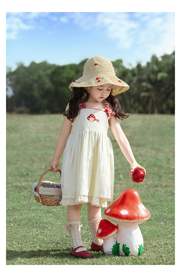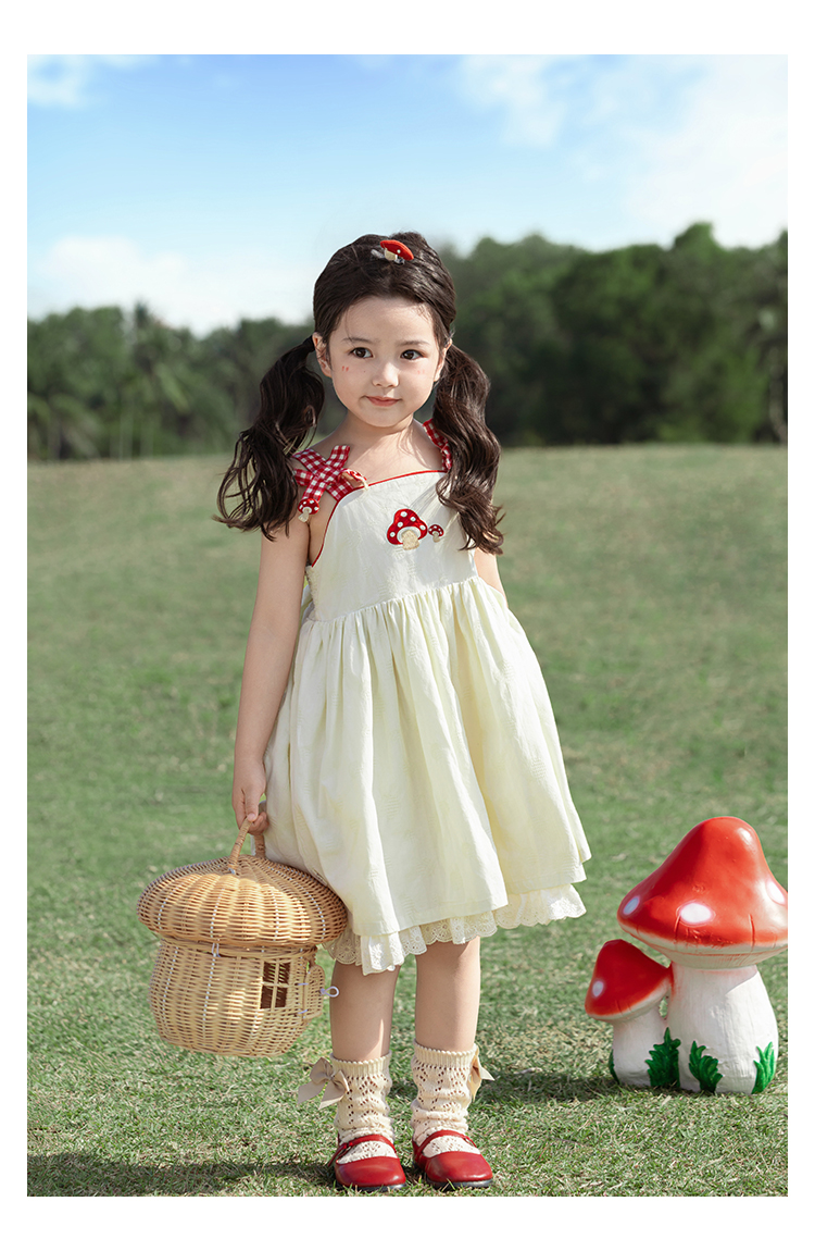Wulibuyi 소녀 목가적 스타일 버섯 서스펜더 스커트 여름 어린이 달콤하고 귀여운 통기성 보우 드레스스토어 가기