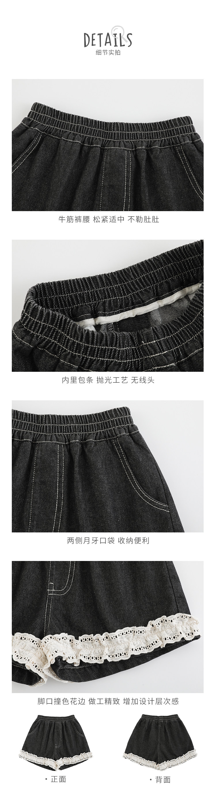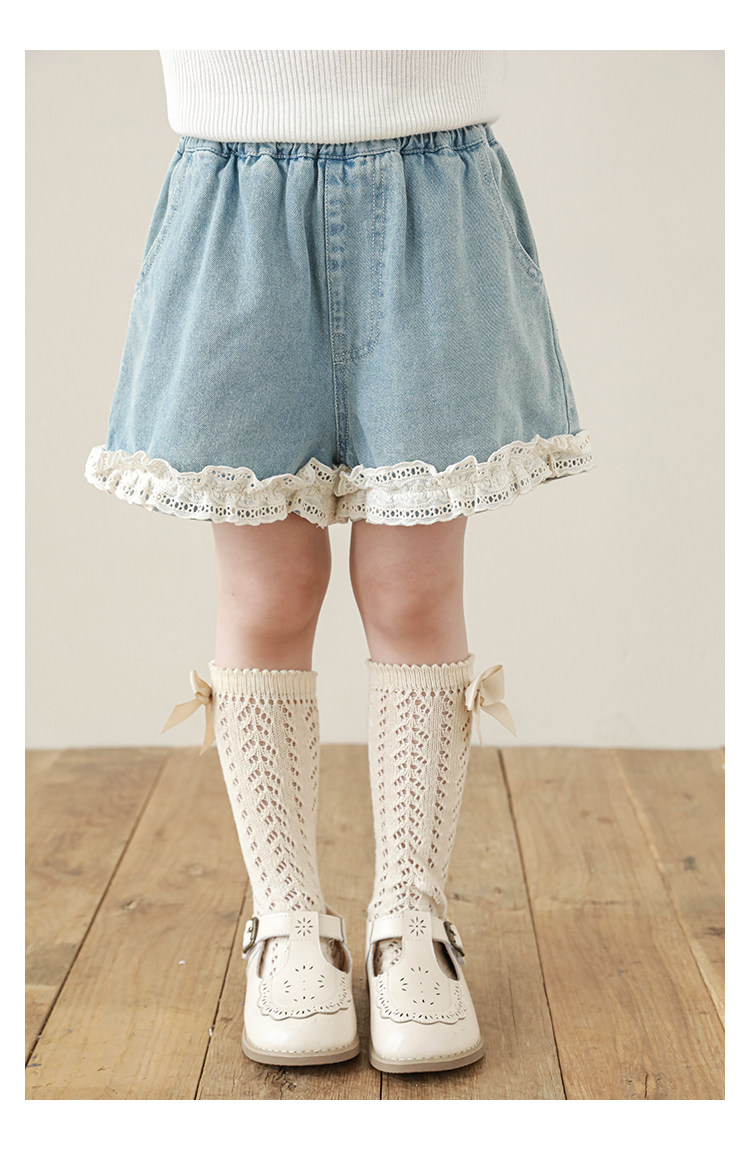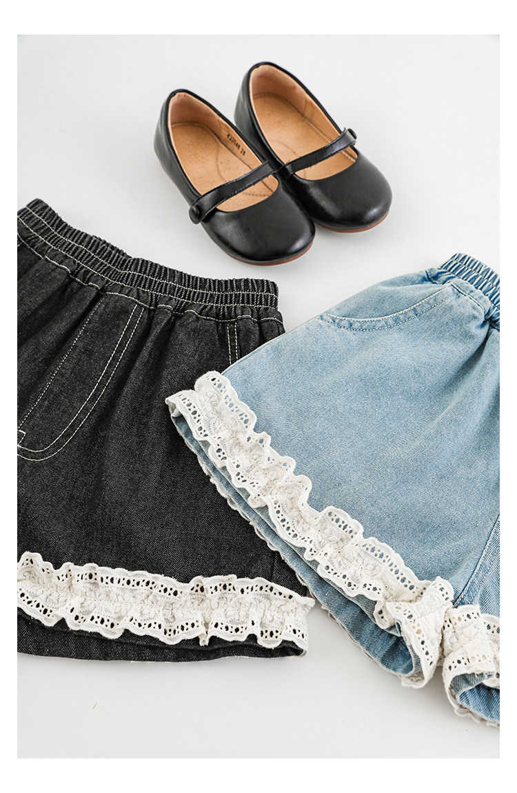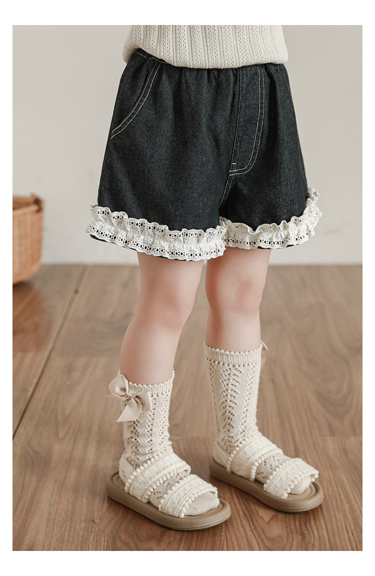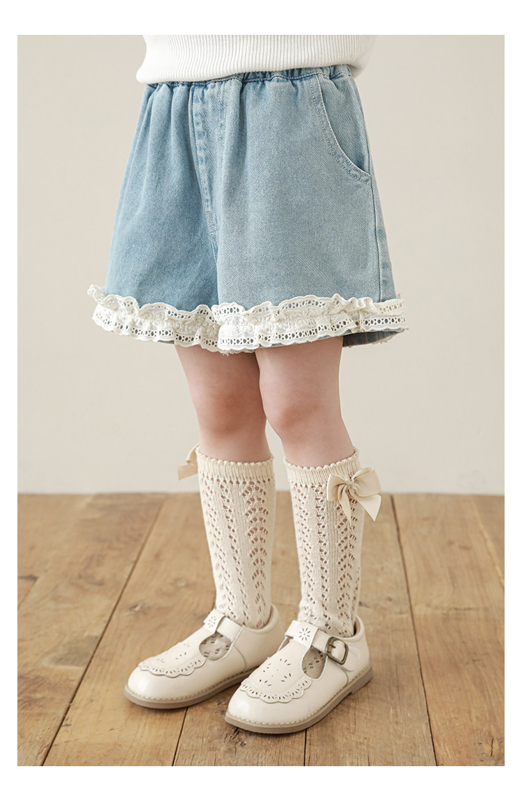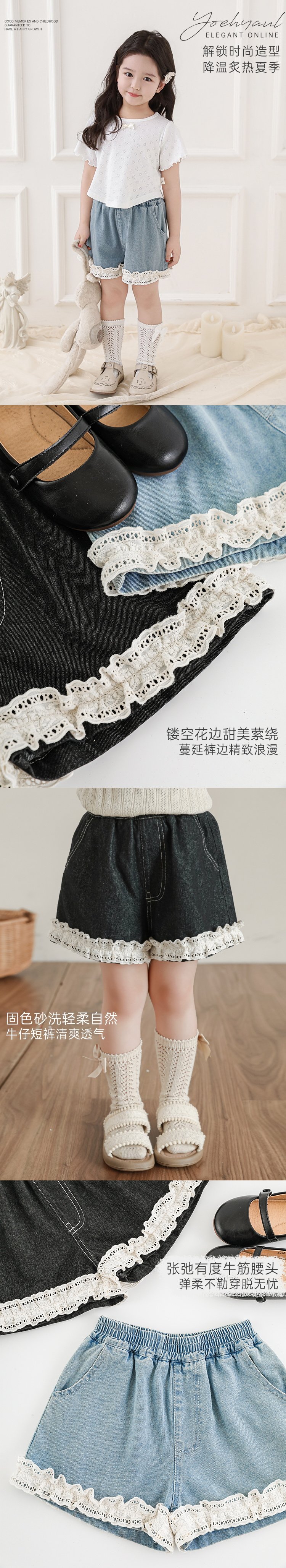 Wulibuyi 소녀 중공 레이스 레이스 데님 반바지 2025 여름 어린이 달콤하고 귀여운 상쾌한 바지