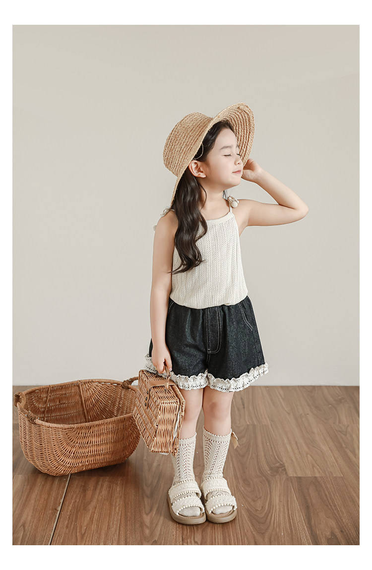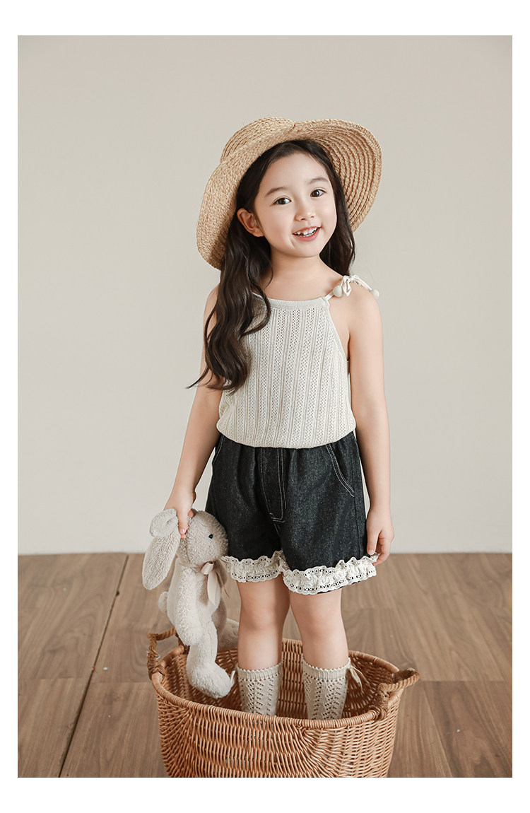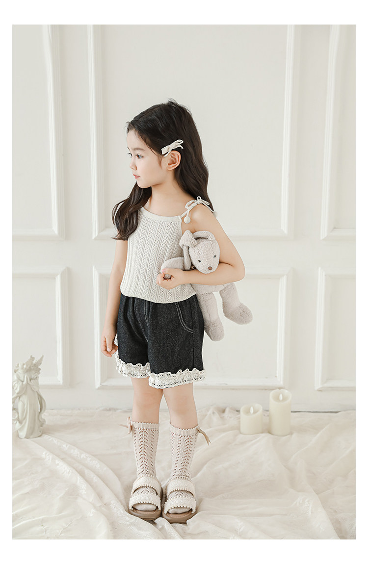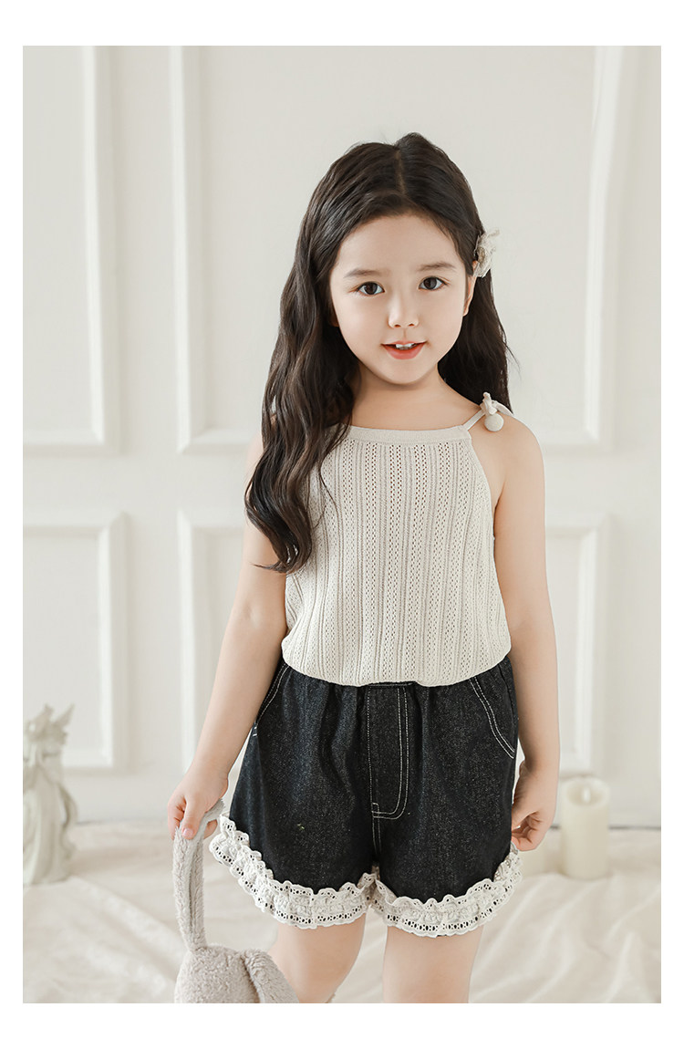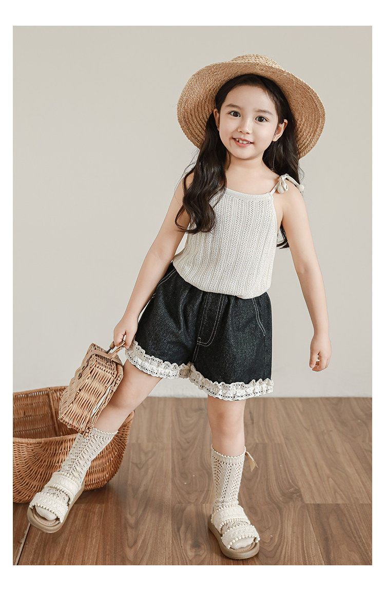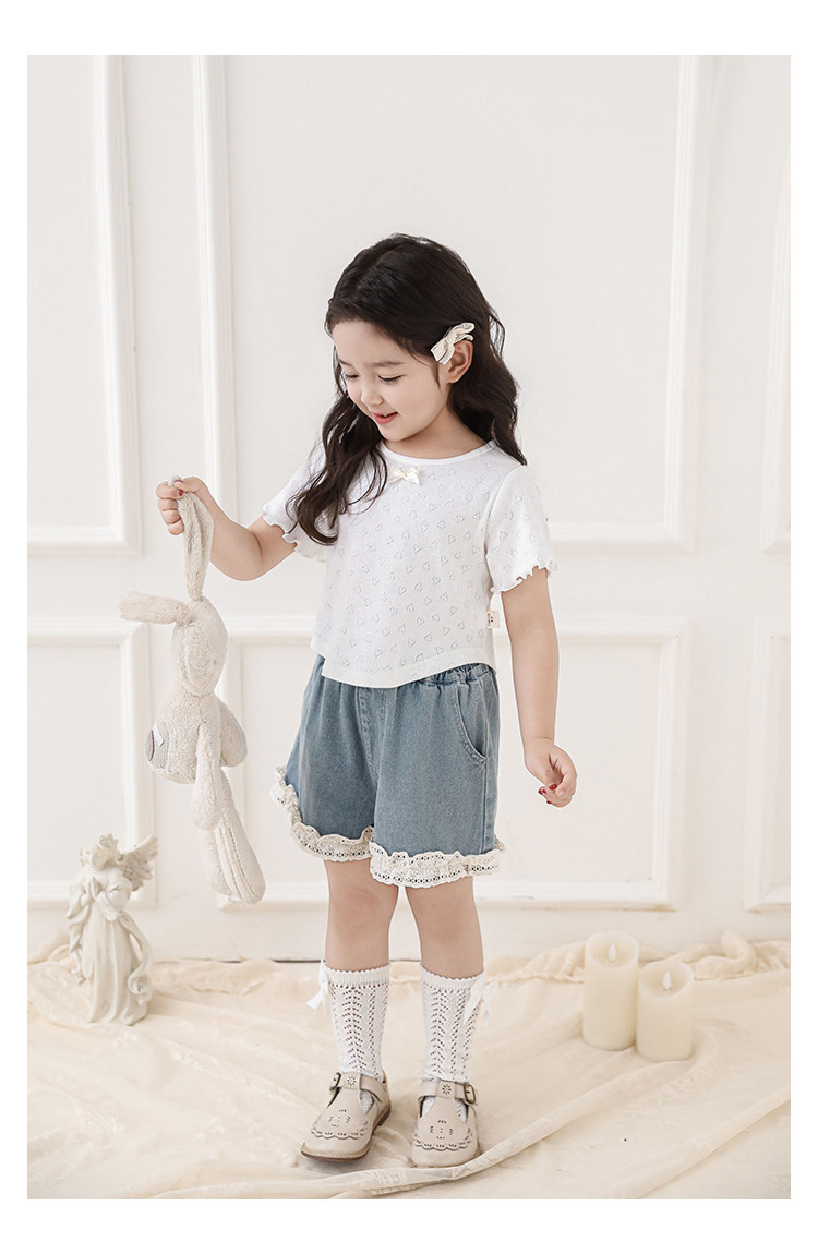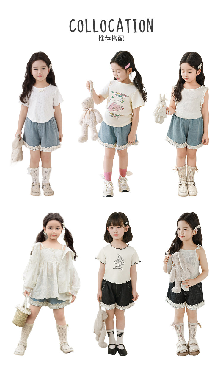 Wulibuyi 소녀 중공 레이스 레이스 데님 반바지 2025 여름 어린이 달콤하고 귀여운 상쾌한 바지스토어 가기