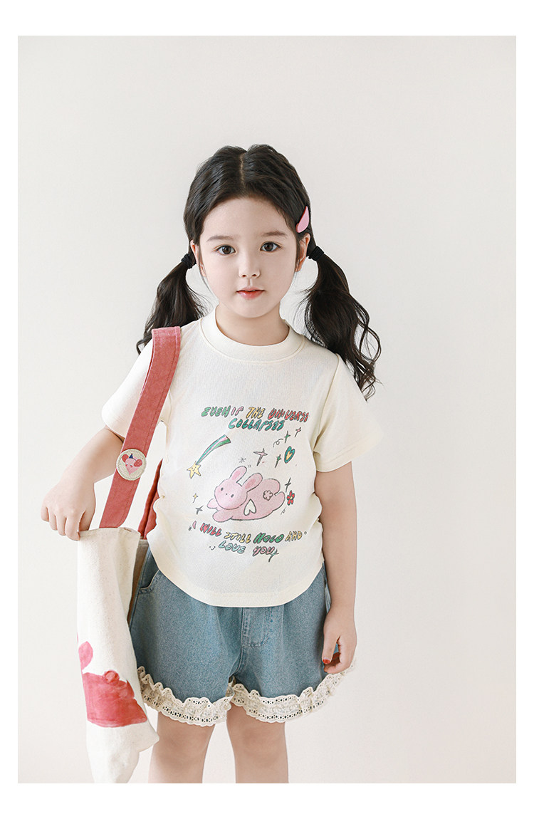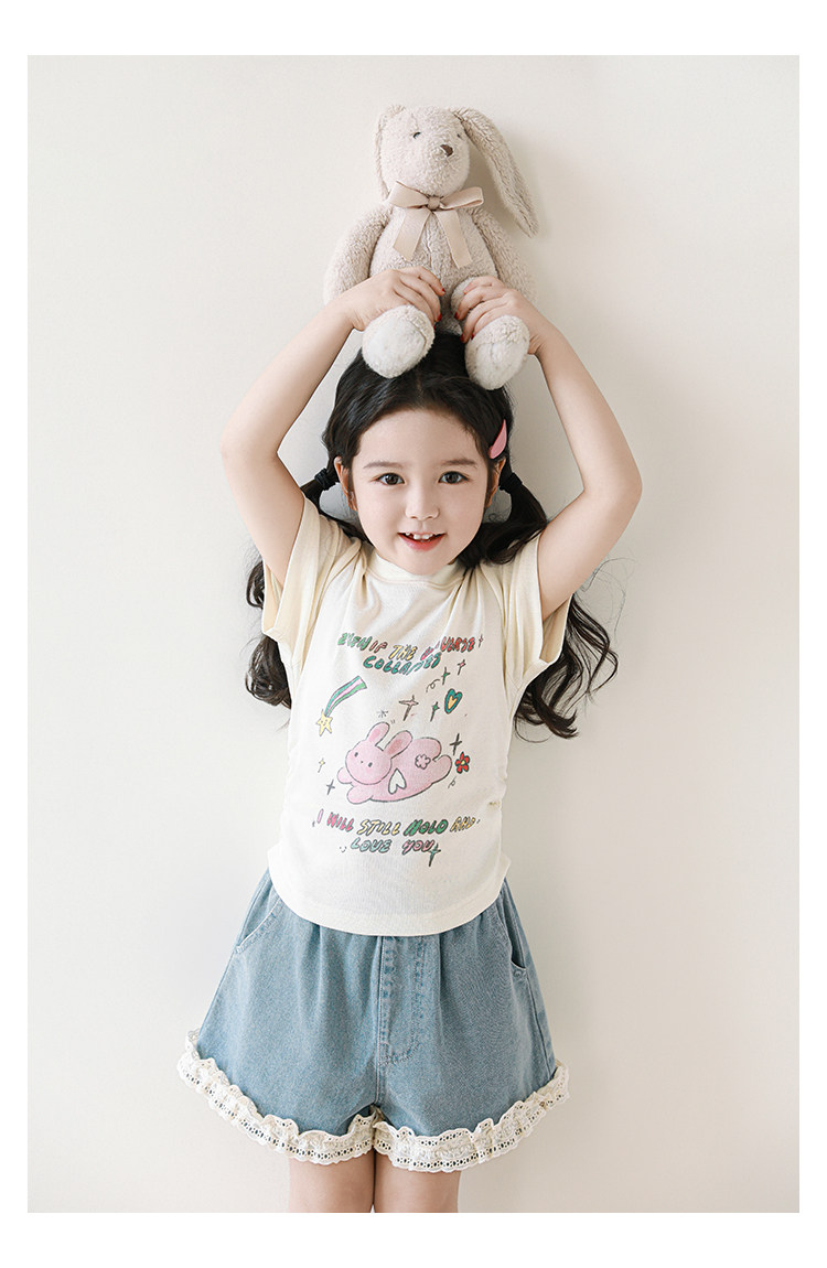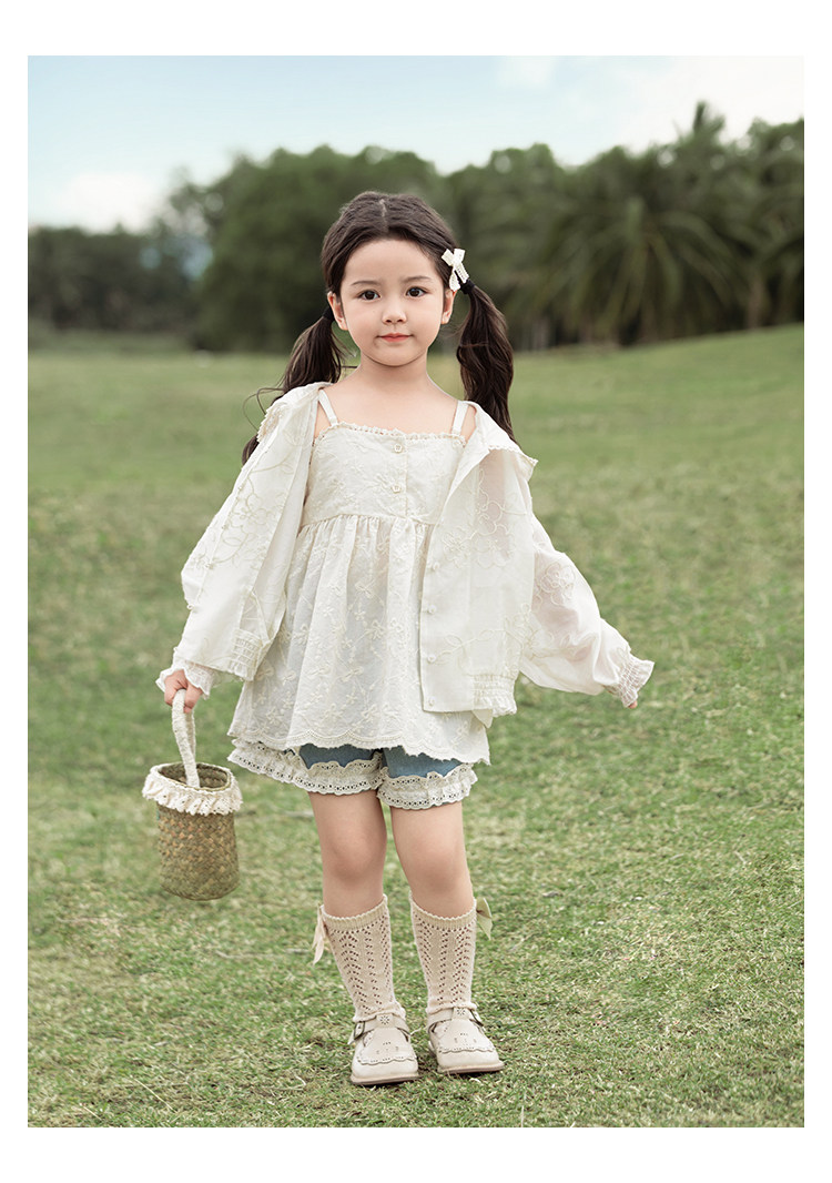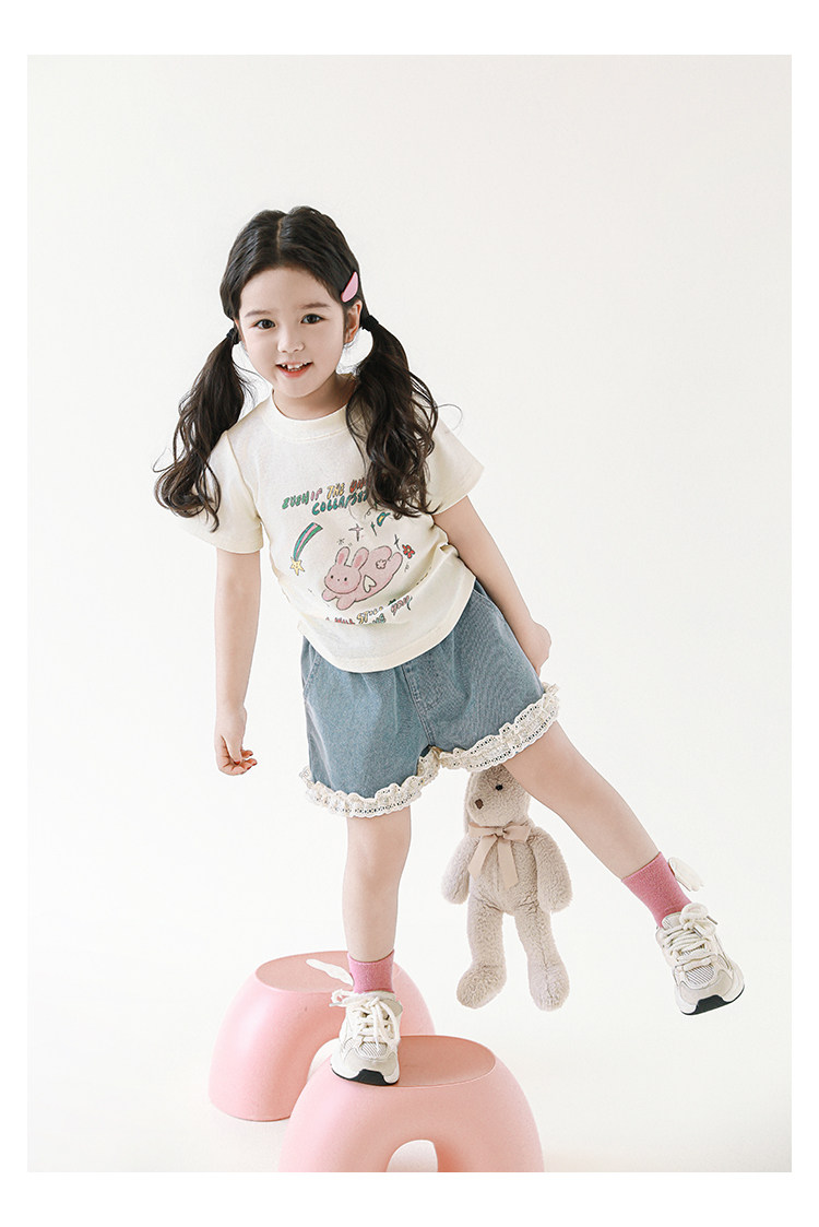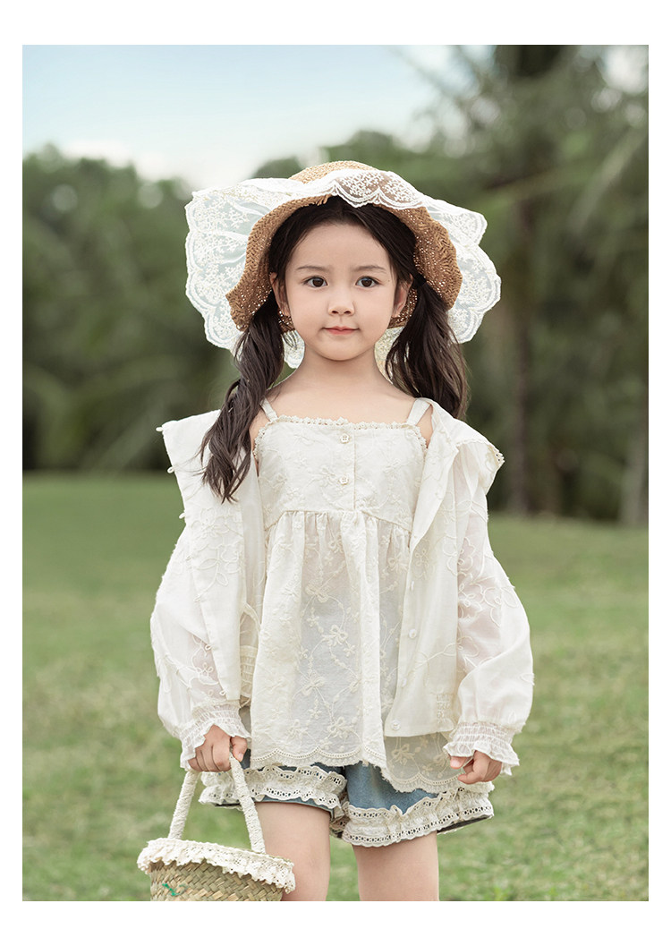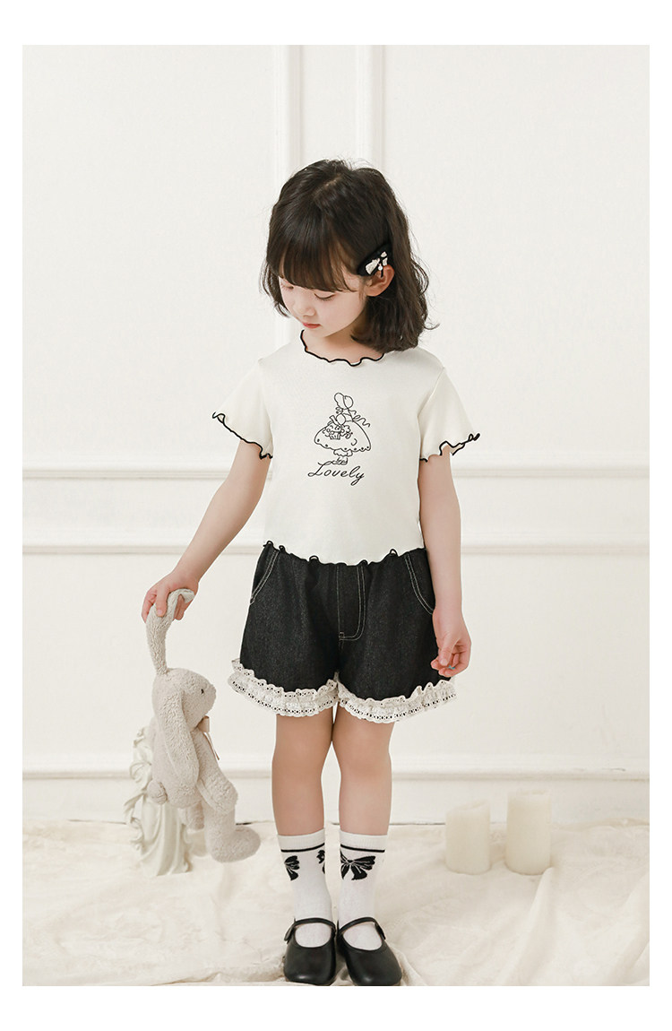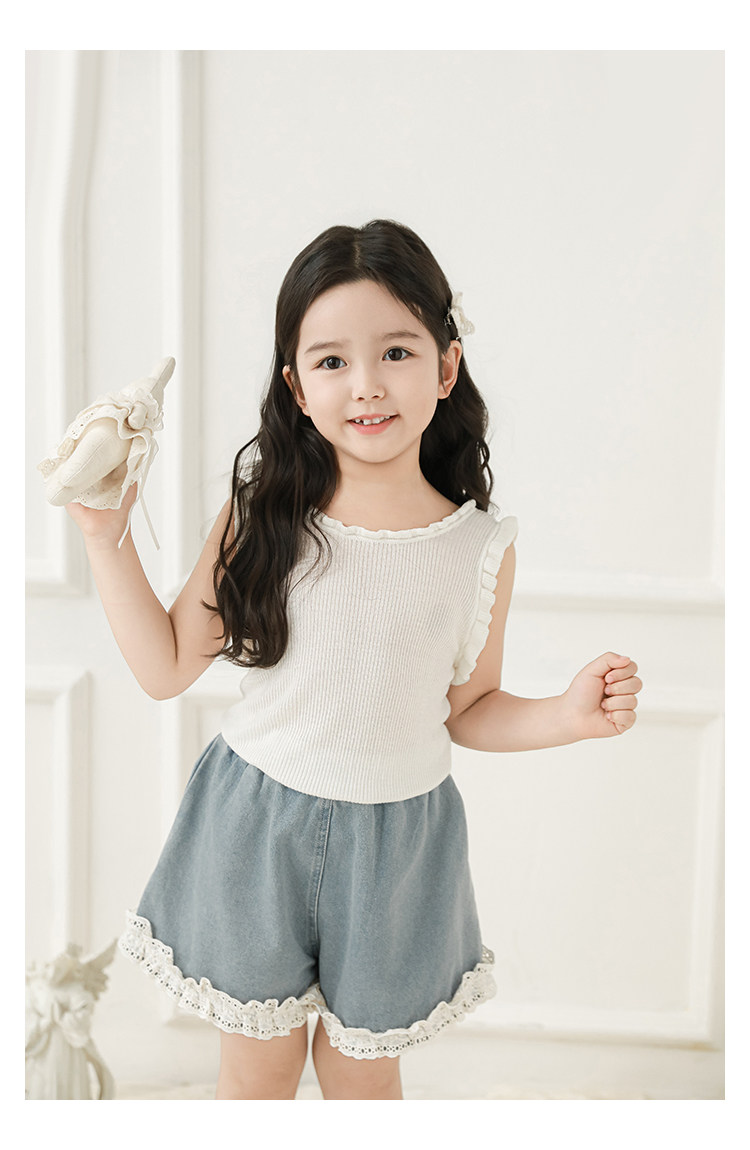 Wulibuyi 소녀 중공 레이스 레이스 데님 반바지 2025 여름 어린이 달콤하고 귀여운 상쾌한 바지스토어 가기