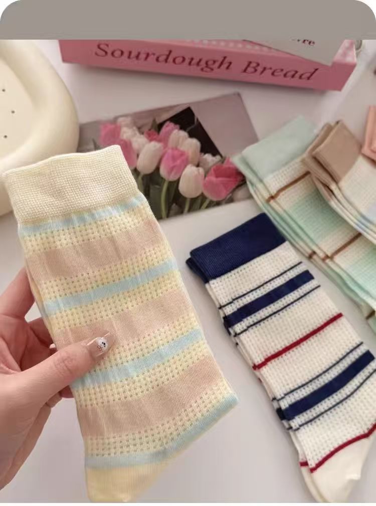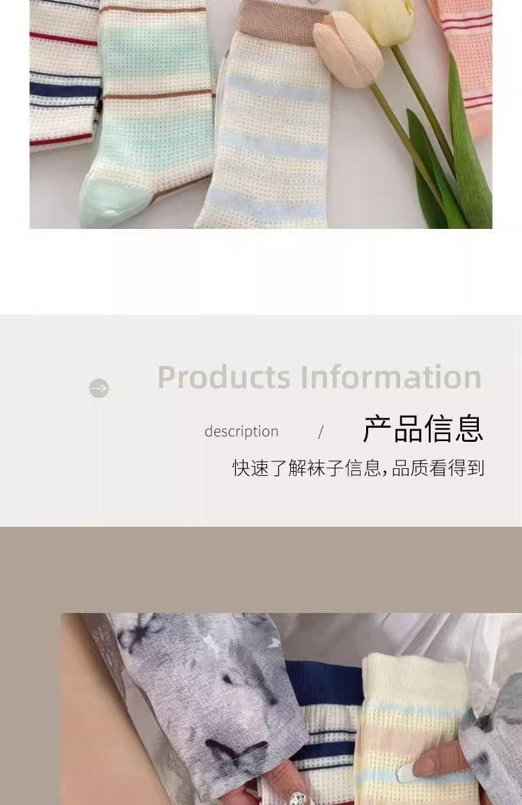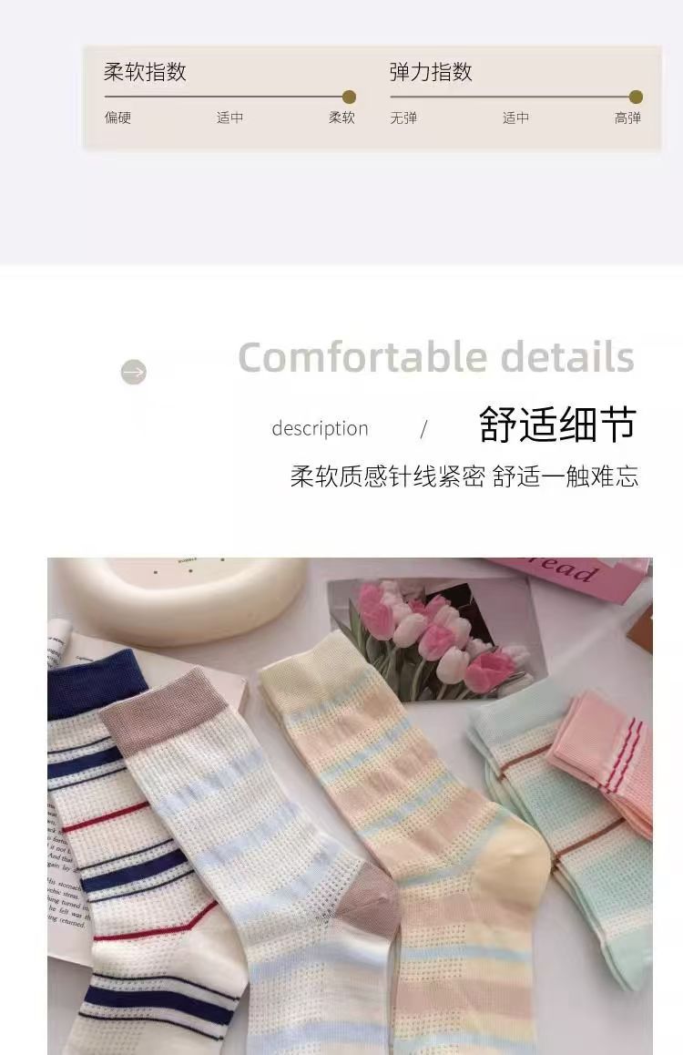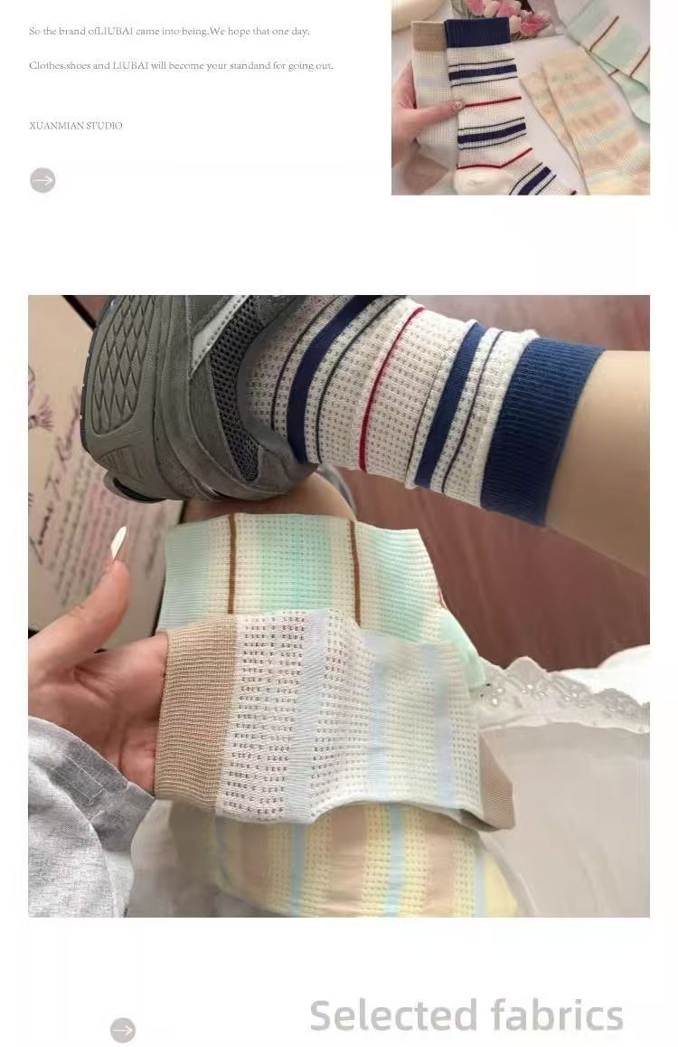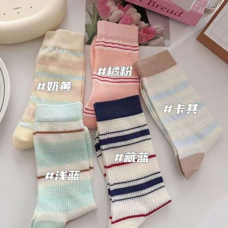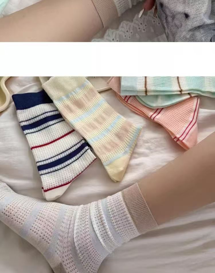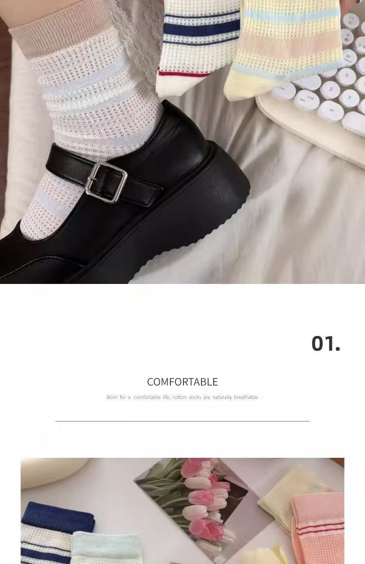 빈티지 메쉬 스트라이프 스택 양말 여성용 중간 길이 양말 트렌디 한 단색 여름 얇은 일본 스포츠 스타킹스토어 가기