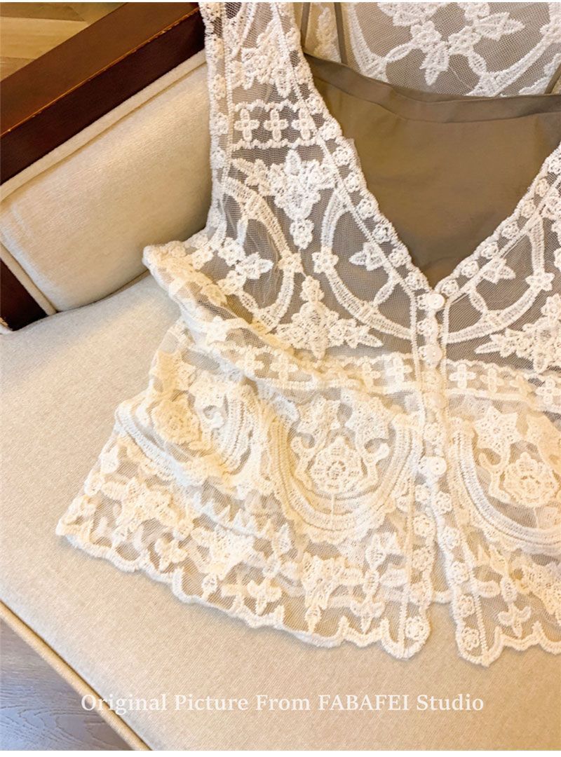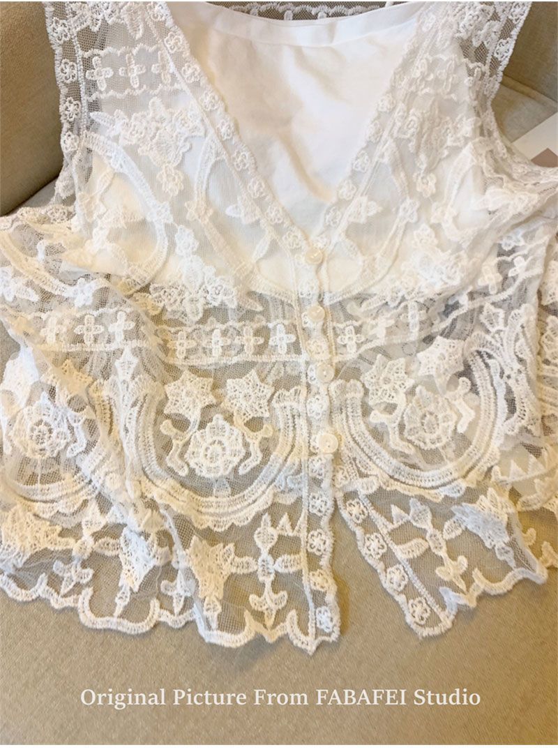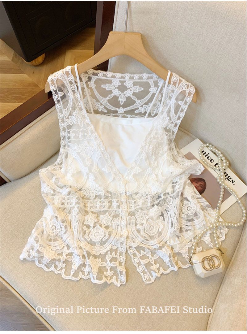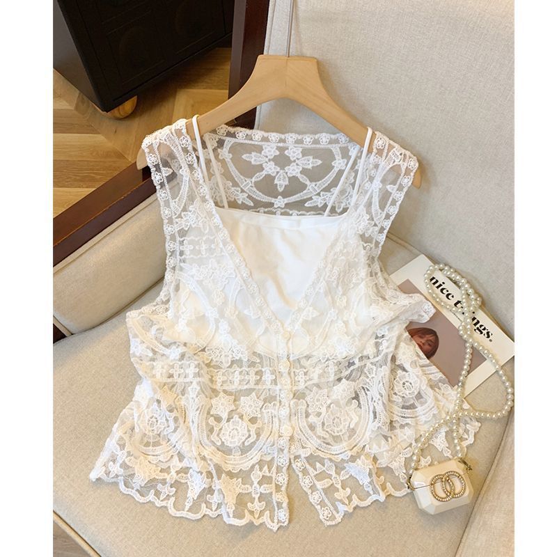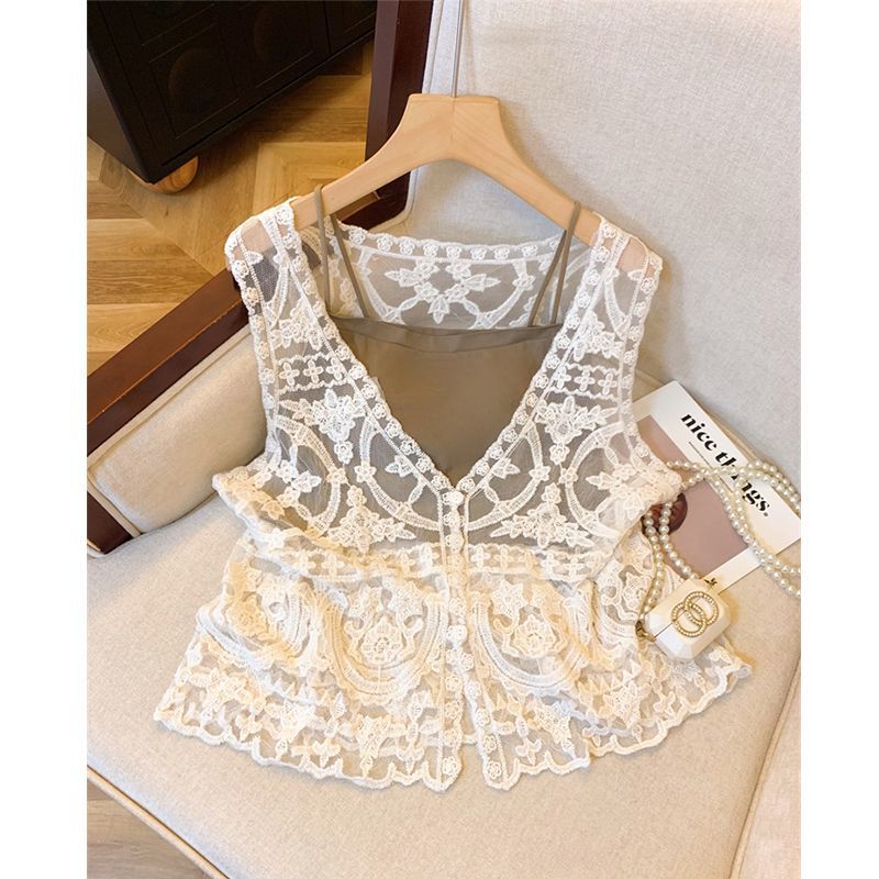 프랑스 스타일 V-Neck 레이스 조끼 카디건 여성 여름 카미솔 소매 탑 보헤미안