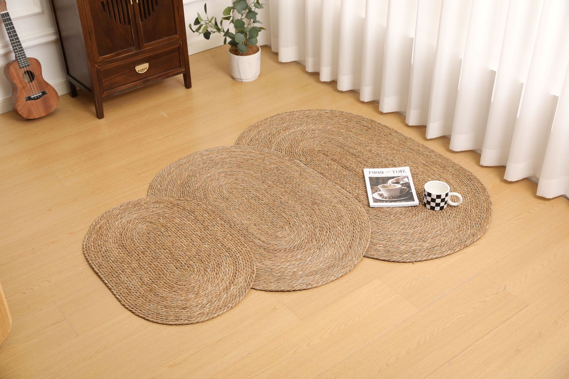 둥근형 등나무 바닥 매트, 고양이 긁는 매트, 원목색 침실 침대 옆 카펫, 다다미, 창가용 풀잎 매트