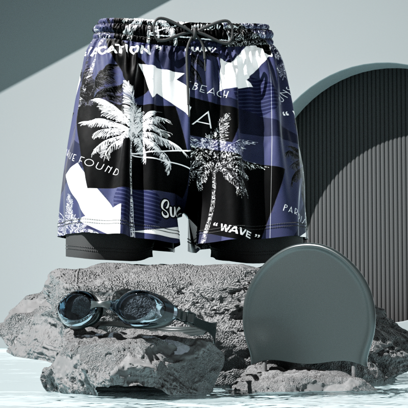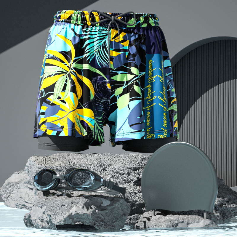 • <<삼색잎 더블 레이어 당황 방지 수영 트렁크 + 수영 모자 + 수영 고글 3종 세트>>