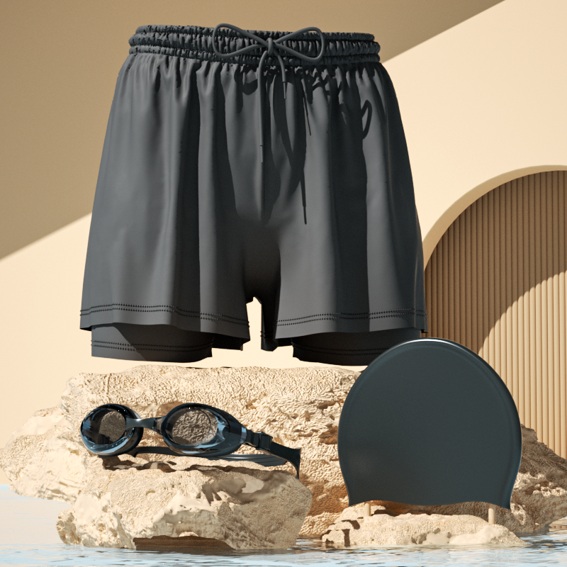 • <<실버 그레이 더블 레이어 당황 방지 수영 트렁크 + 수영 모자 2종 세트>>