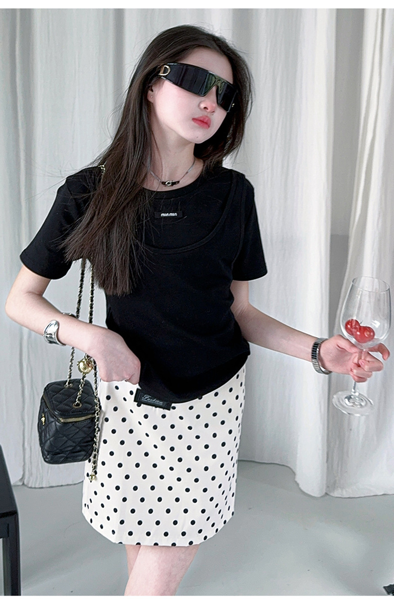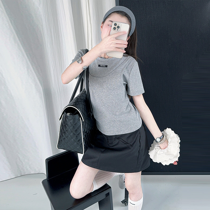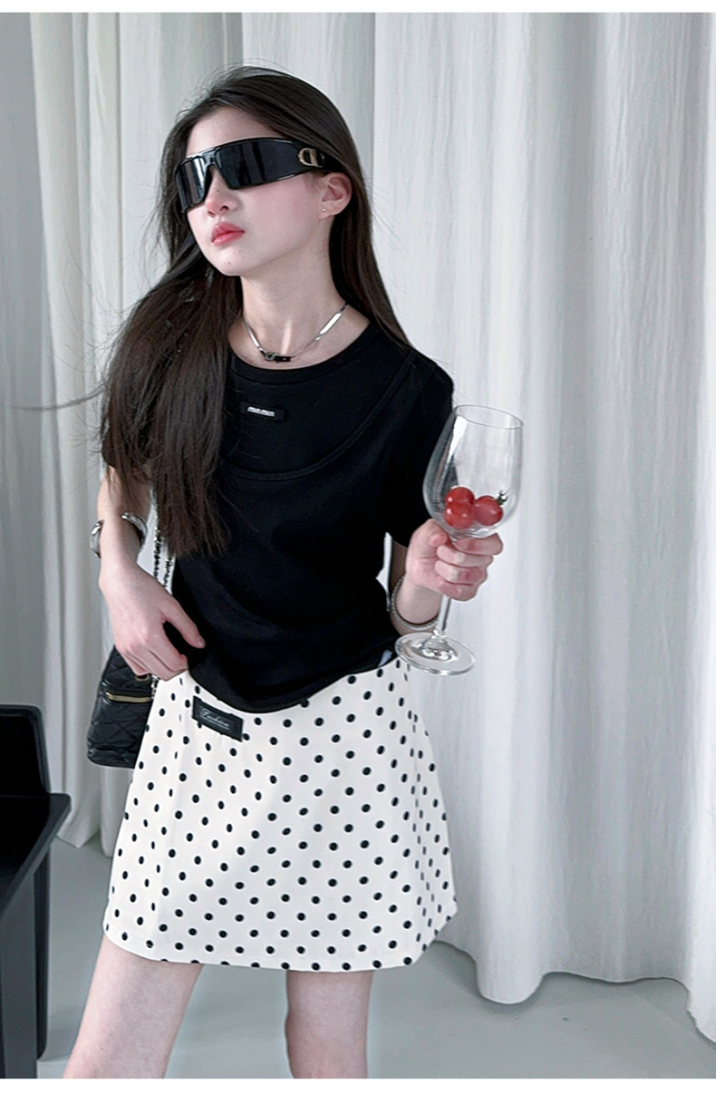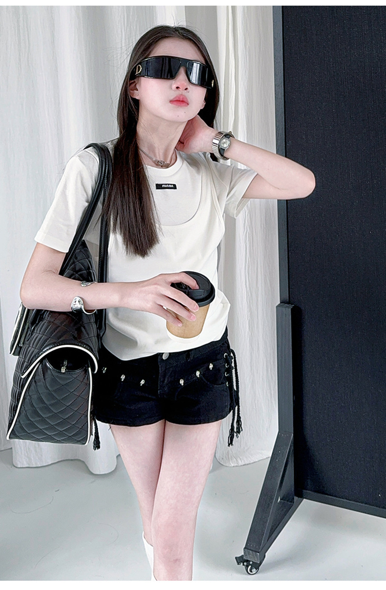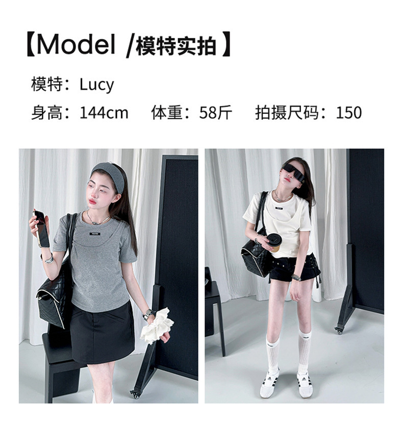 새로운 패션 티셔츠 한국식 국경 소녀 2025 가짜 투피스 외국식 소녀 여름 세트 아이스토어 가기