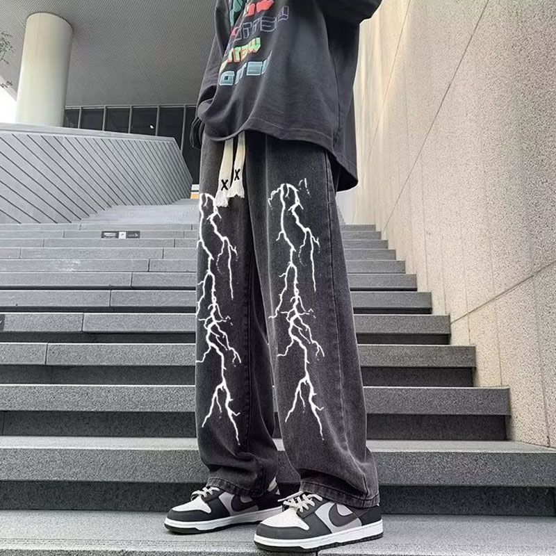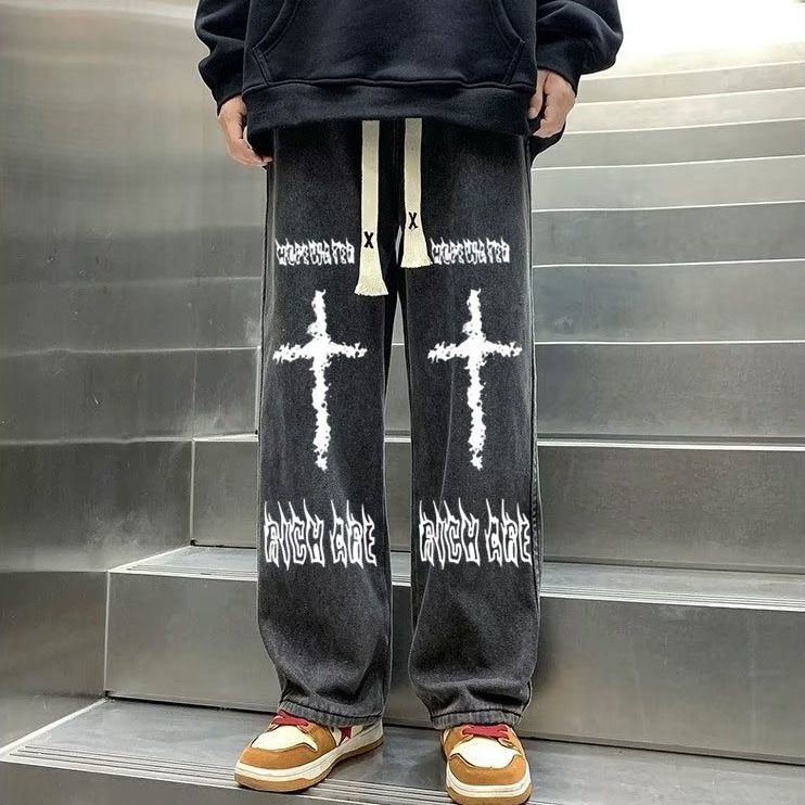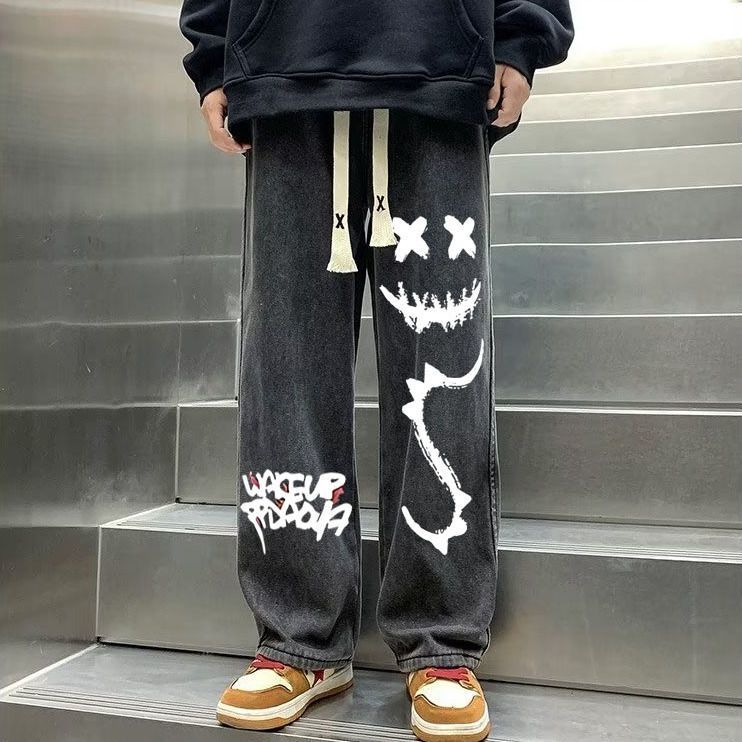 남성용 아메리칸 하이 스트리트 프린트 청바지 2025 여름 루즈한 대형 트렌디 하이 스트리트 캐주얼 다용도 9부 바지스토어 가기