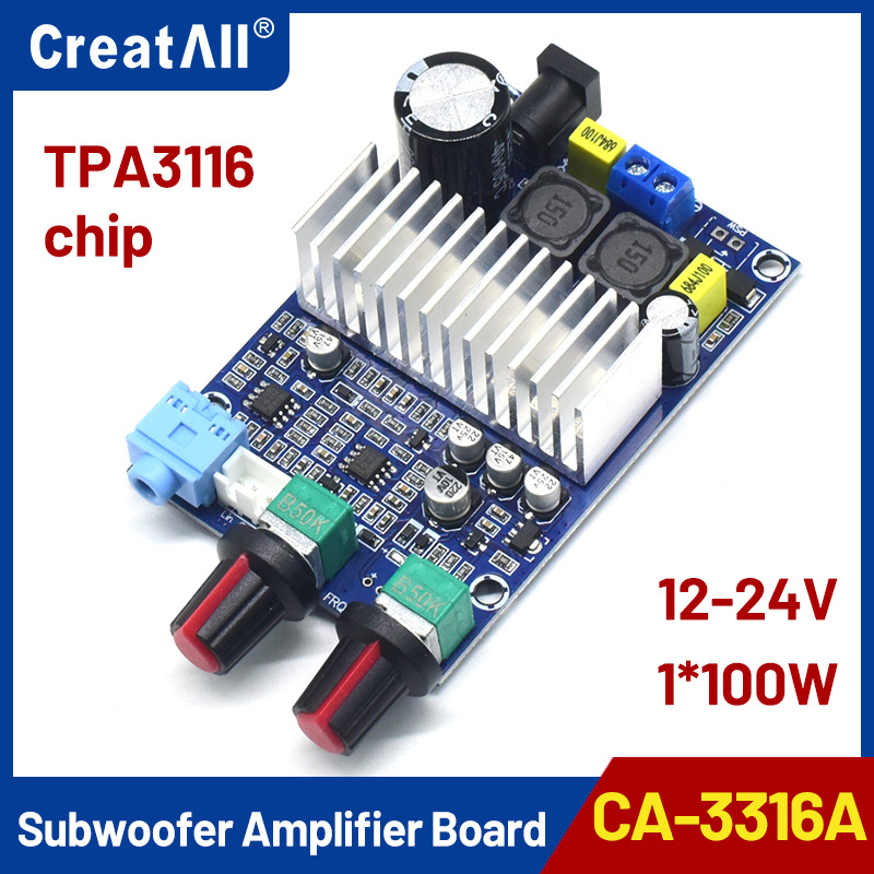 This is a product that uses a DC single power supply of 12-24V, with T company's TPA3116D2 high-performance digital amplifier chip as the core, and is connected to a bridge for low-frequency channel power amplification, supporting 100W (low-frequency channel) output. External audio input interface, with preamplifier, bass division processing: bass volume, bass frequency, switch/total volume, 2 adjustable potentiometers. Wide operating voltage, energy-saving design, with an efficiency of over 90%. Can use high-performance switching power supplies and laptop switching power supplies. You can also use charging bottles, car power supplies, and so on,
