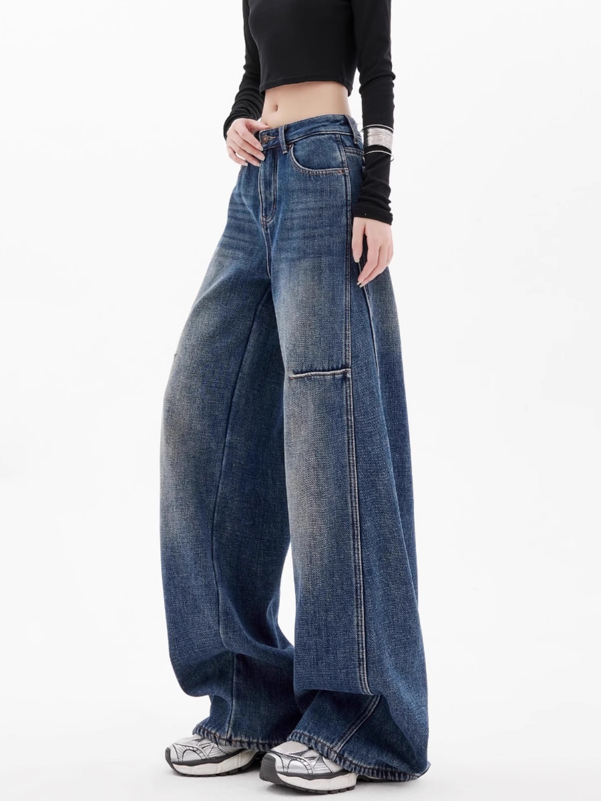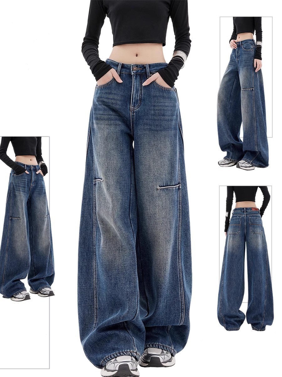 플러스 사이즈 통통녀 빈티지 시미 터 와이드 레그 청바지 여자 트렌디 올매치 스키 하이 웨이스트 루즈 슬리밍 스트레이트 바지스토어 가기