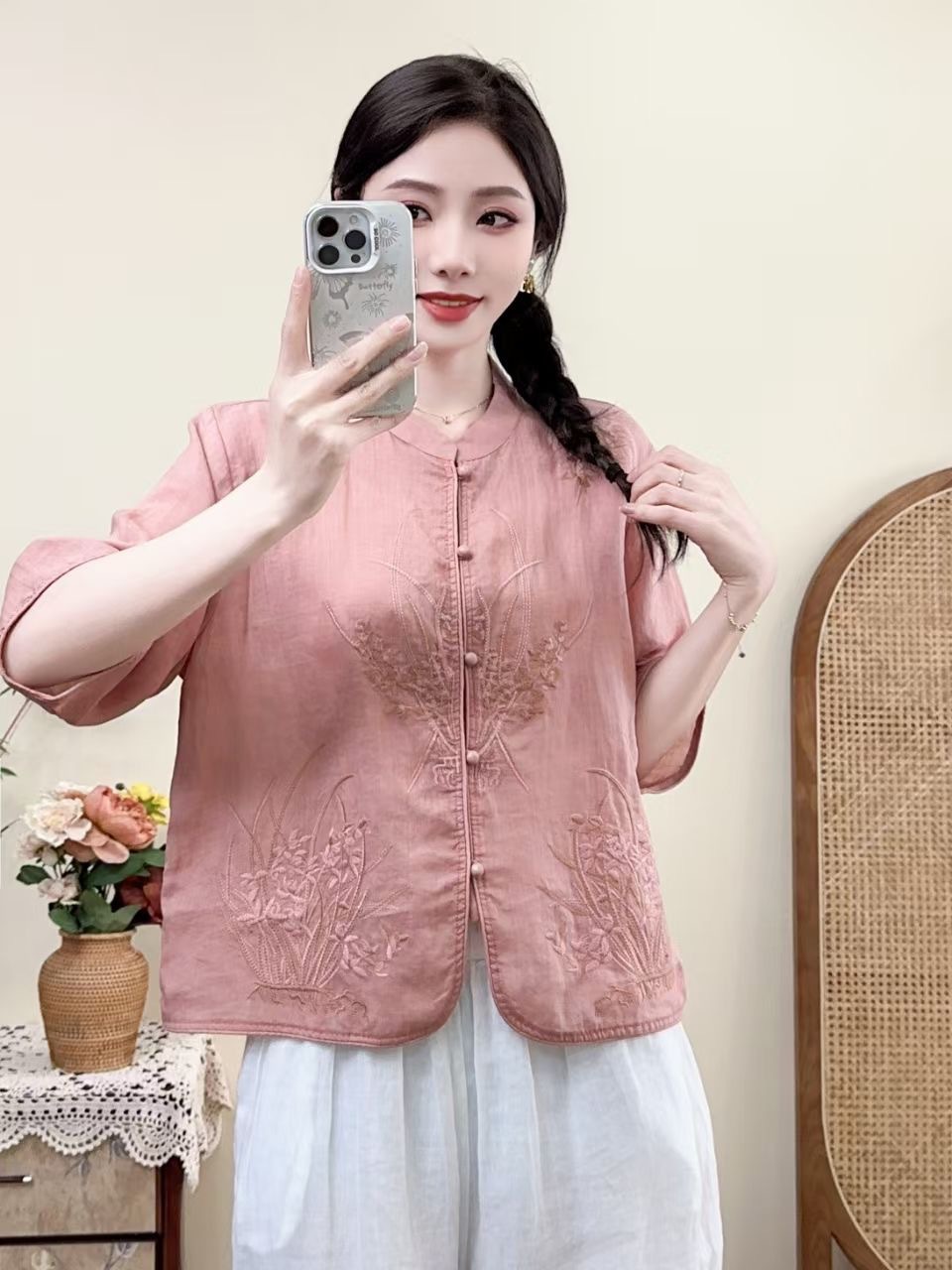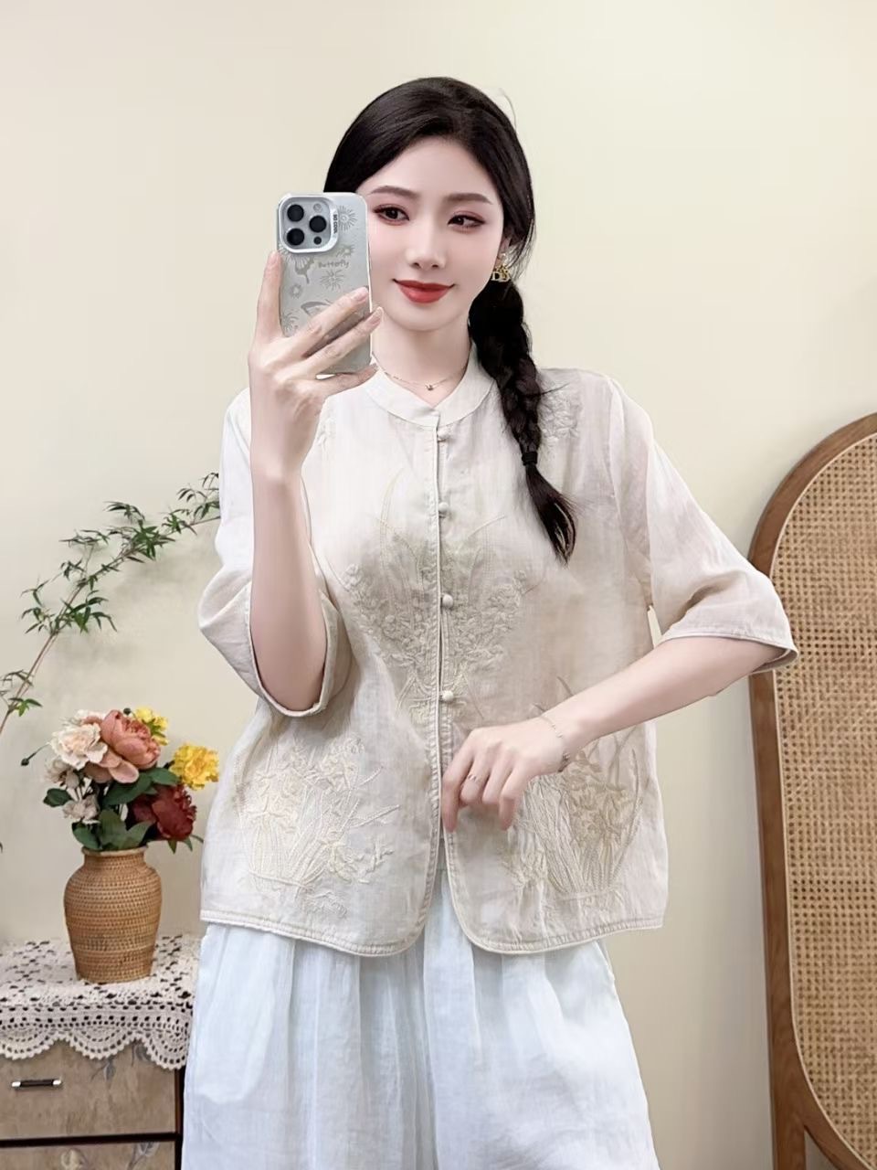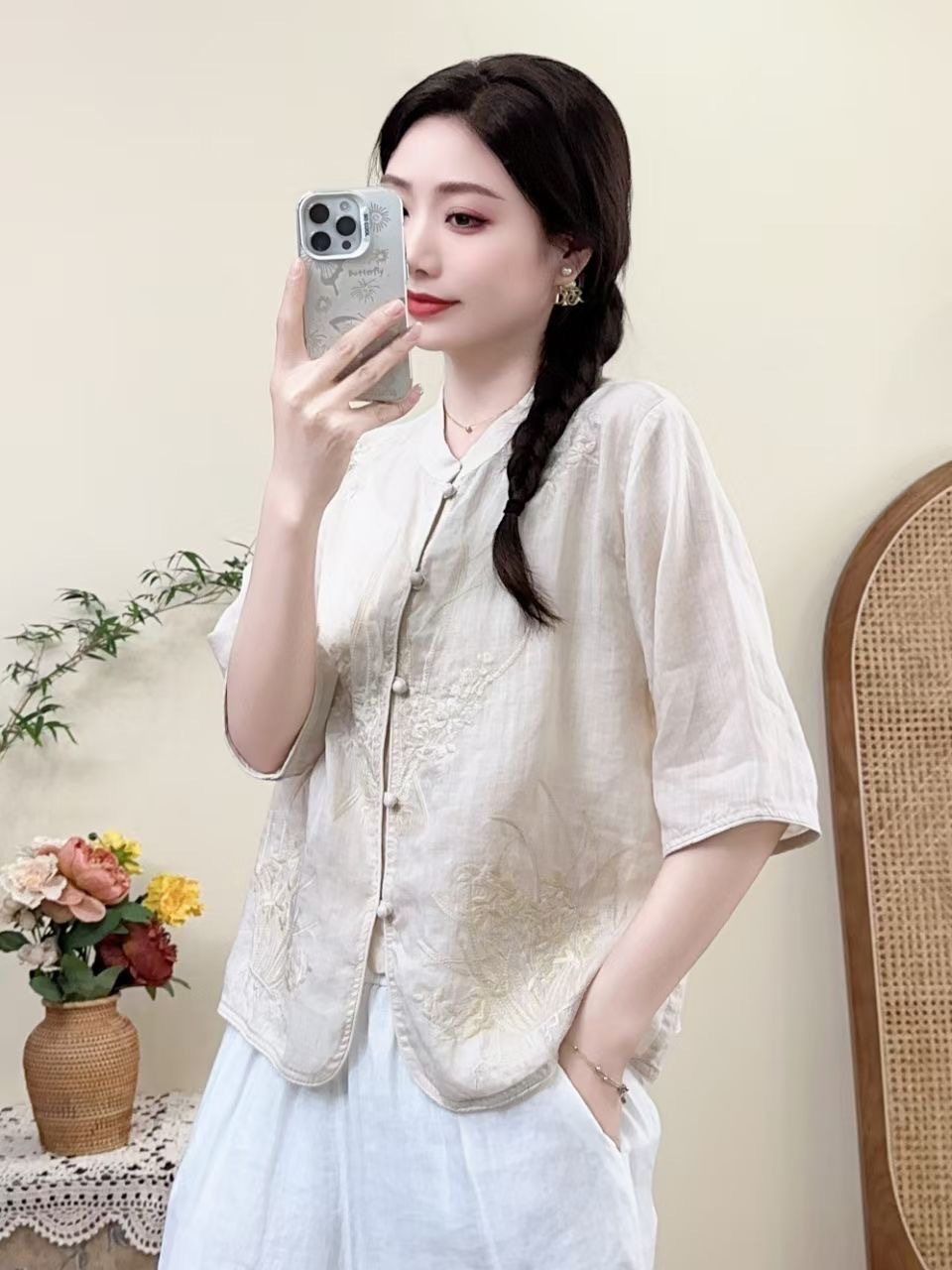 모리 소녀 2025 여름 새로운 국가 스타일 수 놓은 Gouhua Ramie 셔츠 느슨한 칼라 가방 버튼 업 소매 셔츠