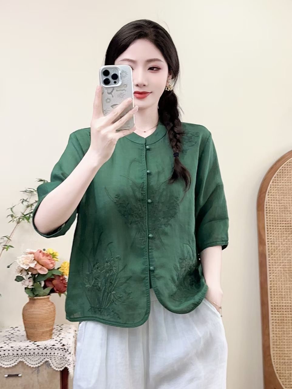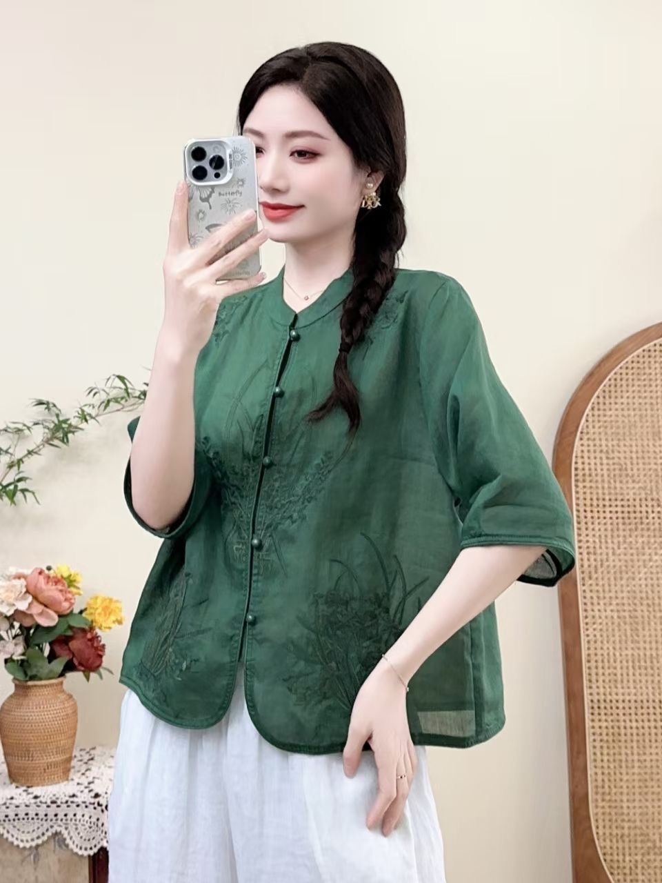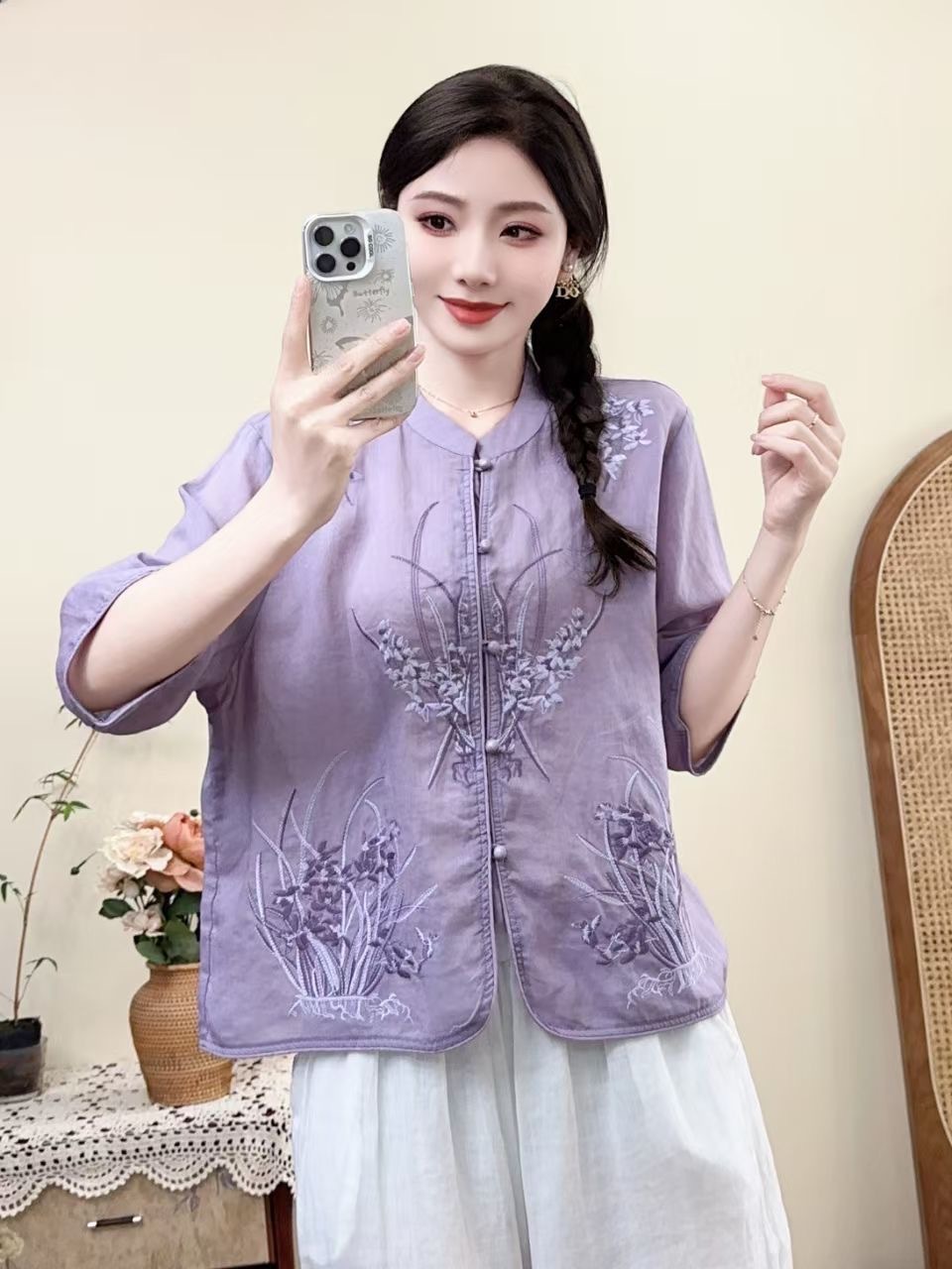모리 소녀 2025 여름 새로운 국가 스타일 수 놓은 Gouhua Ramie 셔츠 느슨한 칼라 가방 버튼 업 소매 셔츠