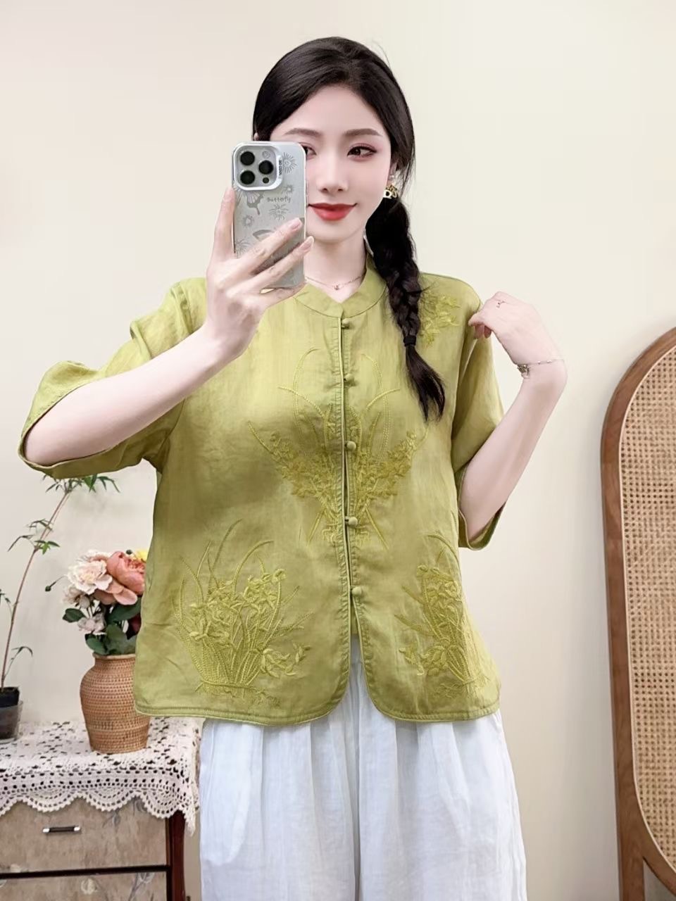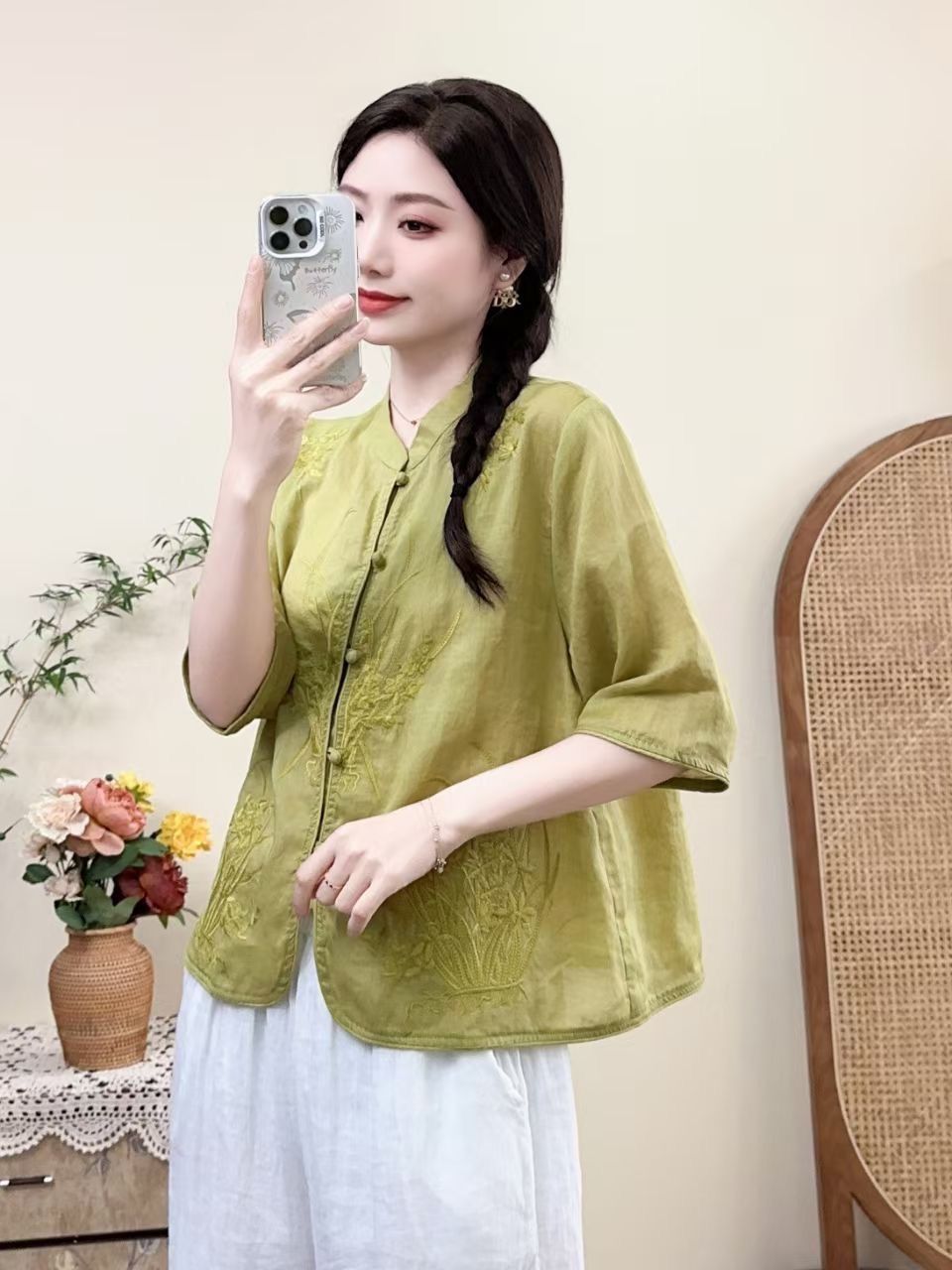 모리 소녀 2025 여름 새로운 국가 스타일 수 놓은 Gouhua Ramie 셔츠 느슨한 칼라 가방 버튼 업 소매 셔츠스토어 가기