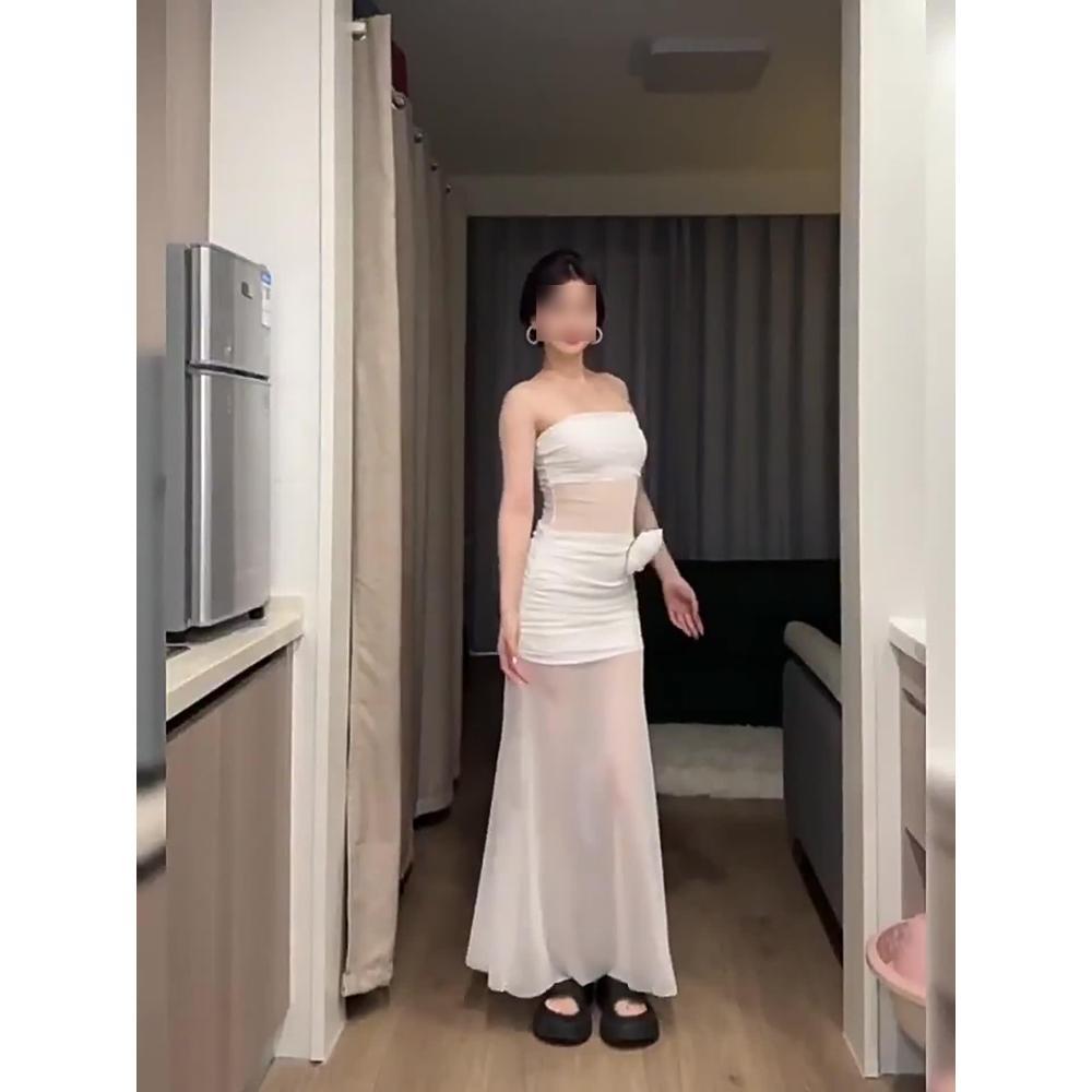 순수한 욕망 우아한 흰색 메쉬 튜브 원피스 여성의 봄 우아한 허리 해변 휴일 엉덩이 긴 치마