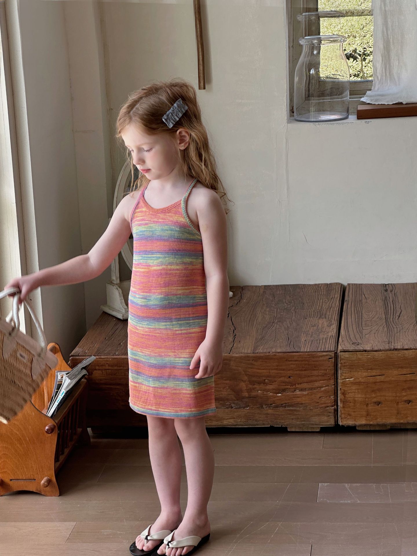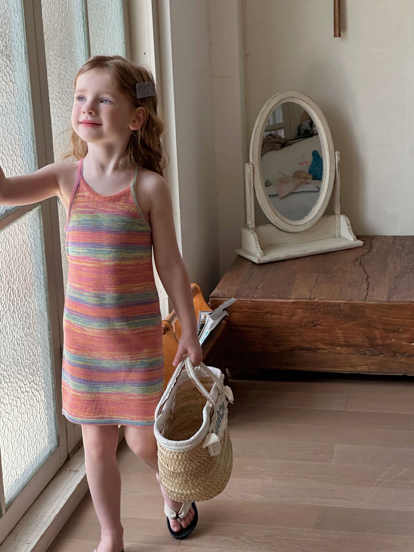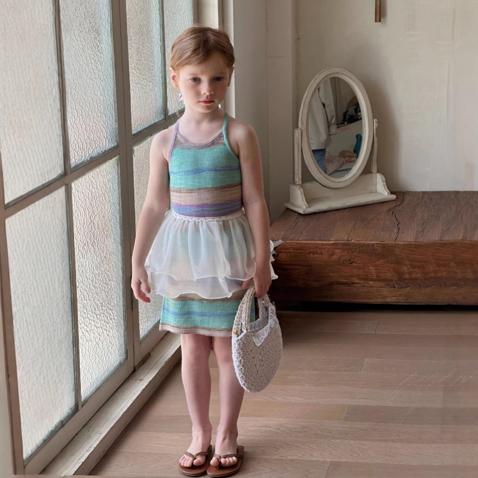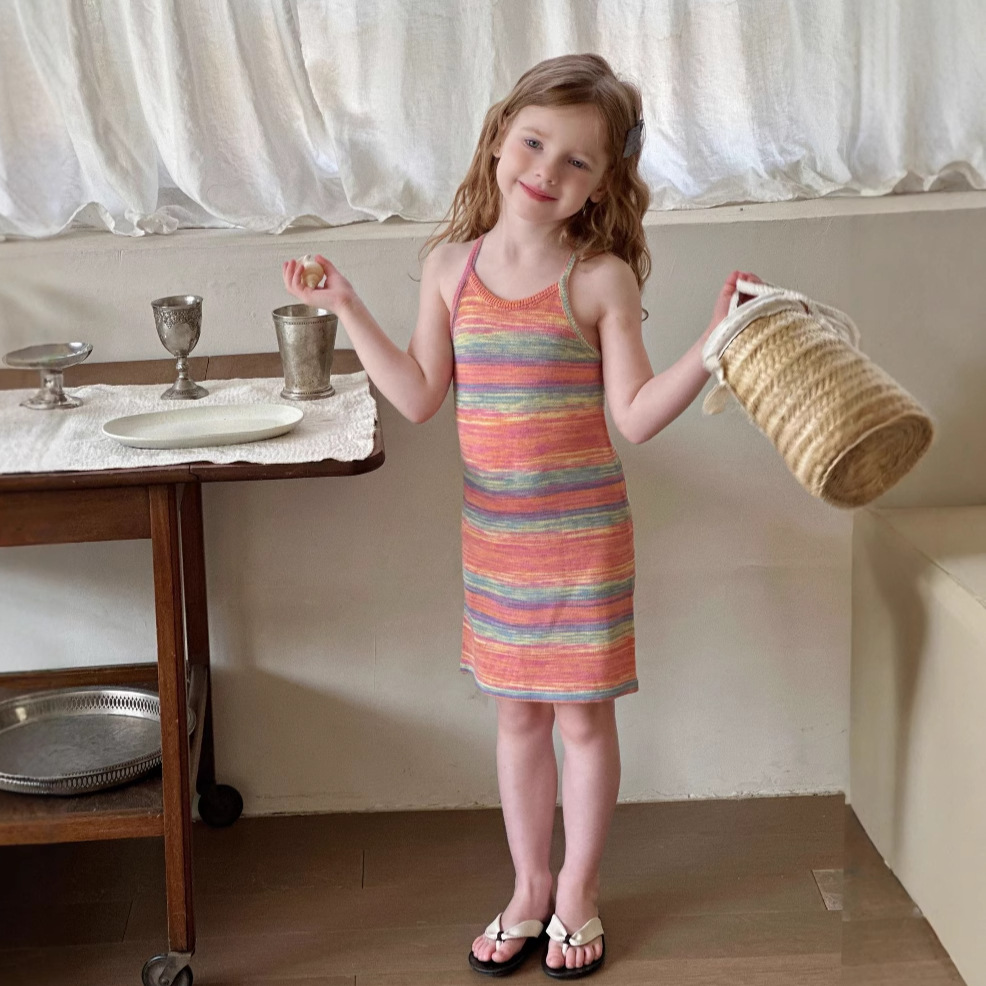 소녀 슬링 원피스 2025 여름 새로운 어린이 다채로운 도파민 줄무늬 니트 스커트 아기 롱 스커트