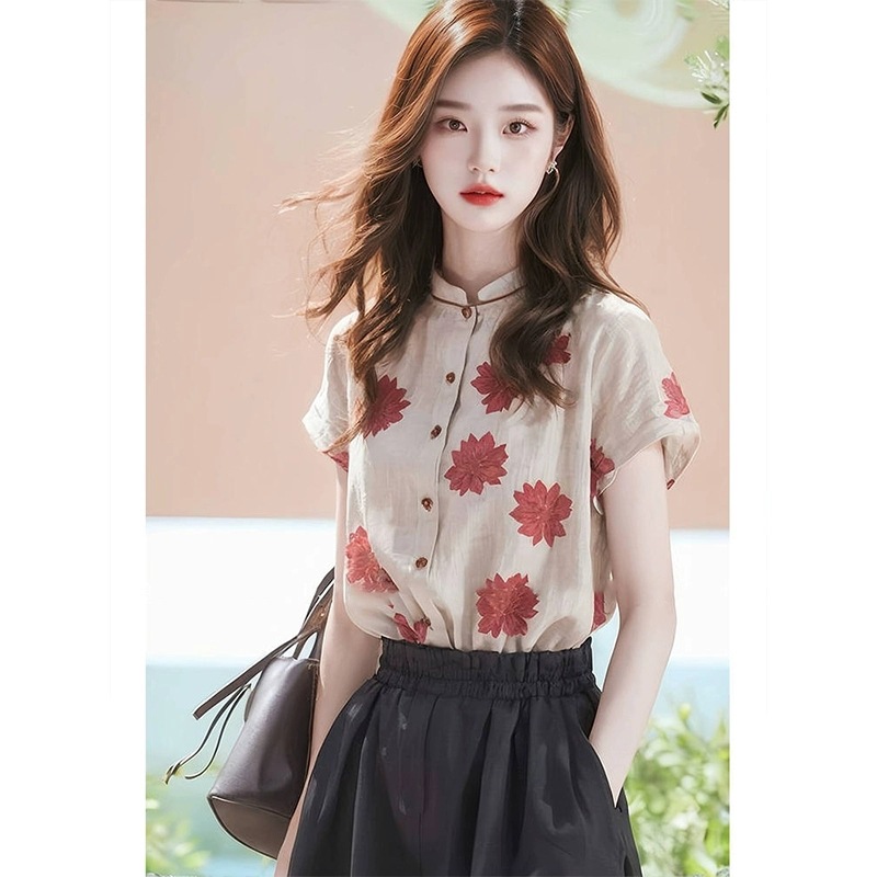 리넨 인쇄 반팔 셔츠 수직 칼라 여성 디자인 센스 틈새 독특한 여름 세련된 서양식 하이 엔드 아름다운 탑스토어 가기