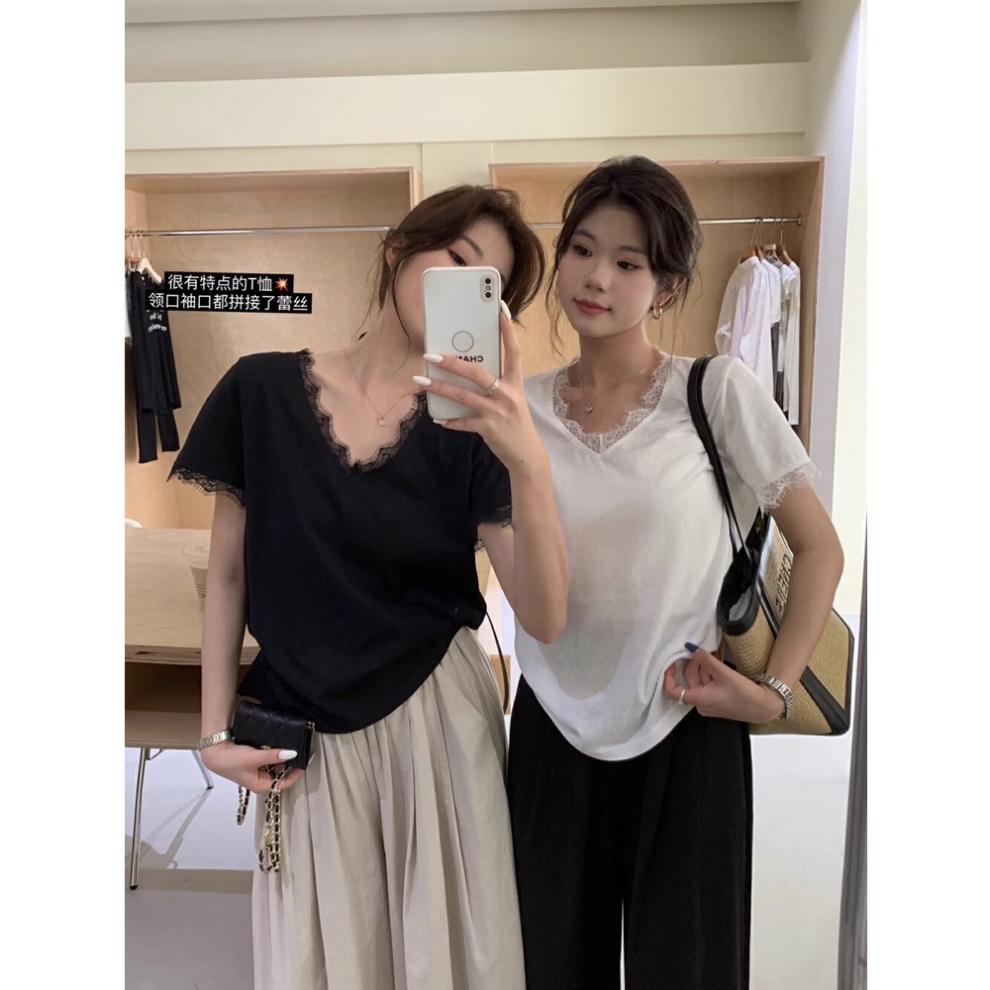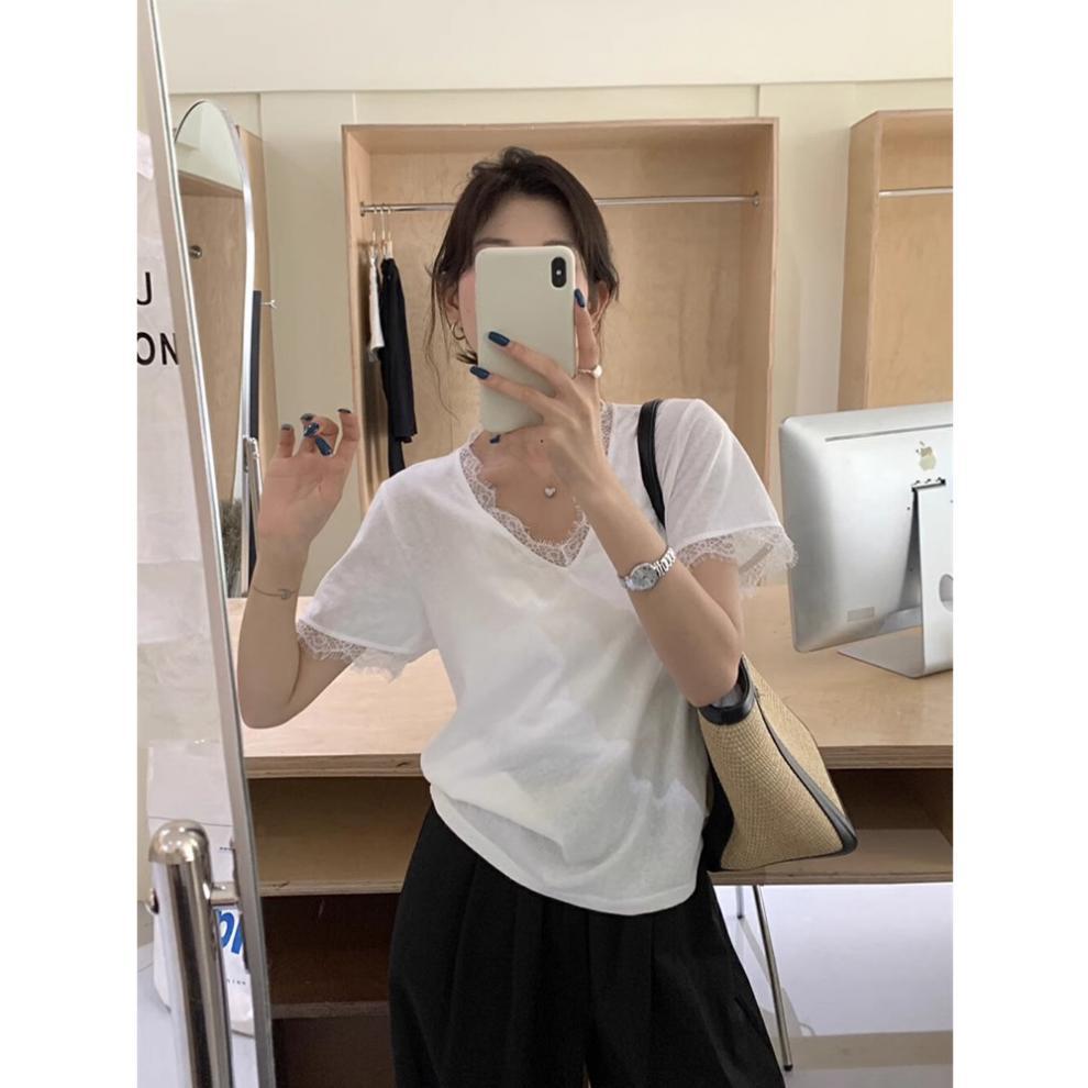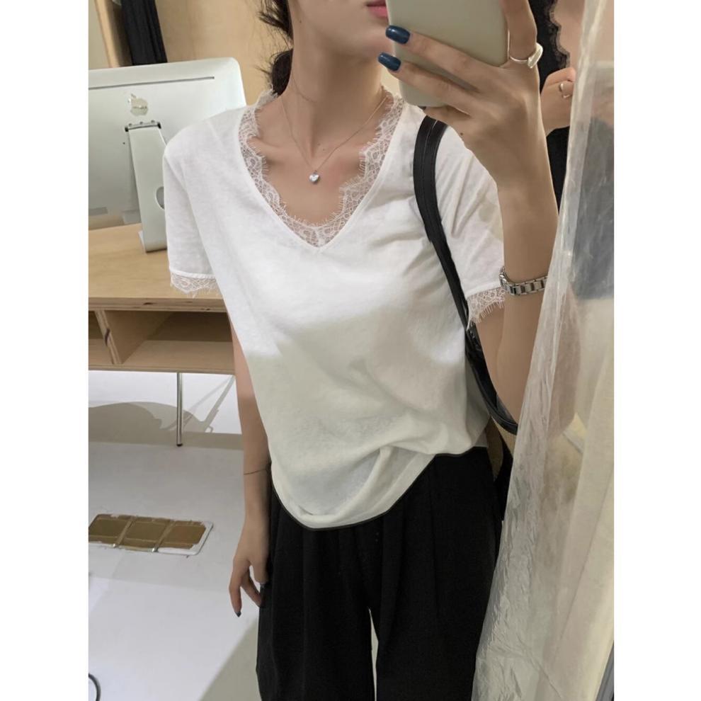 화이트 레이스 바느질 반팔 티셔츠 여성용 여름 느슨한 V 넥 어깨 탑
