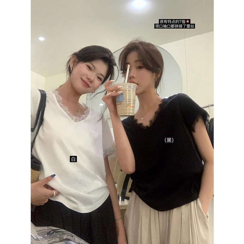 화이트 레이스 바느질 반팔 티셔츠 여성용 여름 느슨한 V 넥 어깨 탑스토어 가기