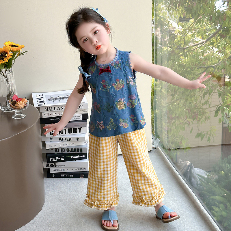아동복 2025 여름 소녀 복고풍 자수 한국식 민소매 세트 아이 투피스 세트스토어 가기