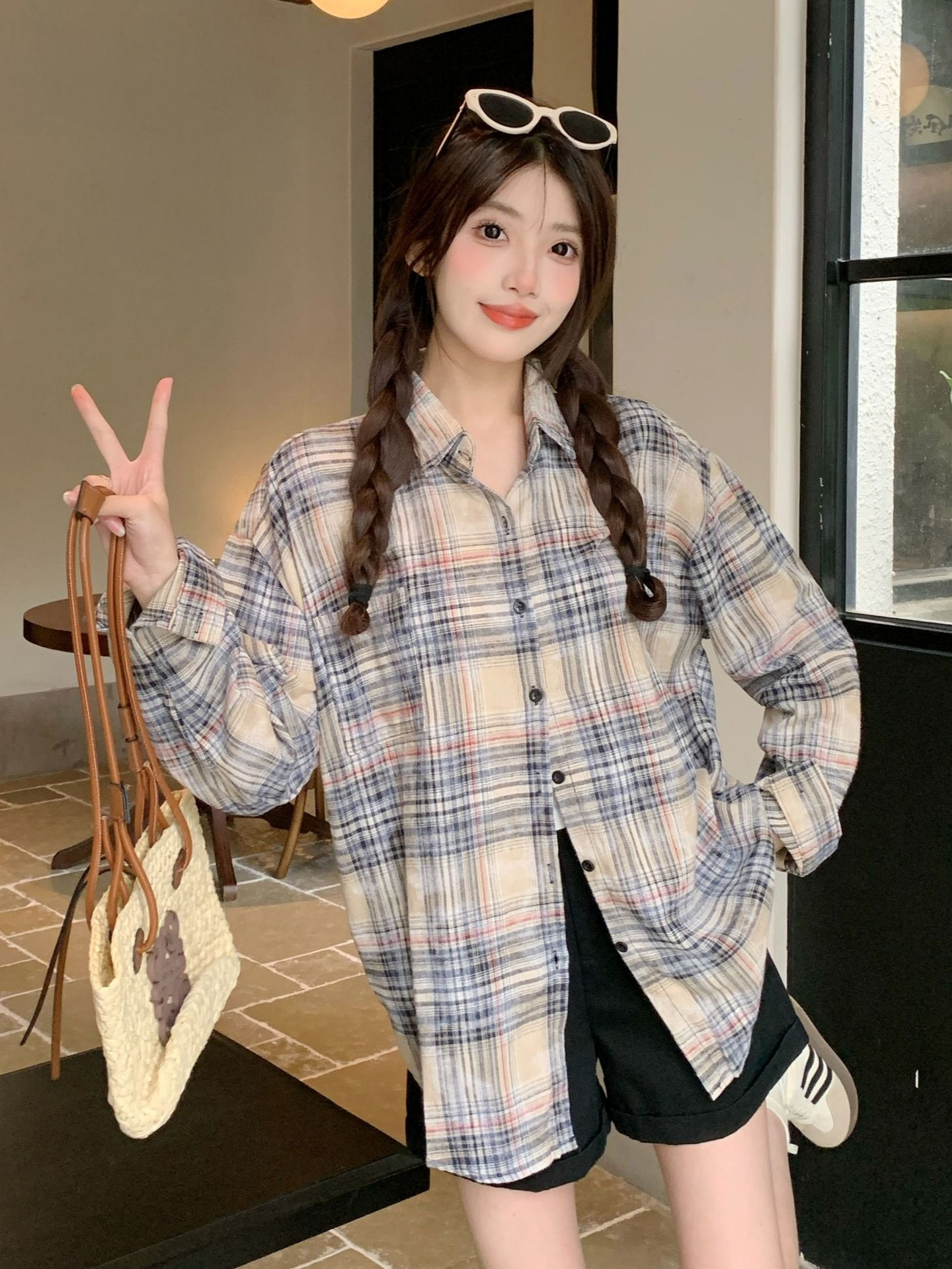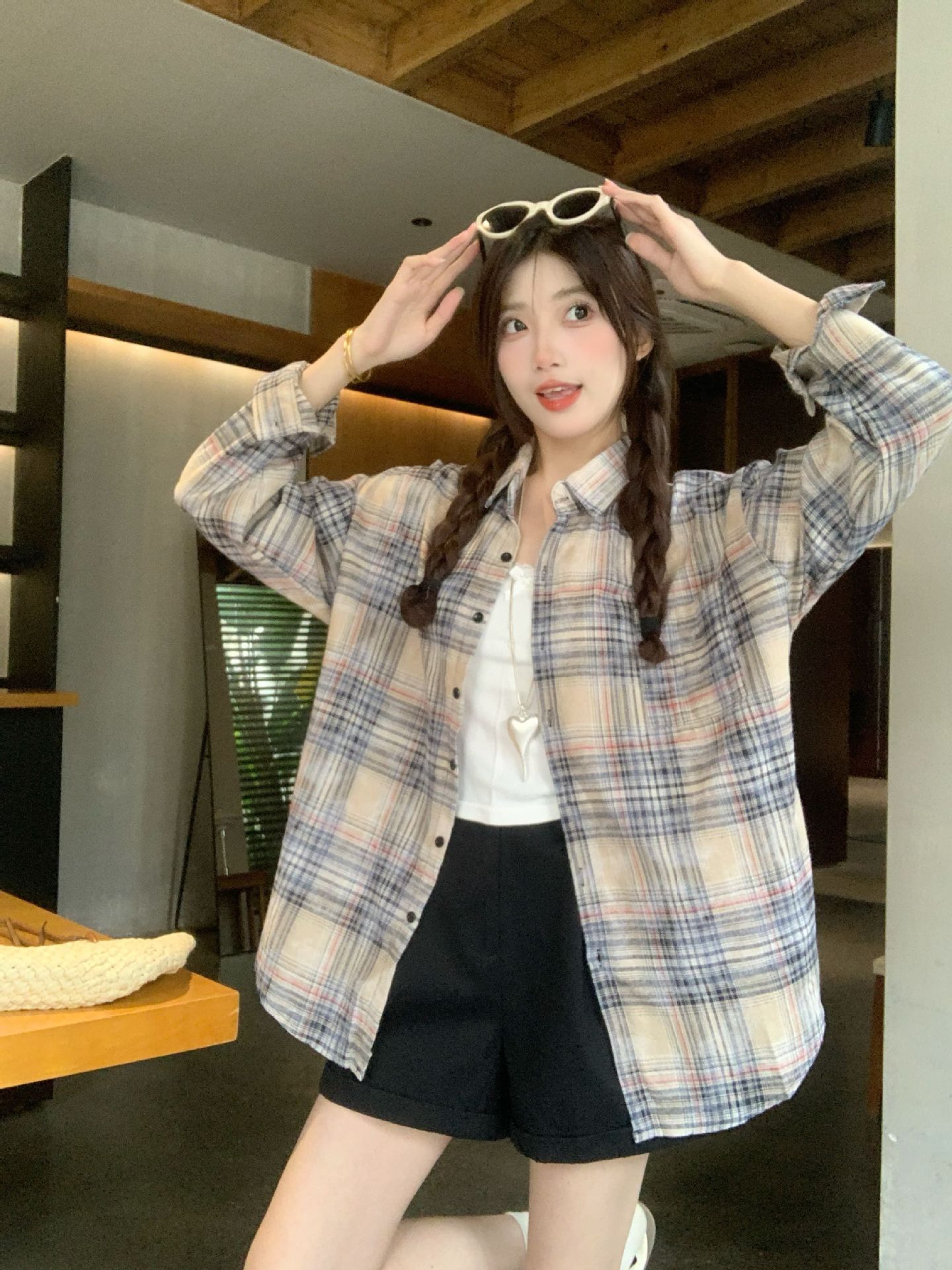 봄과 여름 아메리칸 스타일 레트로 격자 무늬 퓨어 코튼 셔츠 여성의 초가을 느슨한 올 매치 캐주얼 카디건 긴팔 셔츠 코트 트렌디스토어 가기