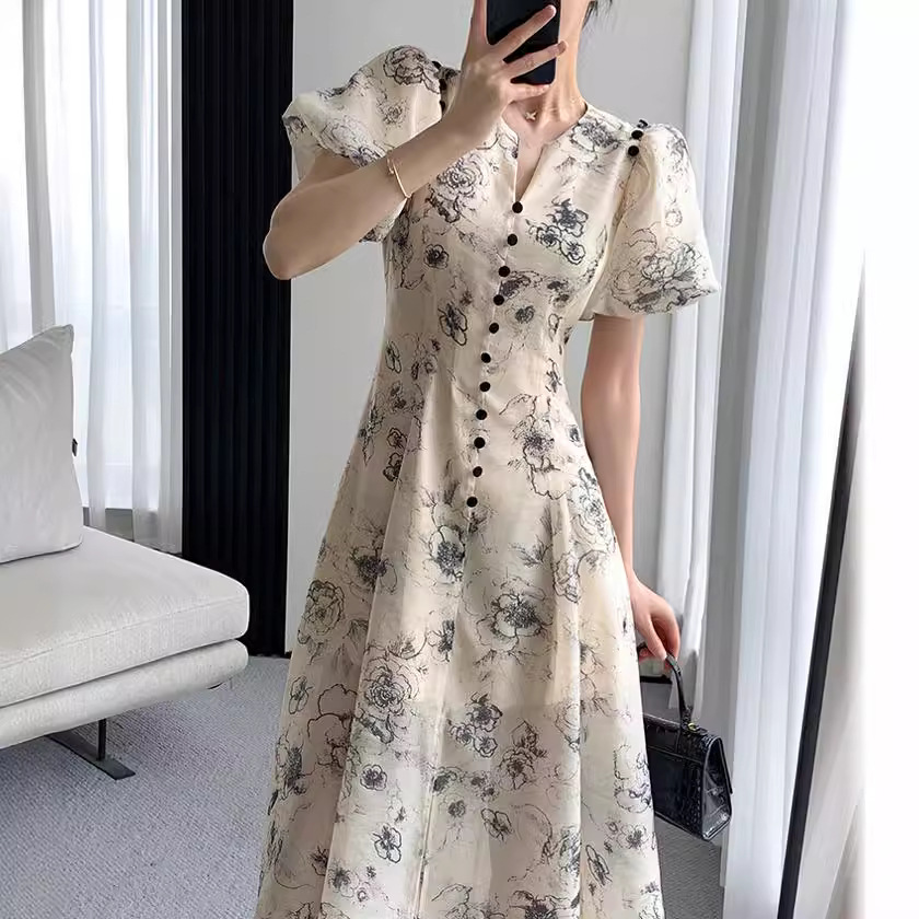 새로운 중국 스타일 꽃 원피스 여성의 2025 여름 새로운 하이 엔드 타이트 허리 레트로 젠틀 스타일 퍼프 슬리브 원피스스토어 가기