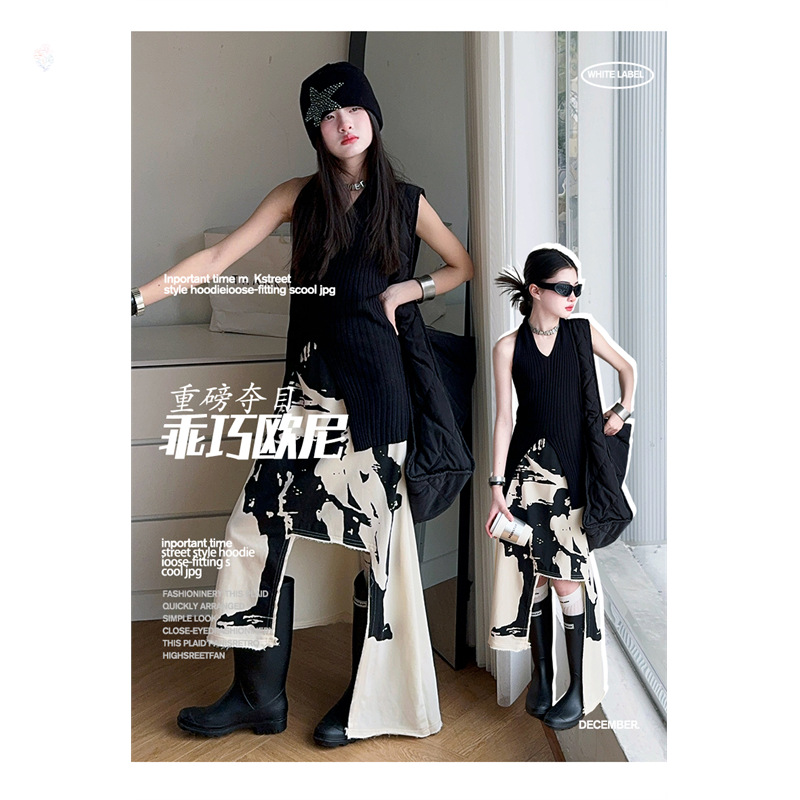 소녀 한국 스타일 세련된 분할 인쇄 치마 세트 미드 빅 어린이 세련된 민소매 티셔츠 스커트 2025 여름 뉴