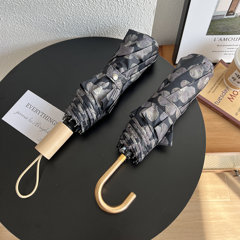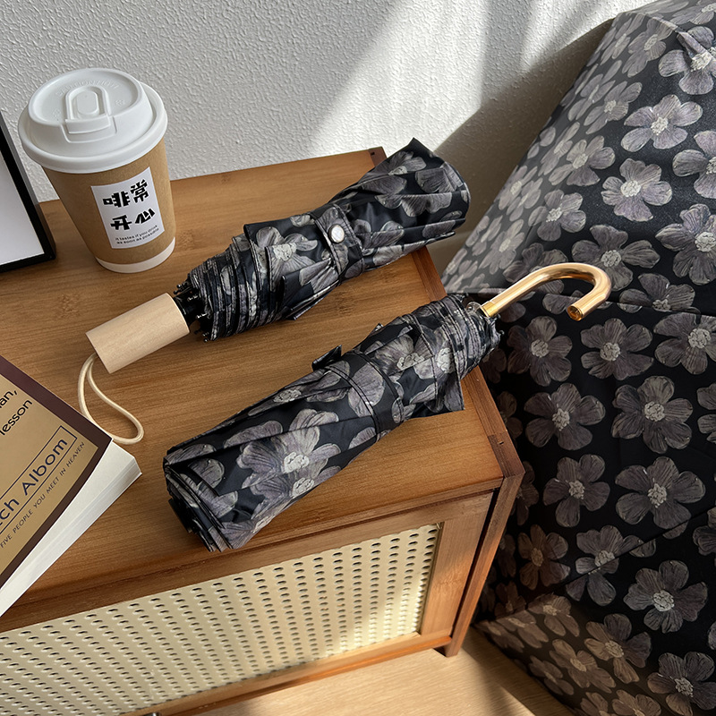 Posa 고색 가치 절제 검은 꽃 곡선 후크 선 스크린 3 배 접는 우산 여성의 맑고 비오는 우산