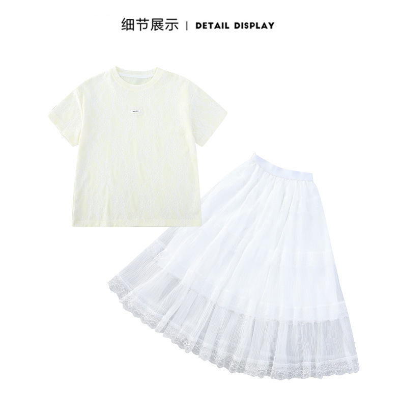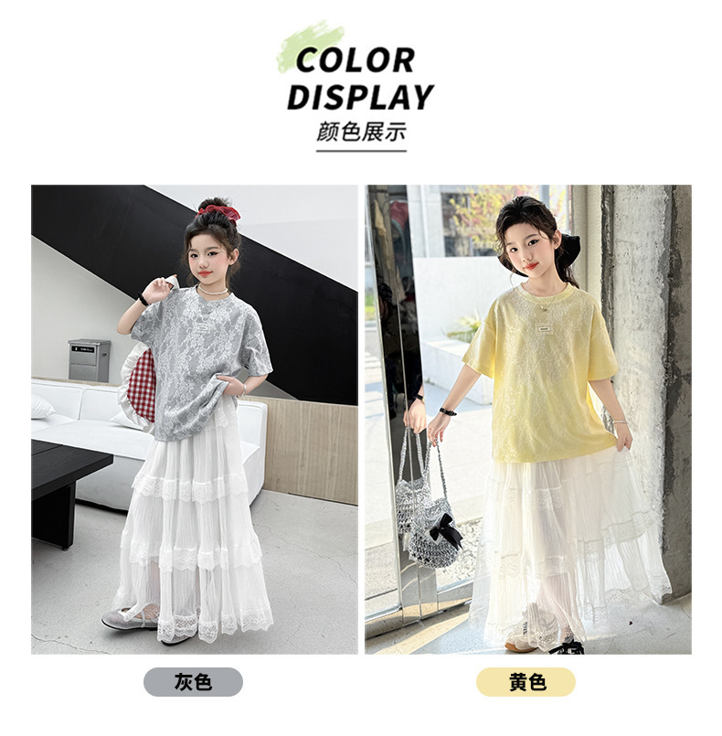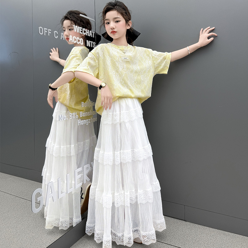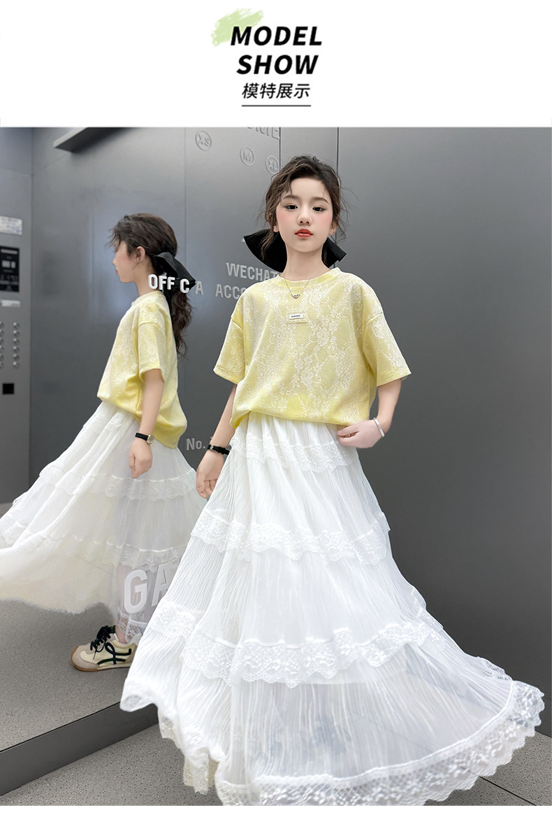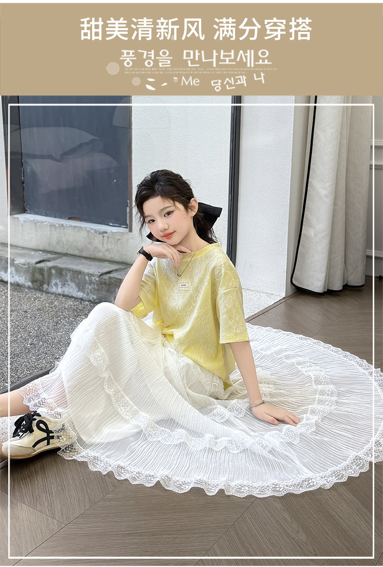 여자 여름 세트 새로운 유행 긴 원피스 서양 스타일 중 큰 아이 소녀 한국 스타일 케이크 2025 레이스 짧은 소매 패션스토어 가기