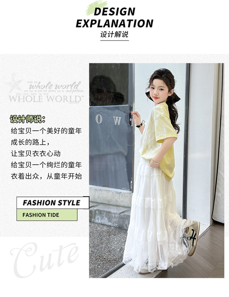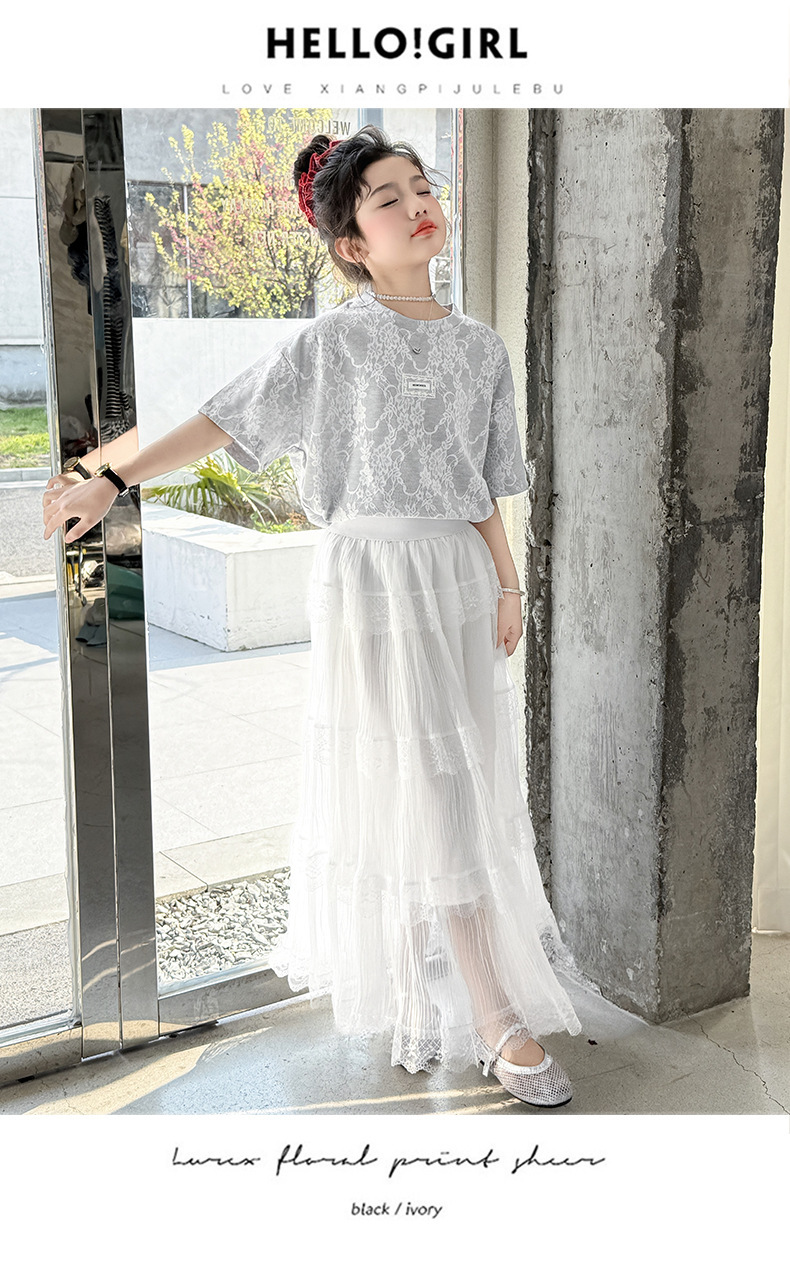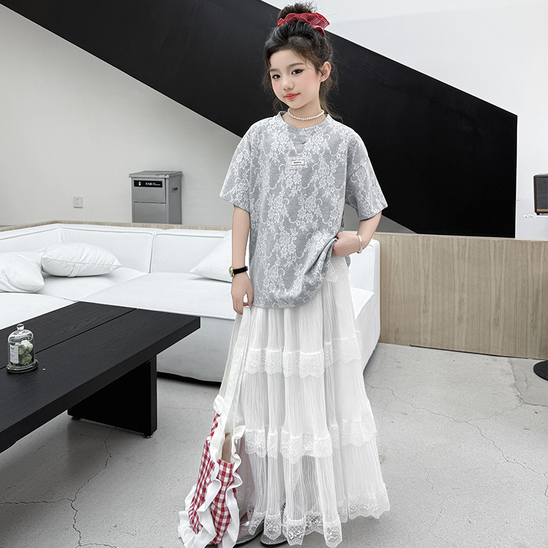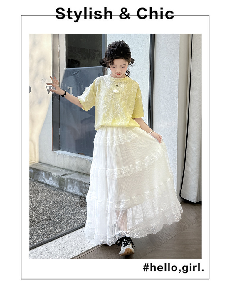 여자 여름 세트 새로운 유행 긴 원피스 서양 스타일 중 큰 아이 소녀 한국 스타일 케이크 2025 레이스 짧은 소매 패션스토어 가기