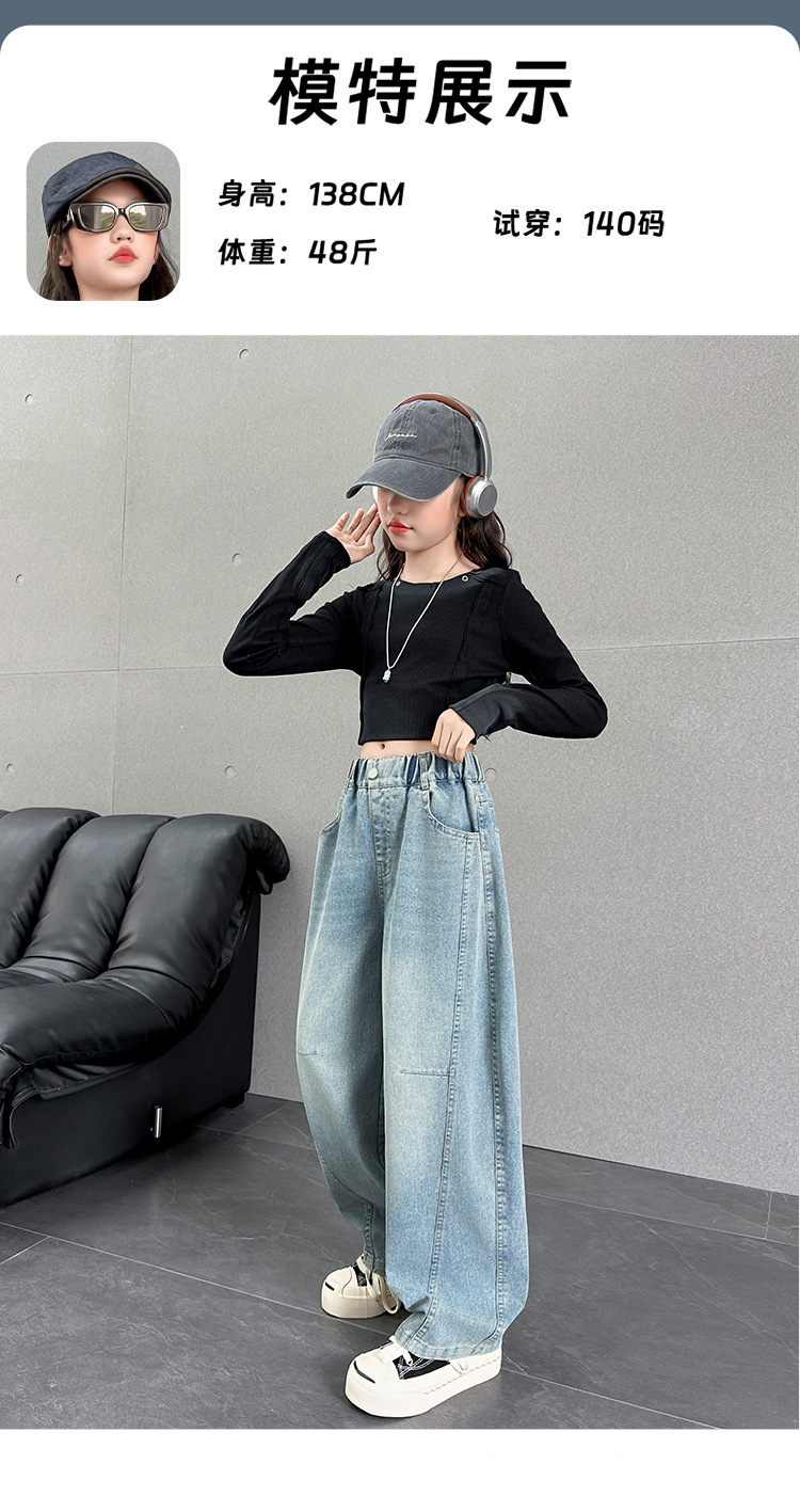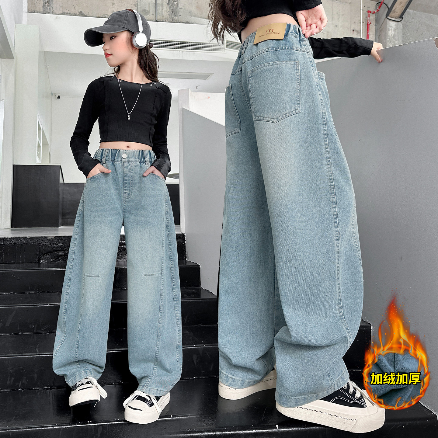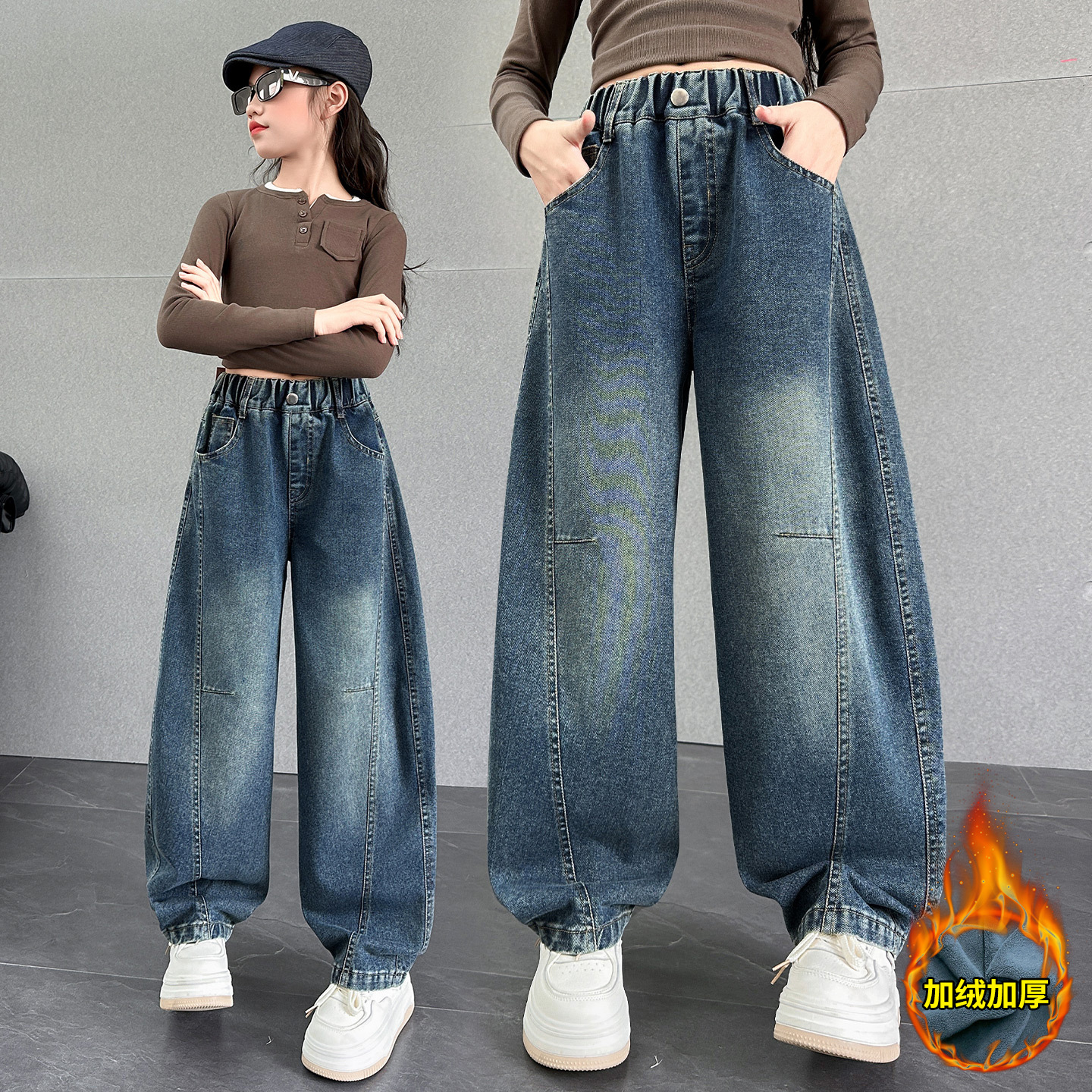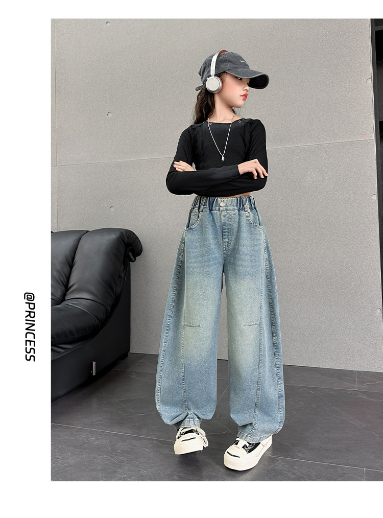 여아용 바지 가을옷 2025 신상 아동 겨울 인기 플러스벨벳 데님 중대형 아동용 루즈핏 칼모양 스트레이트 팬츠스토어 가기