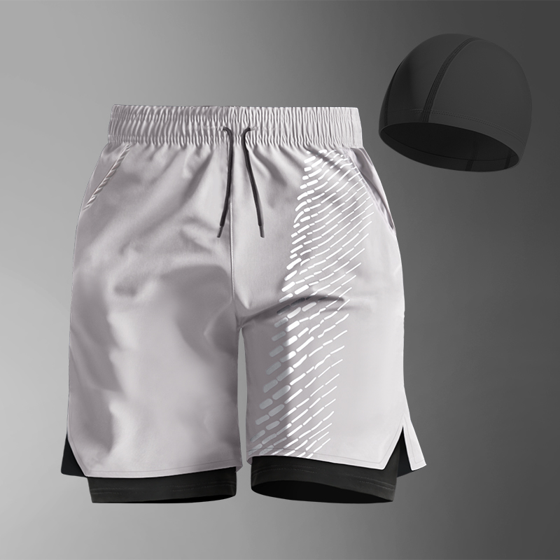 남성용 수영복 세트, 당황스러운 방지, 이중 레이어, 5부 안감, 루즈하고 속건성, 비치 장비, 남성용 수영복 및 수영 모자