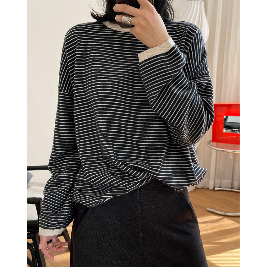 겨울 새로운 한국 스타일 게으른 복고풍 캐주얼 스트라이프 라운드 넥 스웨터 느슨한 피부 친화적 인 부드러운 니트 탑 여성용