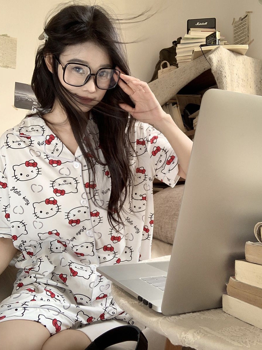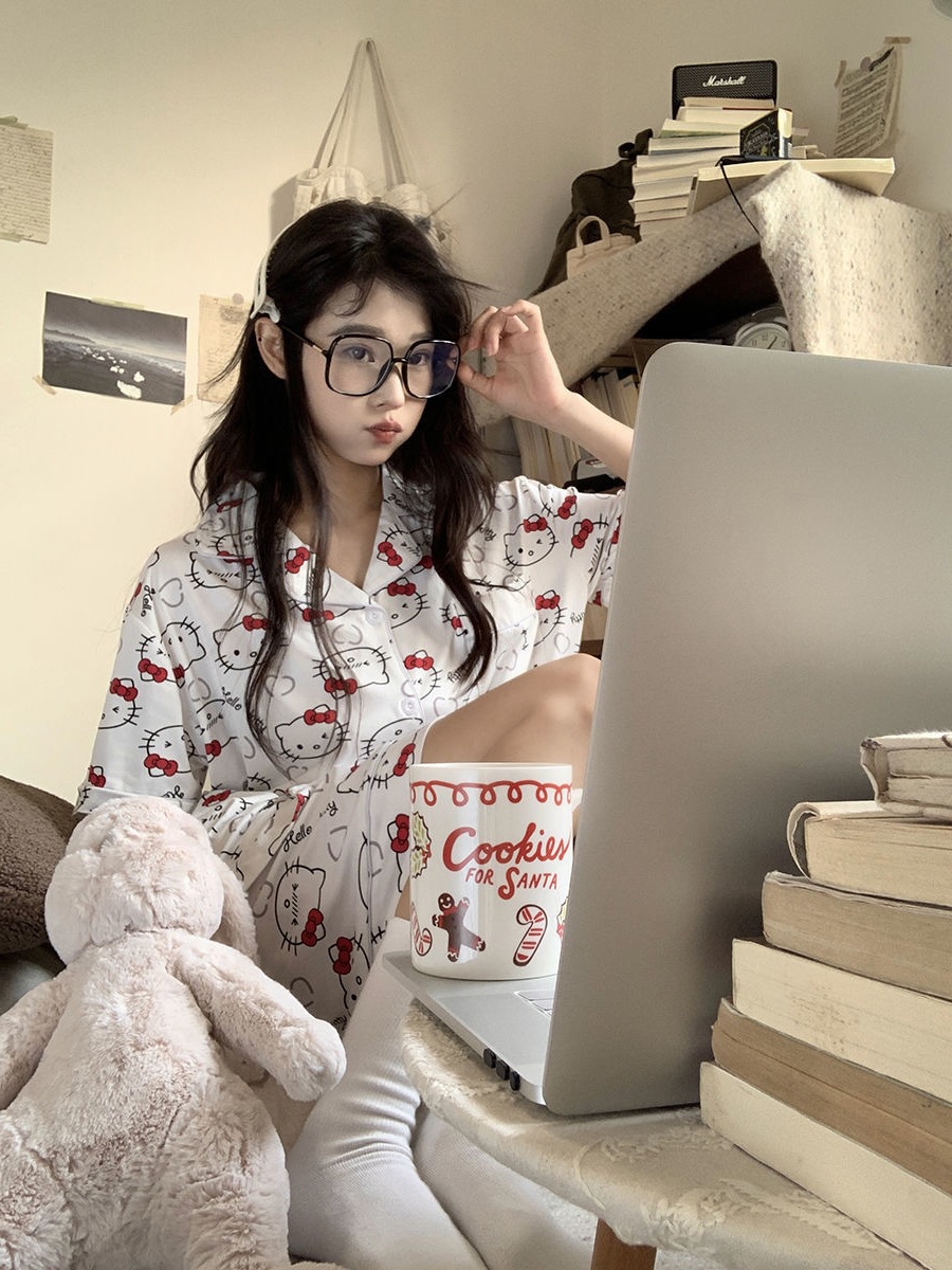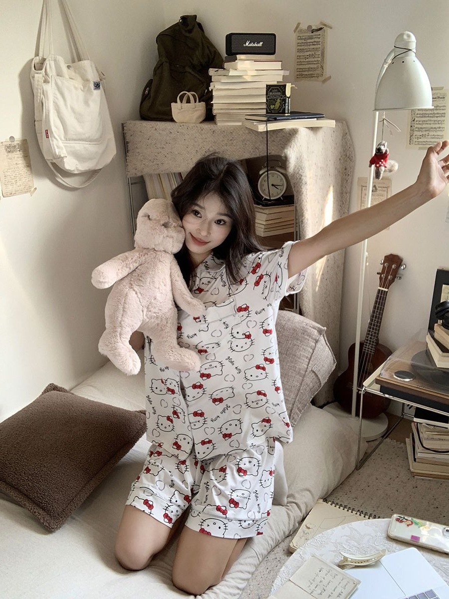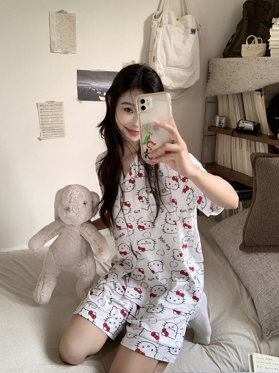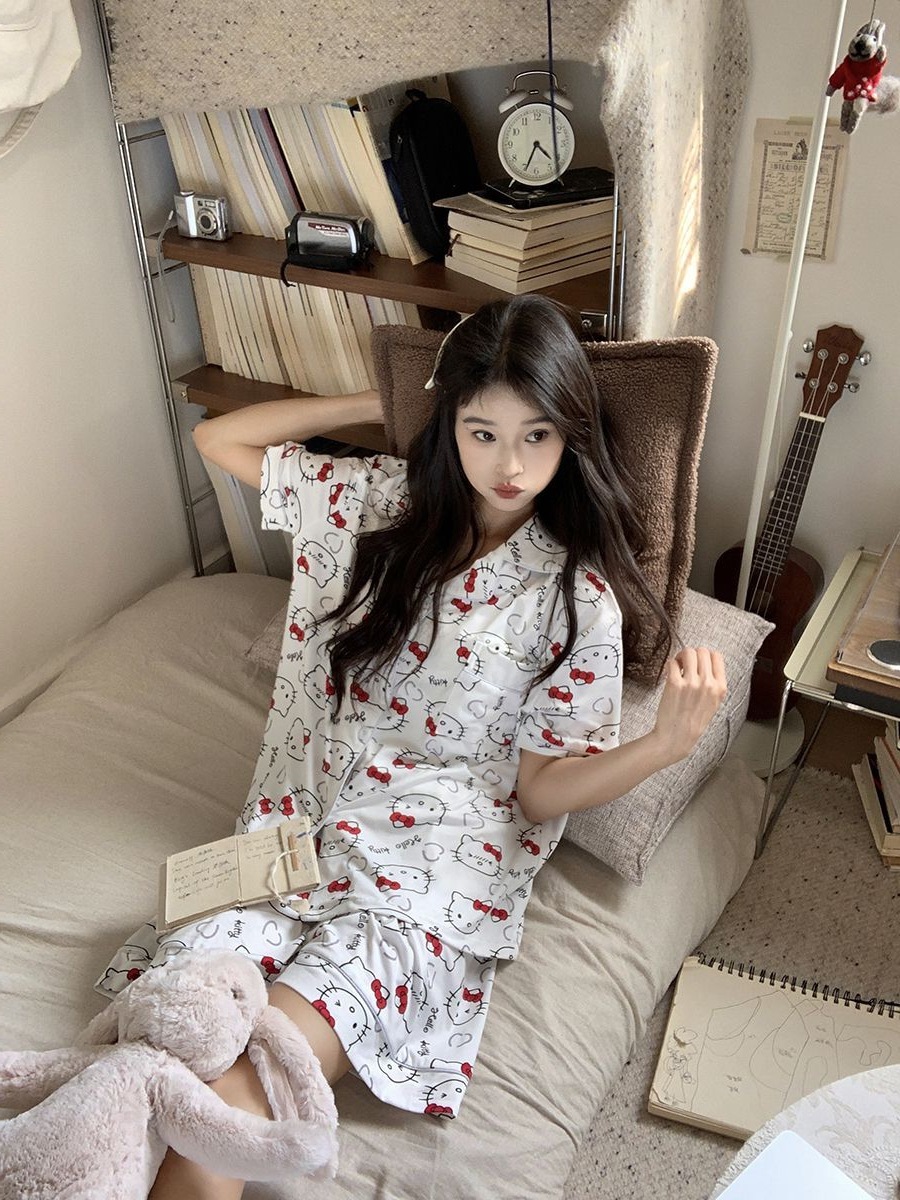 흰색 전체 인쇄 새끼 고양이 잠옷 여성의 여름 새로운 Ins 스타일 귀여운 반팔 반바지 홈 의류 세트 의류스토어 가기