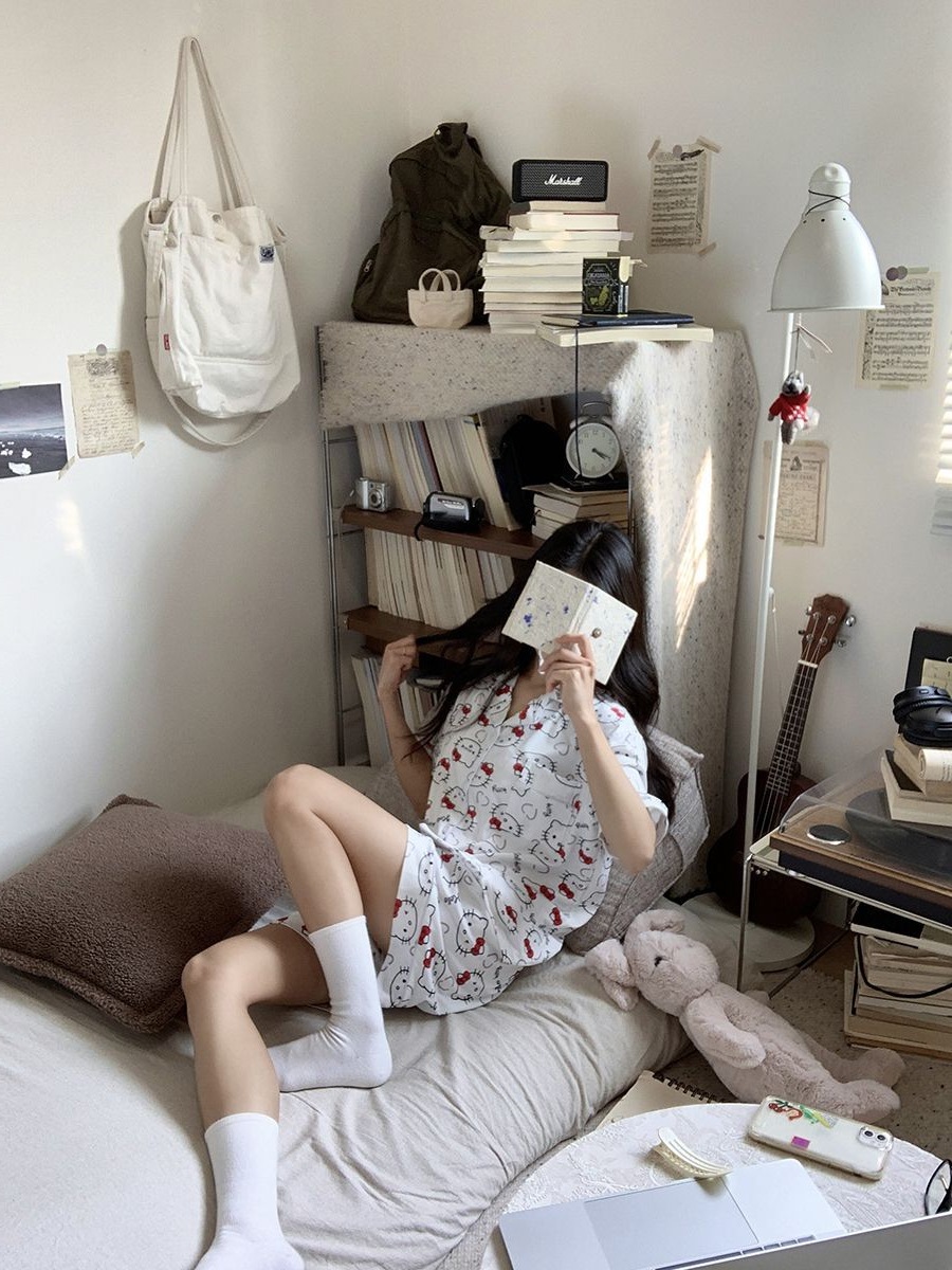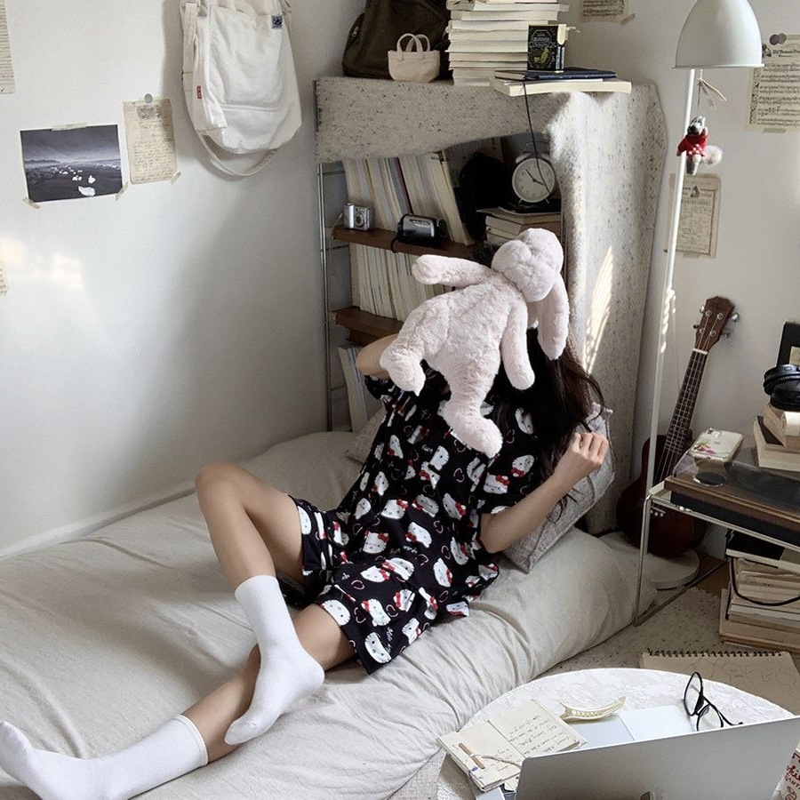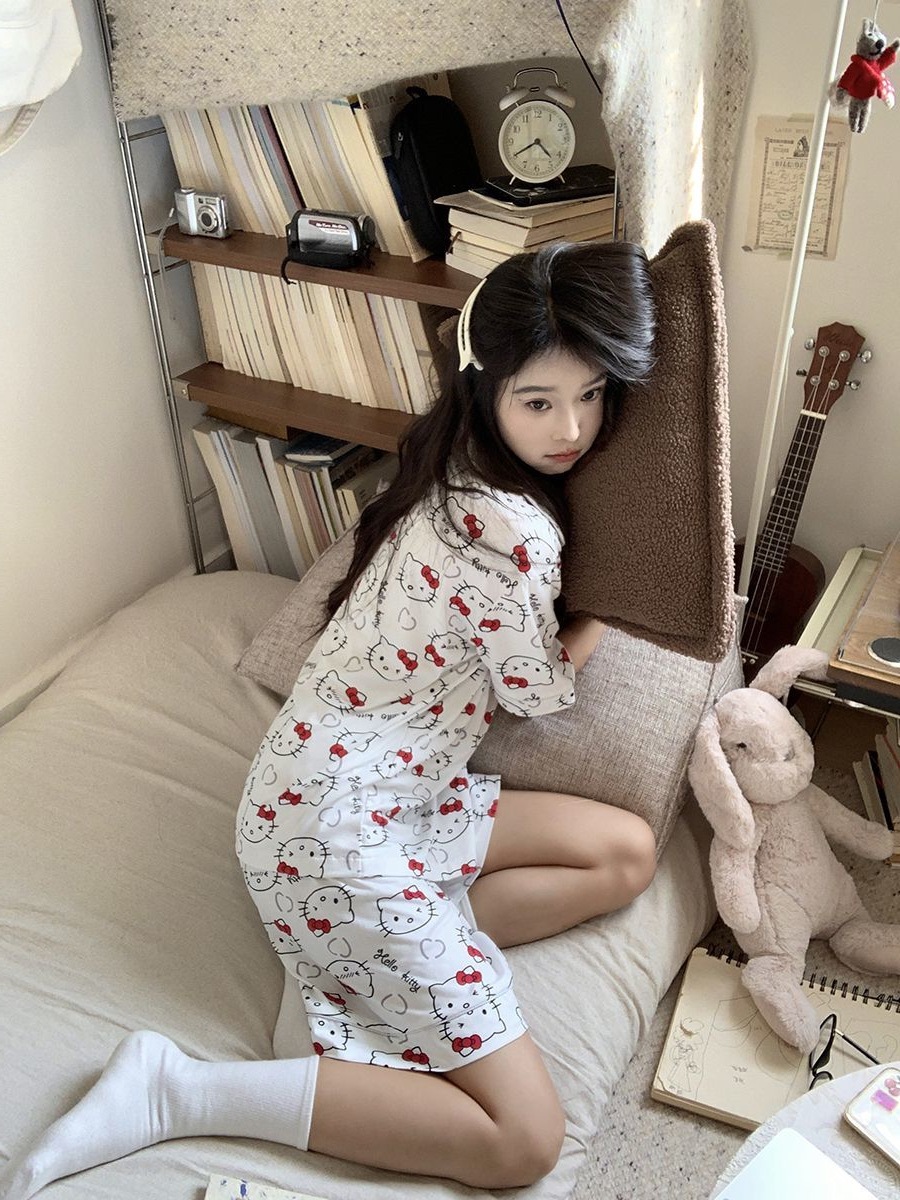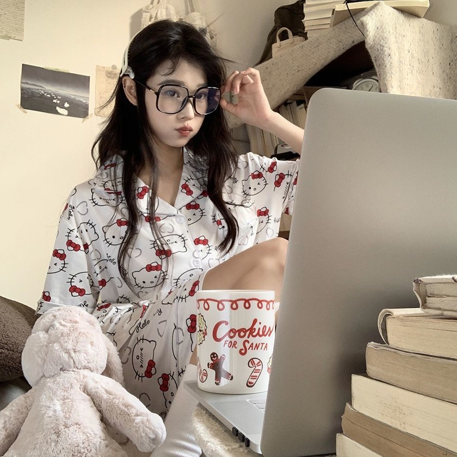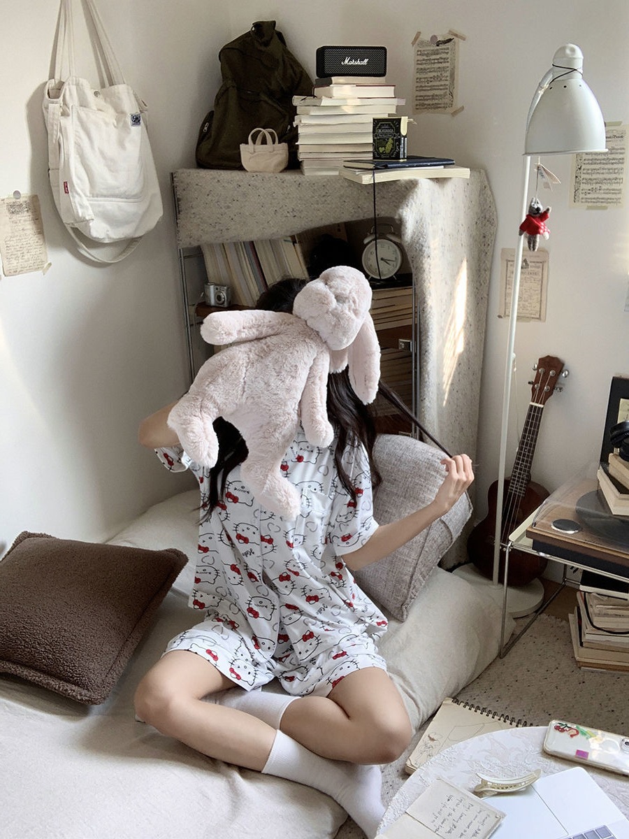 흰색 전체 인쇄 새끼 고양이 잠옷 여성의 여름 새로운 Ins 스타일 귀여운 반팔 반바지 홈 의류 세트 의류스토어 가기