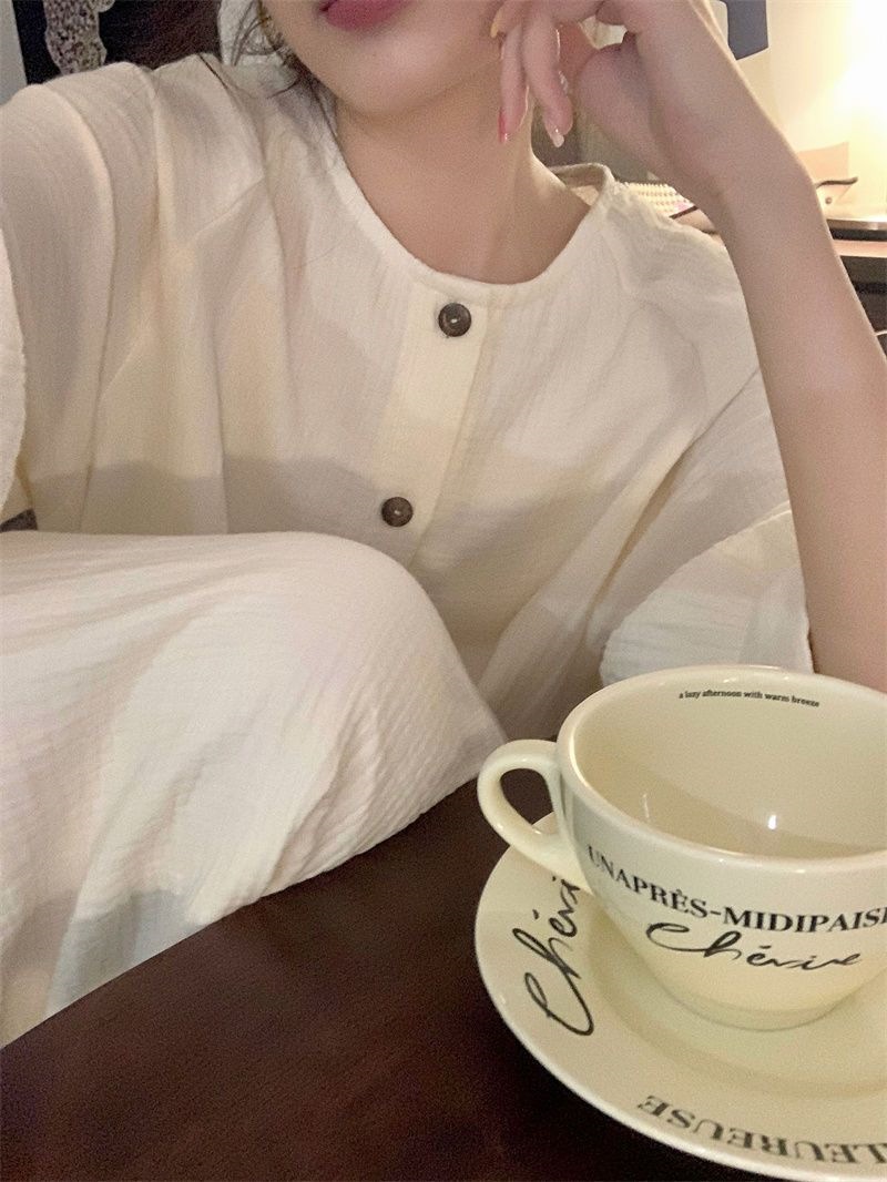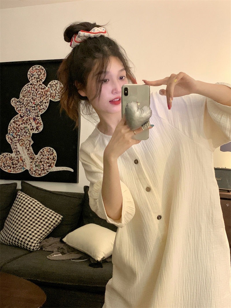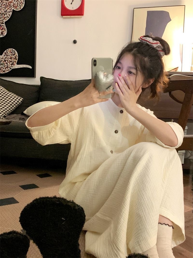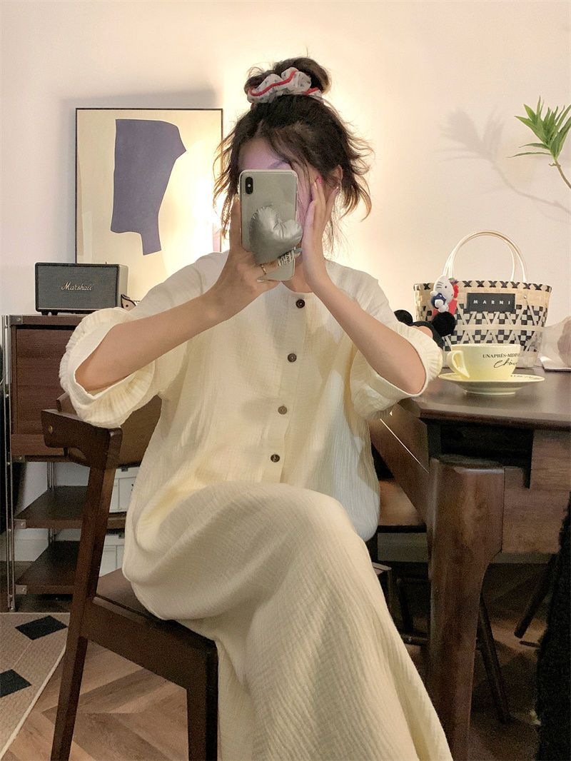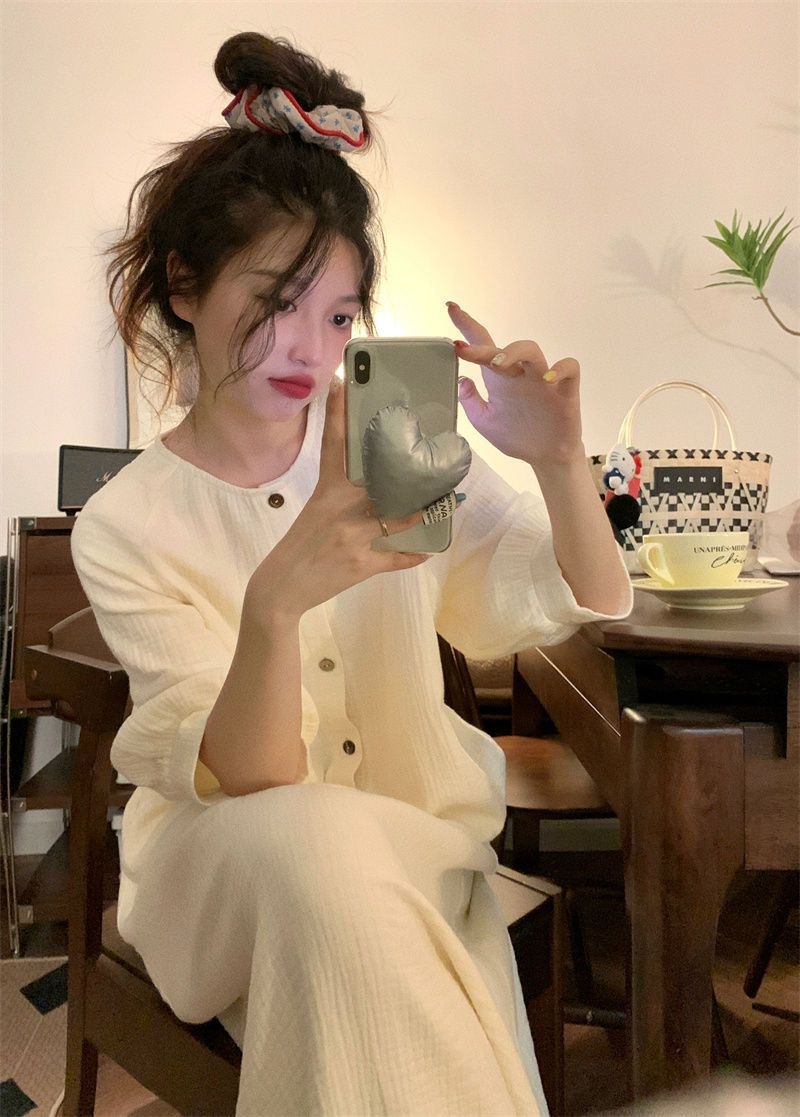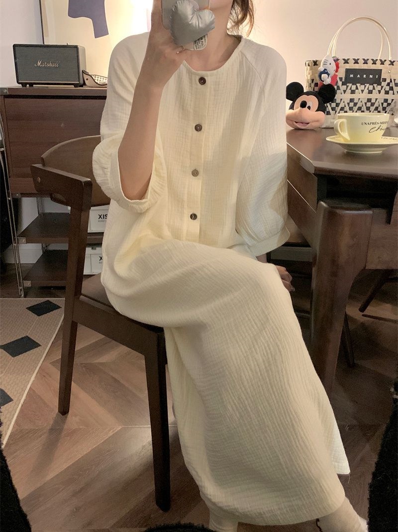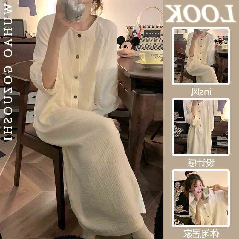 간단한 단색 긴 소매 잠옷 여성의 봄과 가을 잠옷 새로운 한국 스타일 하이 엔드 감각 학생 원피스 홈 의류 외부 착용스토어 가기